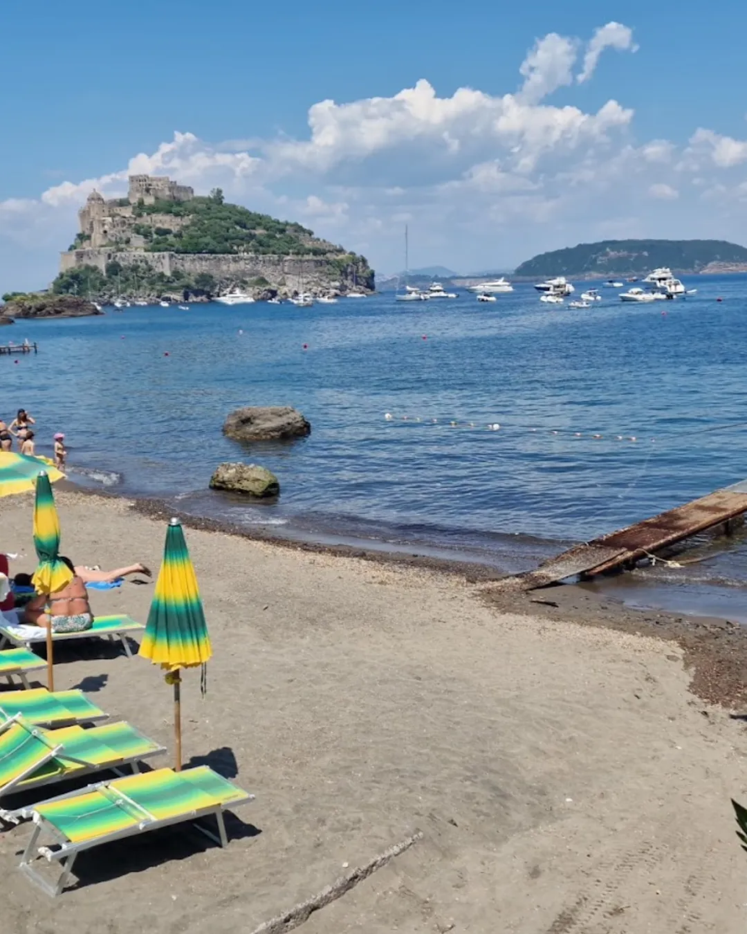Tucked away with a breathtaking view of the Aragonese Castle, Cartaromana is a special little cove worth the effort to find. It’s a bit of a journey to get here, involving a winding road and a fair few steep steps, but you’re rewarded with a quieter spot away from the main crowds. The sun dips behind the cliffs in the mid-afternoon, so come early to soak up the rays and enjoy the warm, clear water, heated by natural thermal springs right by the shore.