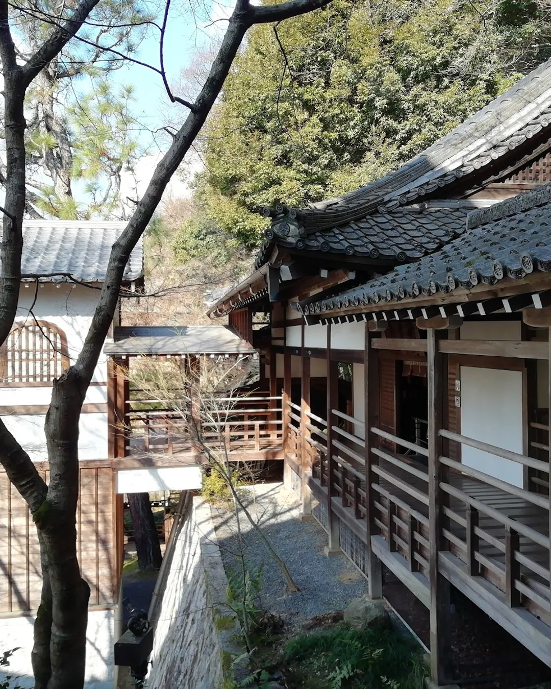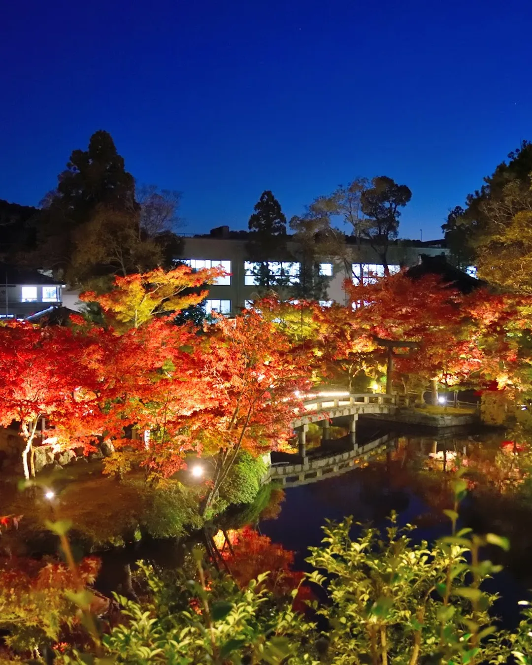 You step through the gate and the city noise dissolves into water and wood. A pond—Garyū-chi—holds reflections of vermilion bridges and maples, and wooden corridors stitch together halls like a boardwalk through color. Inside the Amida-dō, the celebrated Mikaeri Amida looks back over his shoulder; even if you don’t know the story, the posture feels startlingly alive, as if the Buddha has just turned to acknowledge you. The route leads on through bright eaves, screen paintings, and small gardens until stairs climb into quiet cedar—keep going and the tahōtō pagoda appears, a compact jewel with a balcony view over rooftops to the Higashiyama hills. In mid–late November, the precinct glows—crimson, amber, and gold by day; in the evening, special illumination turns the pond and bridges into a lantern-lit theater. Off-peak seasons are gentler: spring greens lace the water, summer is cicadas and shade, and winter trims the scene to clean lines and temple bells.