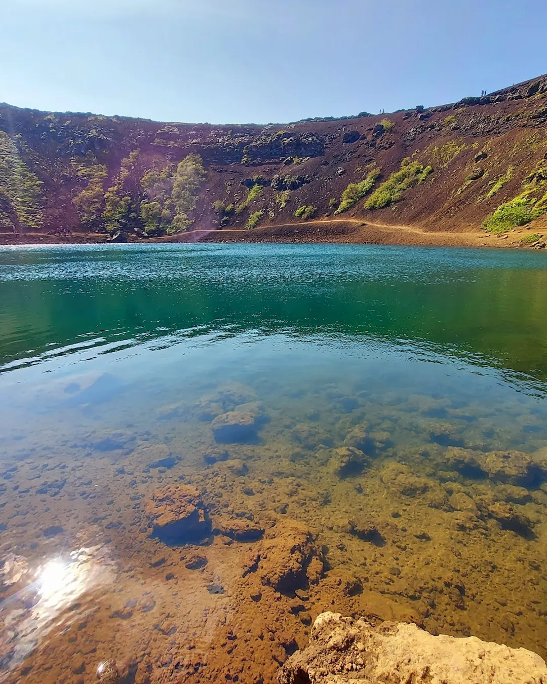 Kerið Crater is a striking volcanic crater located in Iceland’s Golden Circle region, famous for its vibrant red volcanic rock walls and turquoise lake at the bottom. The crater is roughly 55 meters deep, 170 meters wide, and 270 meters across, making it an impressive geological formation to explore. Visitors can take a short walk around the rim, which offers panoramic views of the surrounding landscape, or descend to the lake for a closer look. The rim walk typically takes 20–30 minutes and is accessible to most visitors, though sturdy shoes are recommended if descending. Entry costs approximately 400 ISK per adult, and the site is especially photogenic at sunrise or sunset, when the warm light highlights the rich colors of the volcanic rocks.