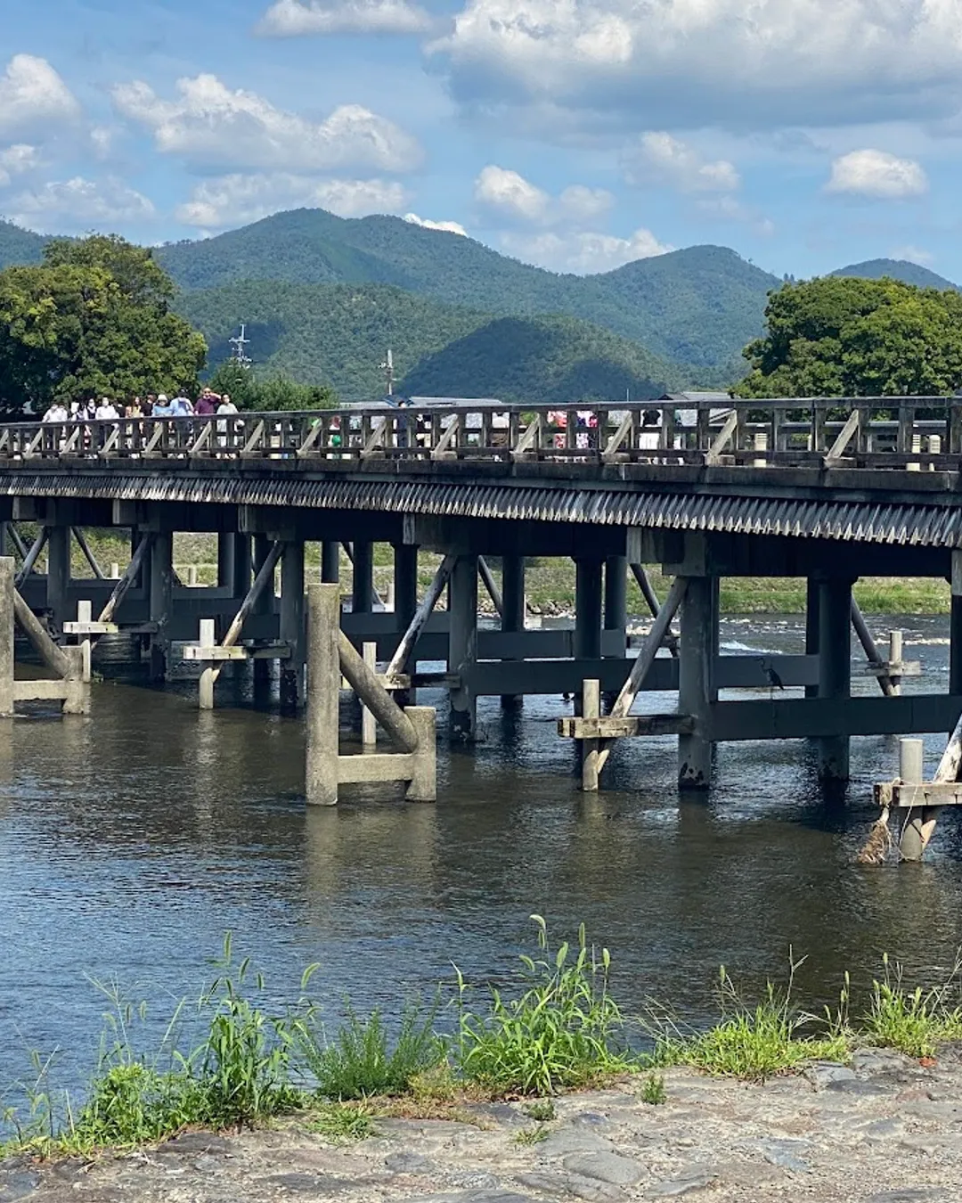 Pont emblématique d’Arashiyama traversant la rivière Katsura, avec les montagnes en toile de fond. Construit à l’origine à l’époque Heian et reconstruit en bois et béton en 1934. Très prisé pour les photos, les balades au coucher du soleil, et l’observation des feuilles d’érable ou des cerisiers selon la saison. La berge en contrebas est un spot apprécié pour se poser et admirer le paysage.