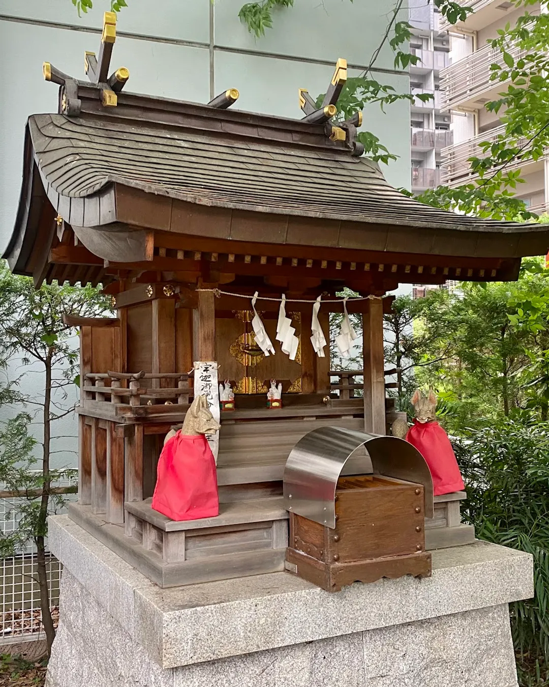 Minuscule sanctuaire shintō enclavé entre des immeubles à Nishi-Shinjuku. Dédié à la divinité Inari, il comporte un torii et un autel simple. Lieu de prière discret pour les habitants, sans office ni personnel présent sur place. Typique des micro-sanctuaires urbains de Tokyo.