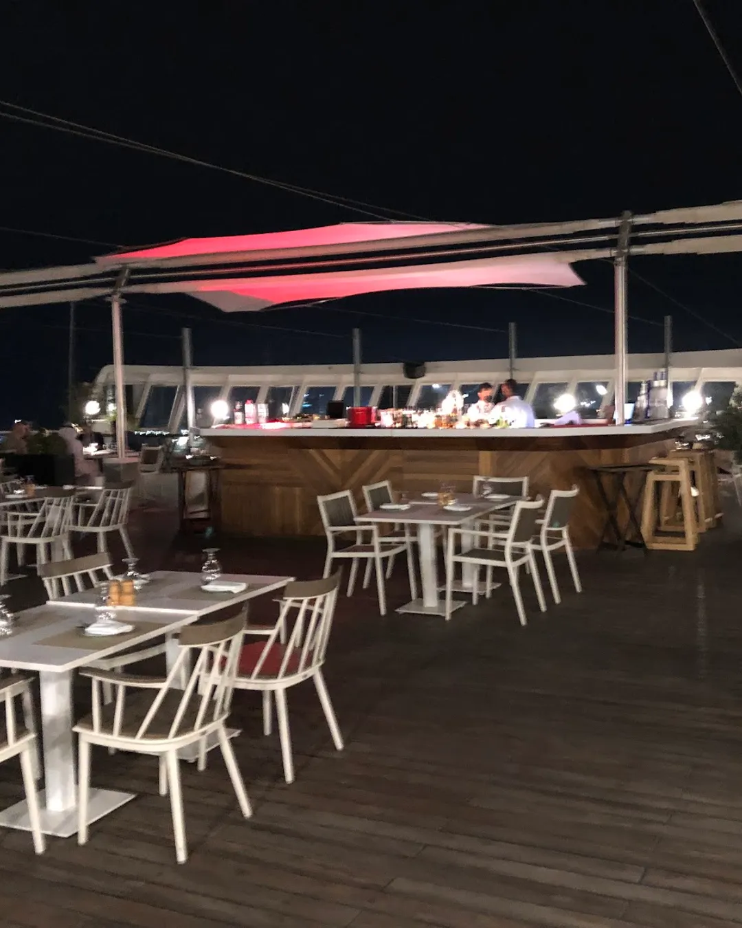 Step aboard the legendary Queen Elizabeth 2 and find your way to The Pavilion, a stunning outdoor lounge on the lower aft deck. Here, you can unwind under the stars with incredible views of the Mina Rashid Yacht Club and the glittering Dubai skyline. It's the perfect spot to enjoy Mediterranean-inspired bites and drinks in a truly unique setting that was once the ship's swimming pool.