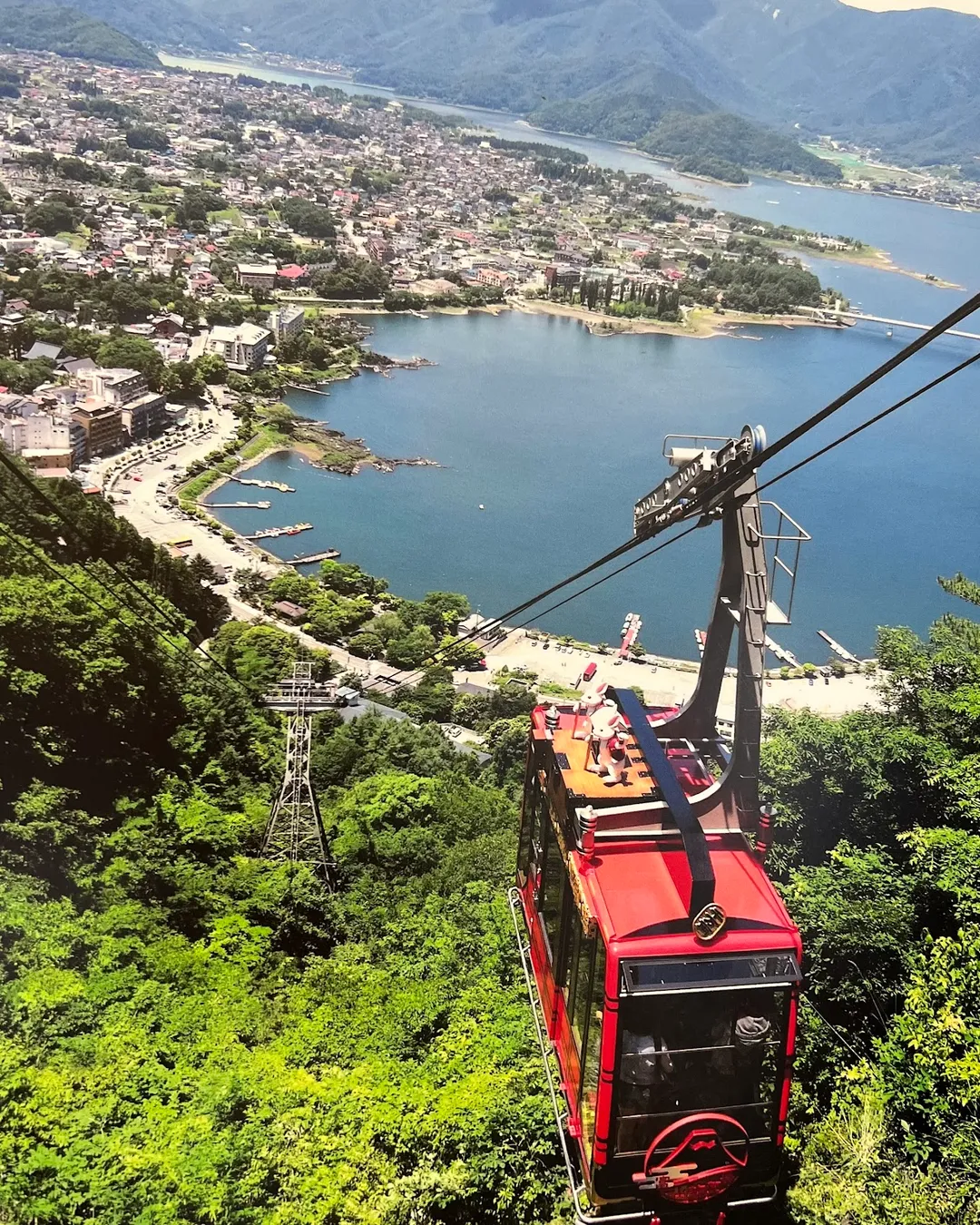 An aerial lift that takes visitors from the shores of Lake Kawaguchiko to an observation deck, offering panoramic views of Mt. Fuji and the lake. At the top, there is a bell for good luck and a shrine.