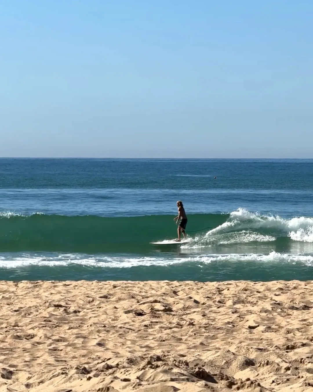 Stretching 1km long with golden sand, it's backed by a wide grassy reserve and low headlands, offering reliable surf from most directions (average waves 1-1.5m) but with limited wind protection.