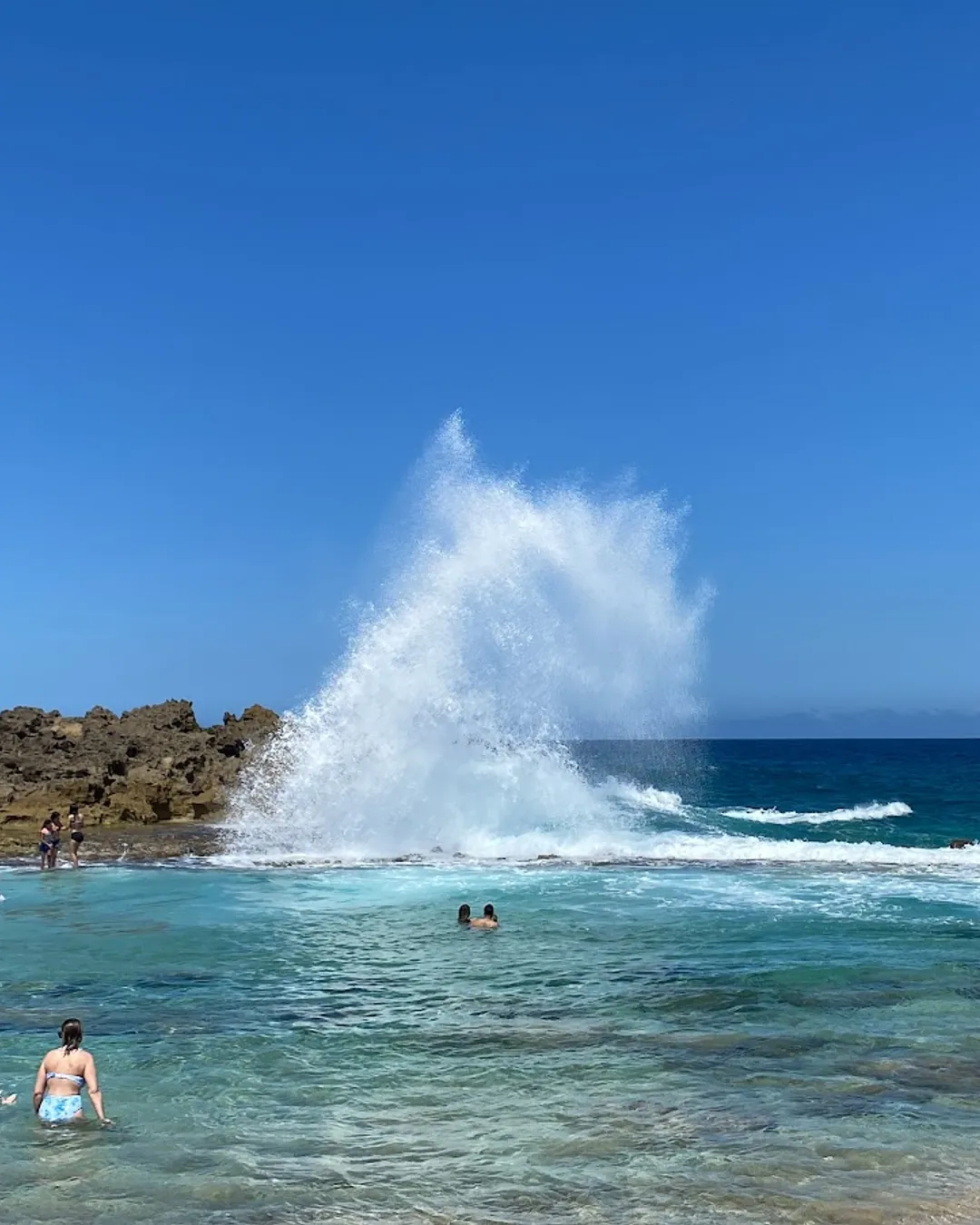 The rocky barrier slows the waves, creating a sheltered “pool” where many people enjoy sitting in the water, especially on calm days. When the swell is bigger, waves crash dramatically over the rocks, spraying water inside the pool and creating a natural wave pool which is super fun to play in!