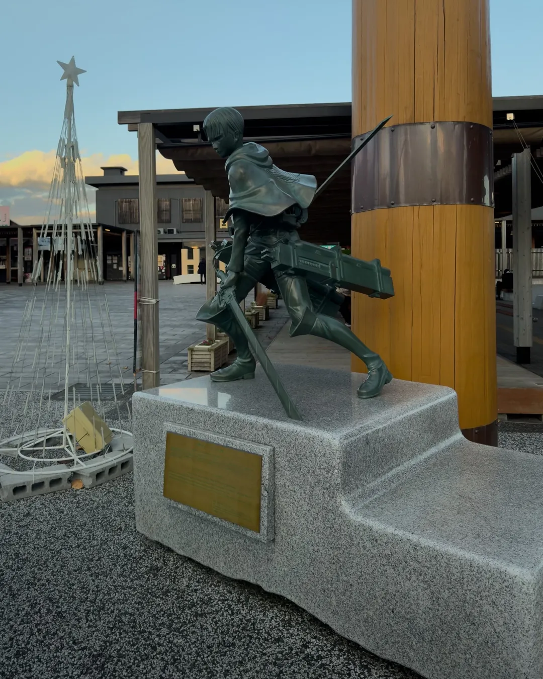 Located at the Hita station, you will find a green Captain Levi statue. Levi was so loved by many during the manga that they made a statue to honor him.