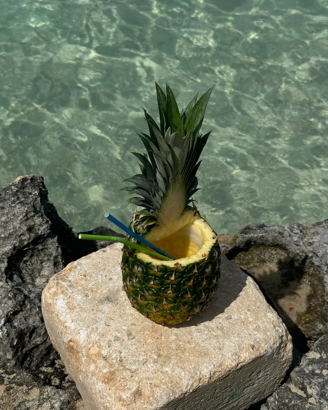 It’s a popular spot, so an early arrival is recommended to claim your space on the surrounding rocks. A pineapple filled with a cocktail costs around 10€, with refills for about 5€, and deck chairs are available for roughly 15–20€ per day. The lagoon becomes especially crowded around midday, so visiting earlier in the morning offers a much more relaxed experience.