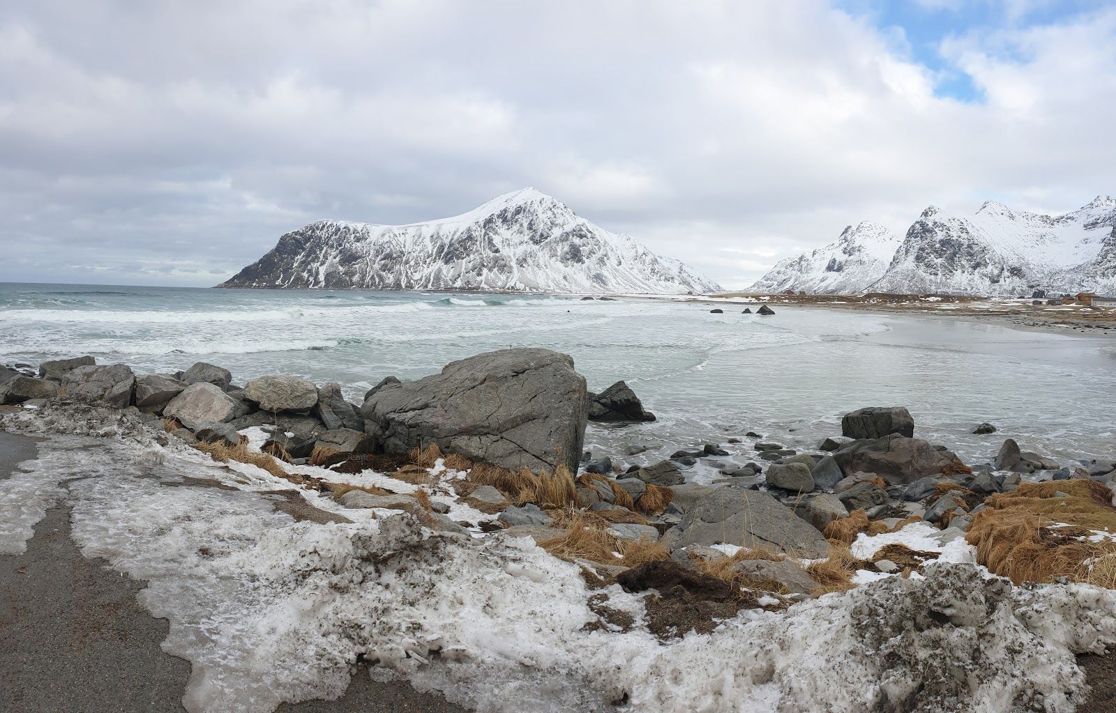 Skagsanden Beach, located right alongside the E10 highway, is one of the most accessible and beautiful beaches in the Lofoten Islands. Its expansive sandy shores invite visitors to stop for a scenic walk or a photography session. The beach is a favorite among surfers, and you’ll often spot them skillfully riding the Arctic waves, no matter the season. For those who want to dive deeper into the surf culture, the nearby campground and surf school provide a perfect base to enjoy this surf haven near Flakstad.