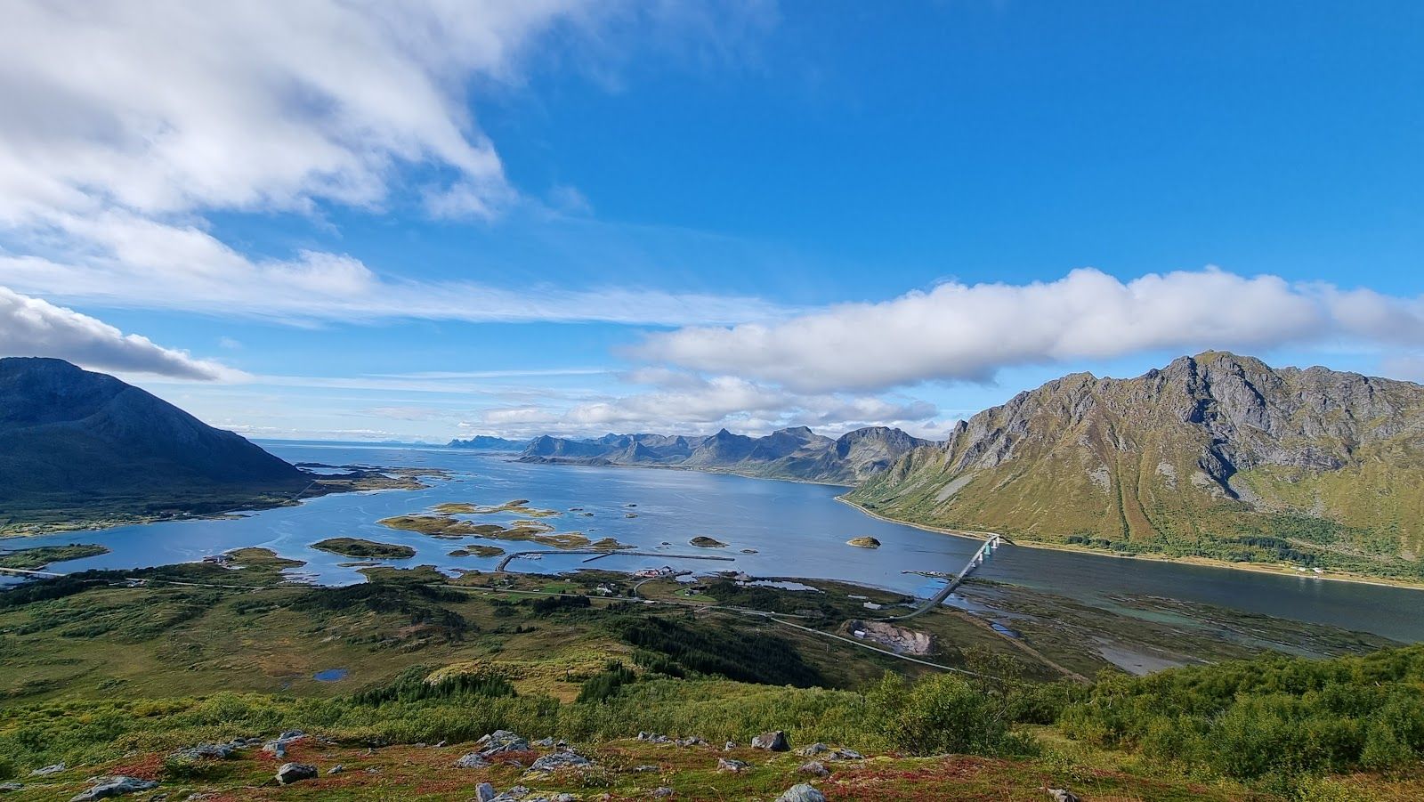 Route: From the parking area, follow the road north towards Brenna. After passing a cattle grid, you’ll see a path branching off to the right, leading eastwards away from the road. Follow this path uphill through a steep section to reach a ridge. Climb through the small forest and approach the western flank of Kleppstadheia.The climb becomes steeper as the trail winds through light shrubbery, which gradually gives way to heather as you ascend. The view back towards the Gimsøystraumen strait, with its small islands and the rugged peaks of Vestvågøy, is stunning. Once on the summit you should enjoy the panoramic view.