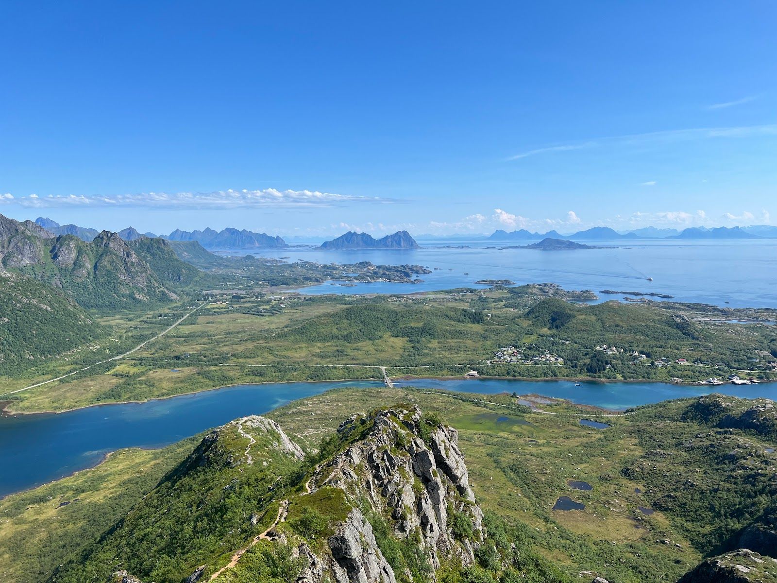 Route: The trail starts as a broad, easy path that gradually transitions into steeper, more rugged terrain. While the trail is not consistently marked, it remains easy to follow, particularly for those accustomed to navigating uneven and rocky trails. A major highlight of the hike is the stunning view of the surrounding peaks, Kabelvåg, and nearby islands. Glomtinden offers an incredible panoramic perspective that becomes increasingly rewarding as you ascend. The final 200 meters of elevation to the summit are the most demanding. These sections include steeper grades, rocky and slippery areas (especially in wet conditions), and narrow climbs that require careful footing. Despite the challenge, the summit rewards every effort.