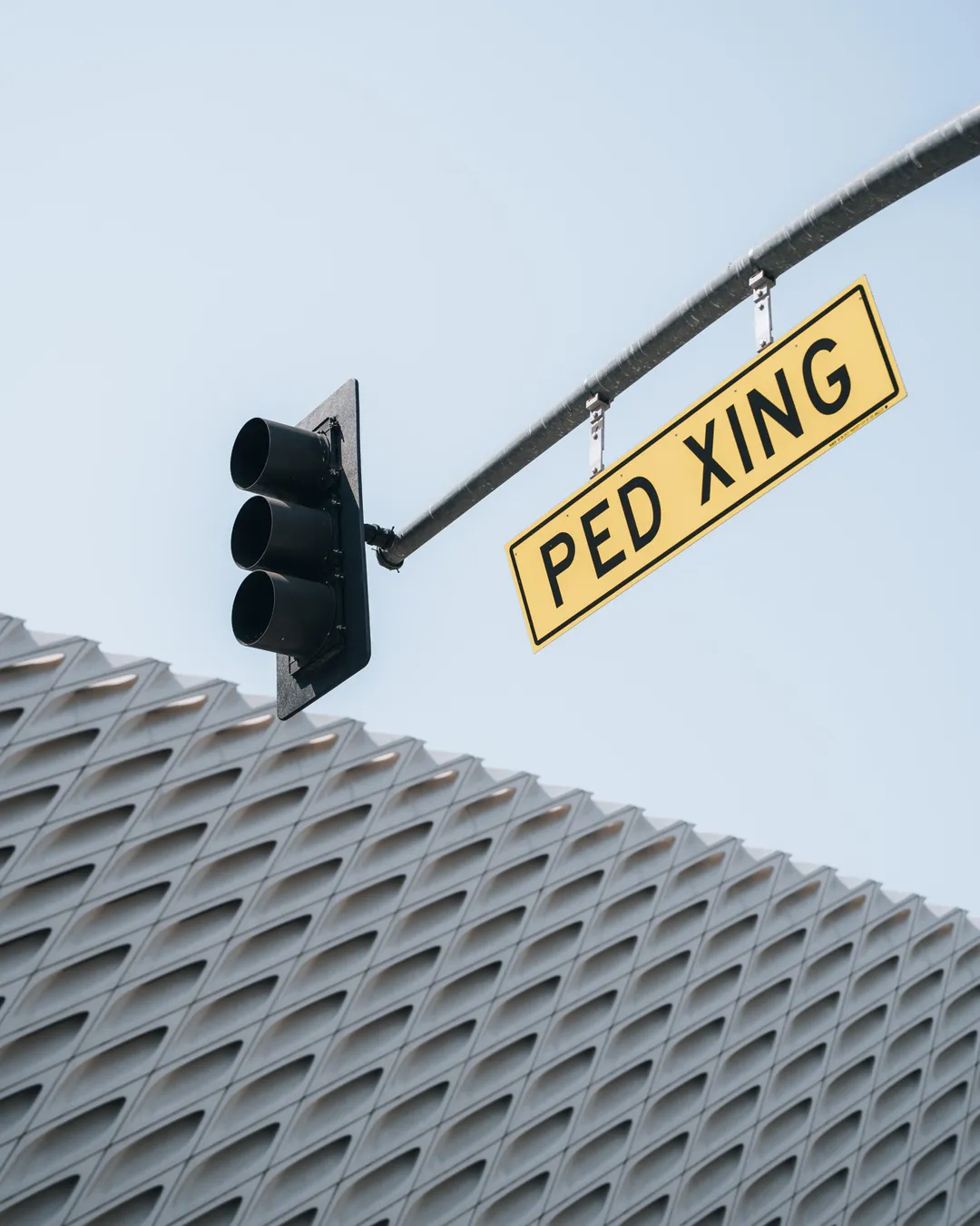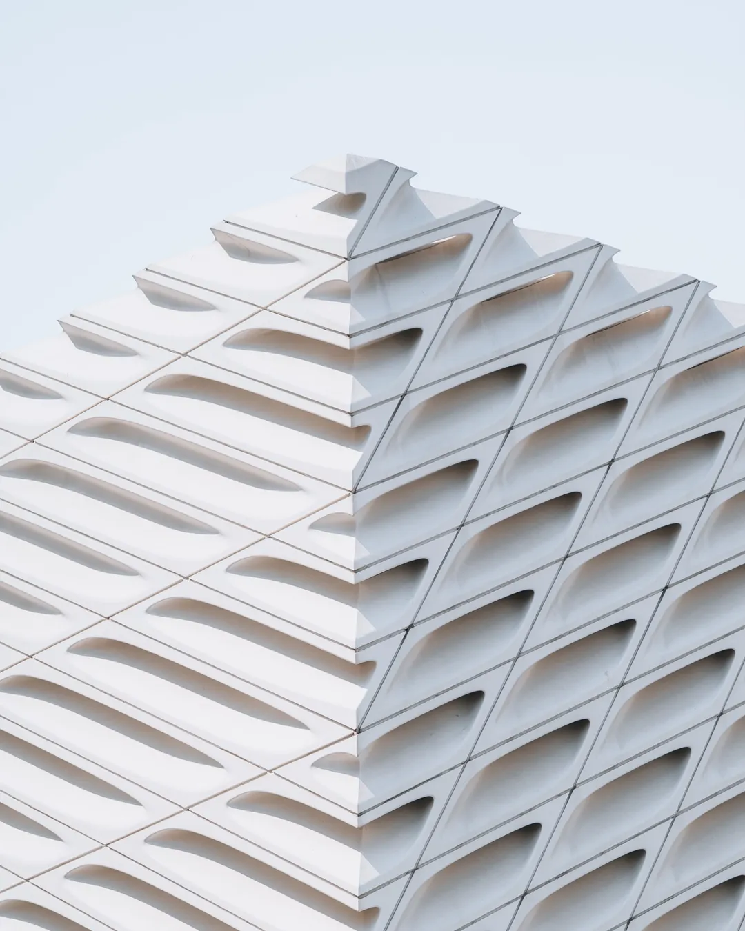 The Broad’s white, honeycomb-like façade makes it one of LA’s most eye-catching architectural landmarks. Its clean geometry and soft grey tones work especially well in morning or midday light, when subtle shadows bring out the building’s depth and structure.