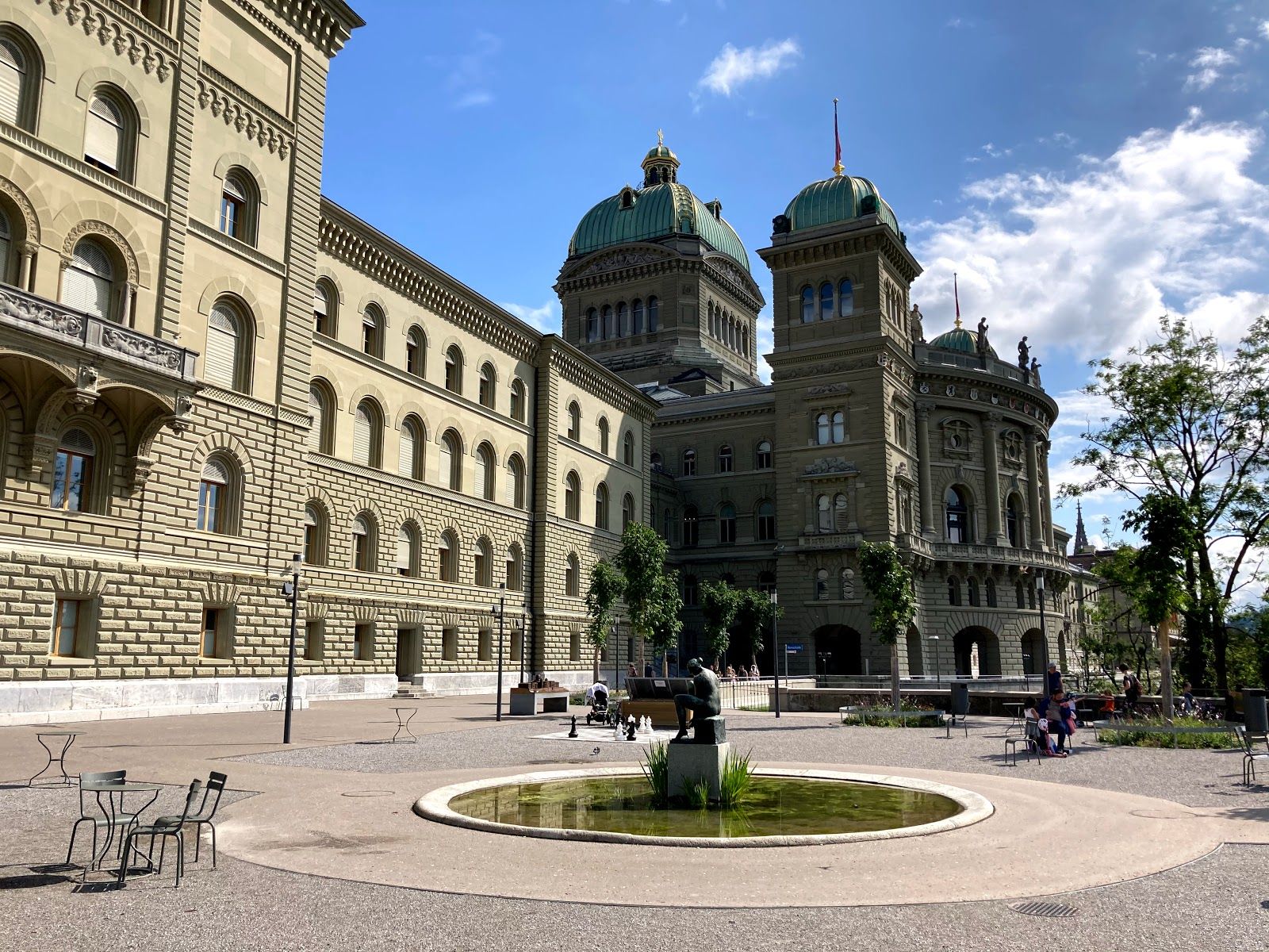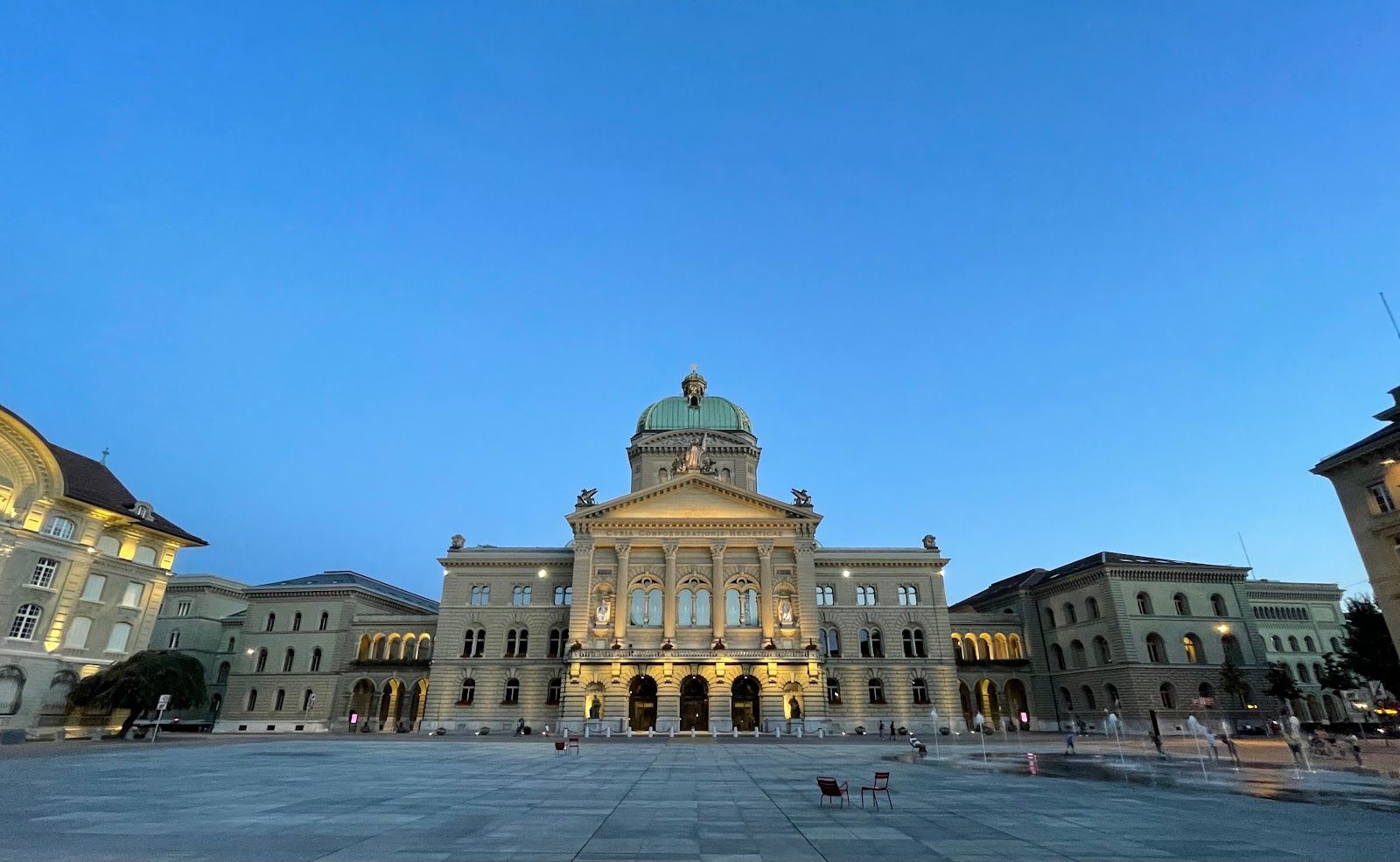 Outside the building, there's a bunch of cool stuff to check out. You can kick back on the terrace, soak in the views of the Marzili public baths, the Aare River, and the iconic Gurten mountain. And keep your eyes peeled for Bundesplatz square, where they've got a cool fountain in the summer and a neat light show and ice rink in the winter. Plus, there's always something happening, from events to classic Bernese markets like the Zibelemärit (onion market) and Christmas markets.
