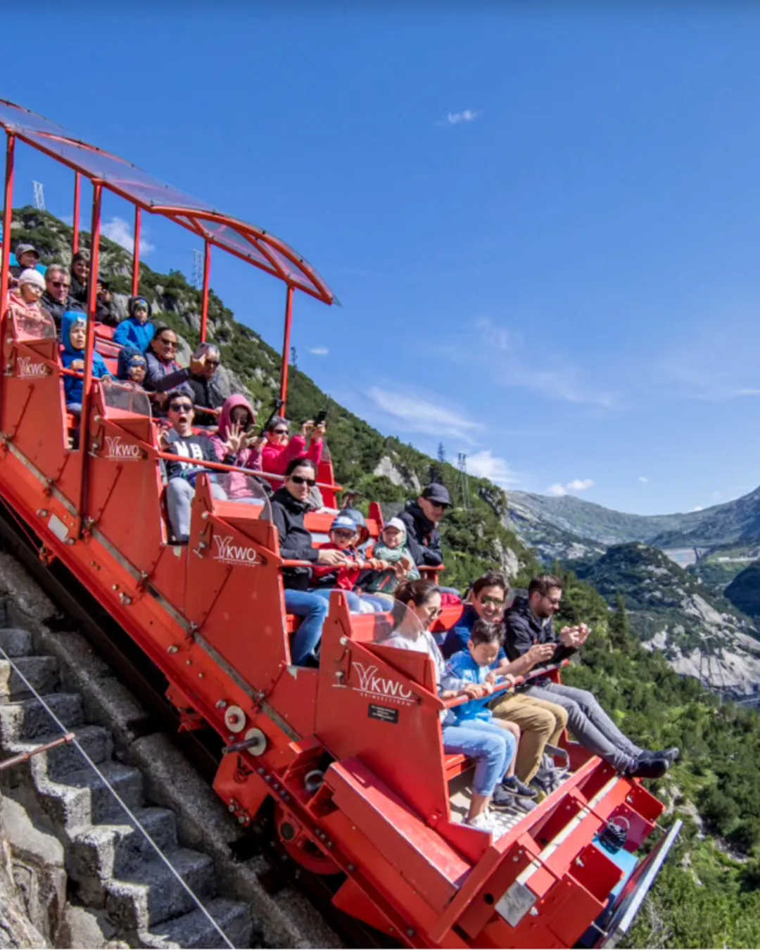 The ride: Open-air cars crawl almost vertically up the mountain above Handegg in the Grimsel region. The views are incredible—waterfalls, cliffs, and turquoise streams rushing below. It only takes about 10 minutes, but your heart might beat faster the whole way.