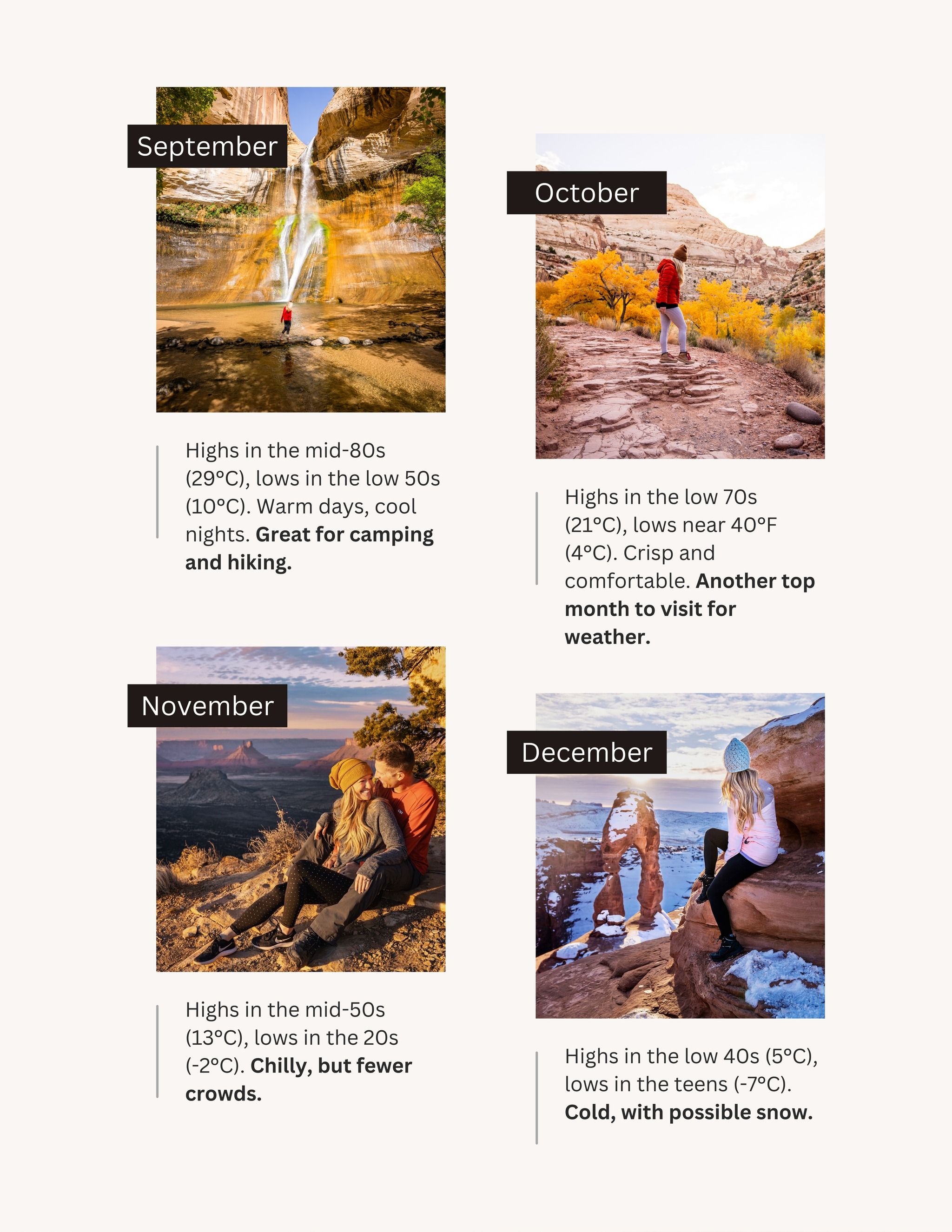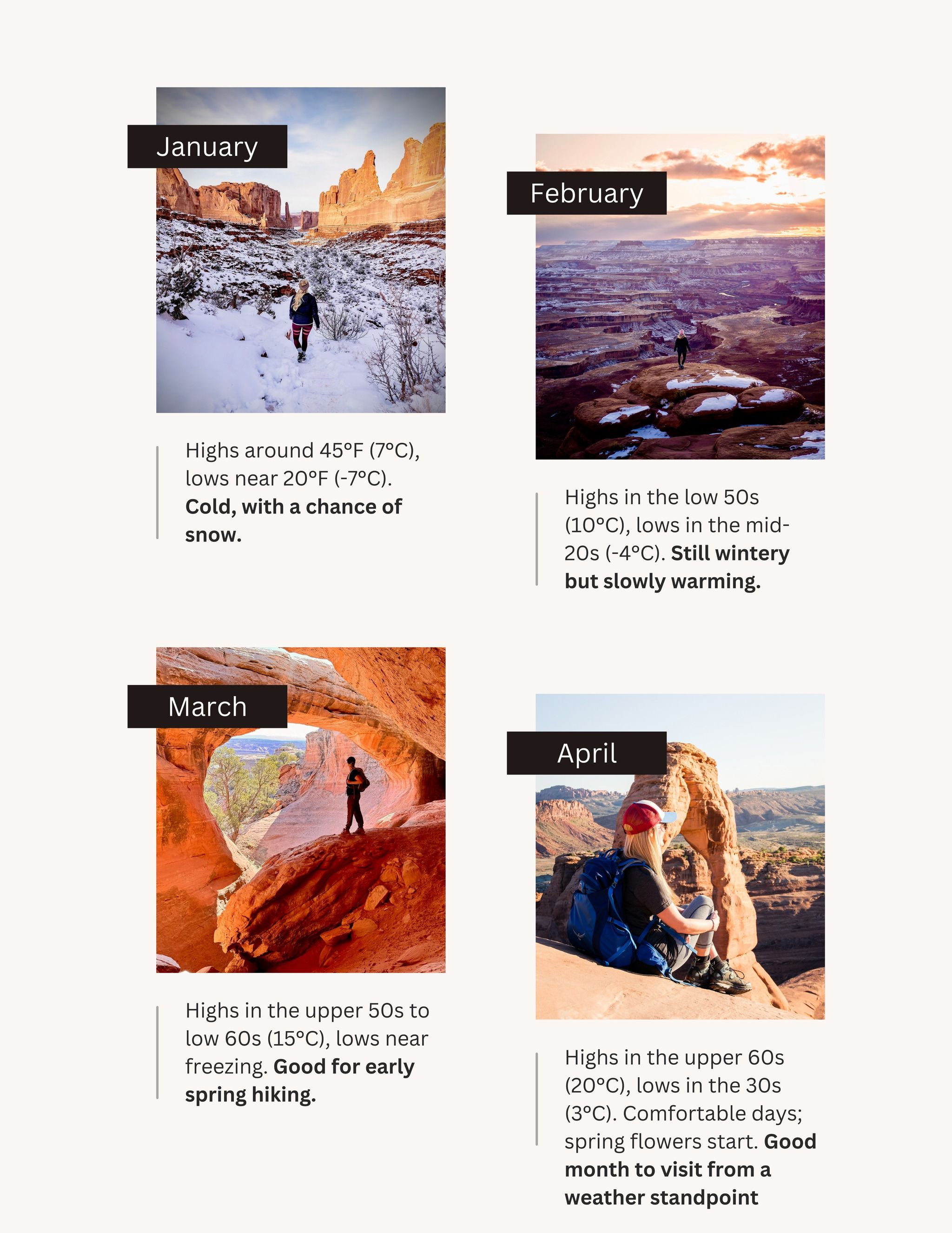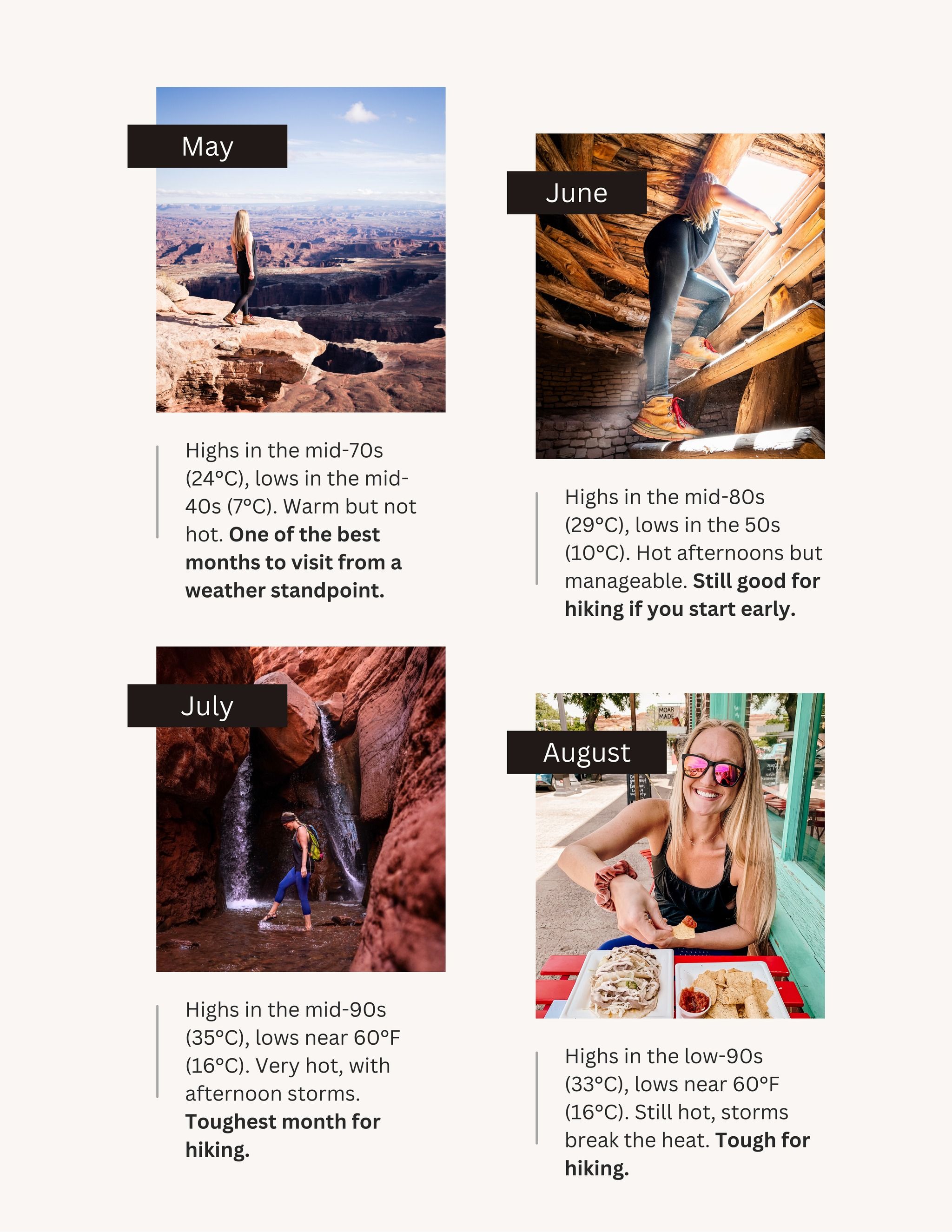 Here’s the quick breakdown and swipe through the carousel to see average temperatures for each month of the year. Average temperatures are from Moab, so it’s important to note that even further south can be warmer!