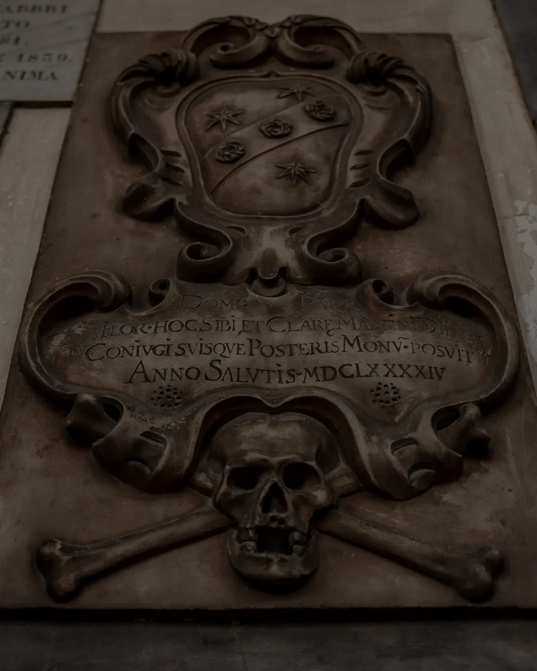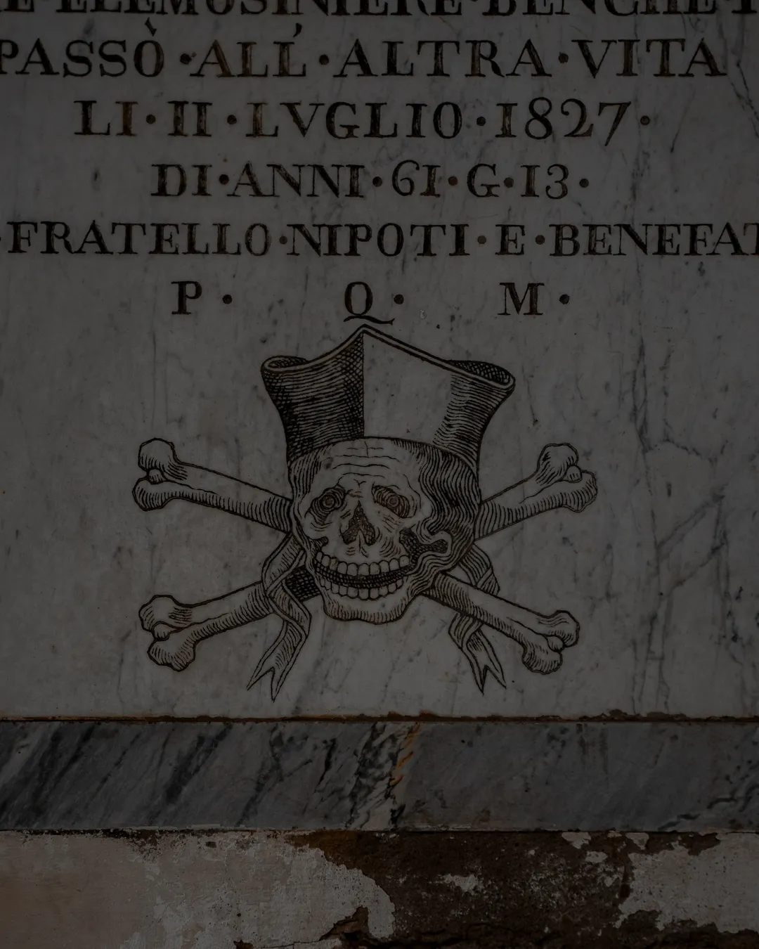 Whilst the admission to the church is free, along the left-hand side you will see an entrance where for a modest admission fee you can gain access to the 17th century cloister. The cloister is named ‘Chiostro dei Morti’ translating to ‘Cloister of the Dead’ and is beautifully designed with arched columns, a serene garden and walls lined with a variety of fascinating tombstones! Upon closer inspection you will find many examples of memento mori including illustrations and carvings of skulls, winged hourglasses, skeletons and scythes, along with other depictions of iconic funerary art. These historic weather-worn designs are part of a patchwork mosaic of 100s of memorial stones which cover all four walls of the cloister.