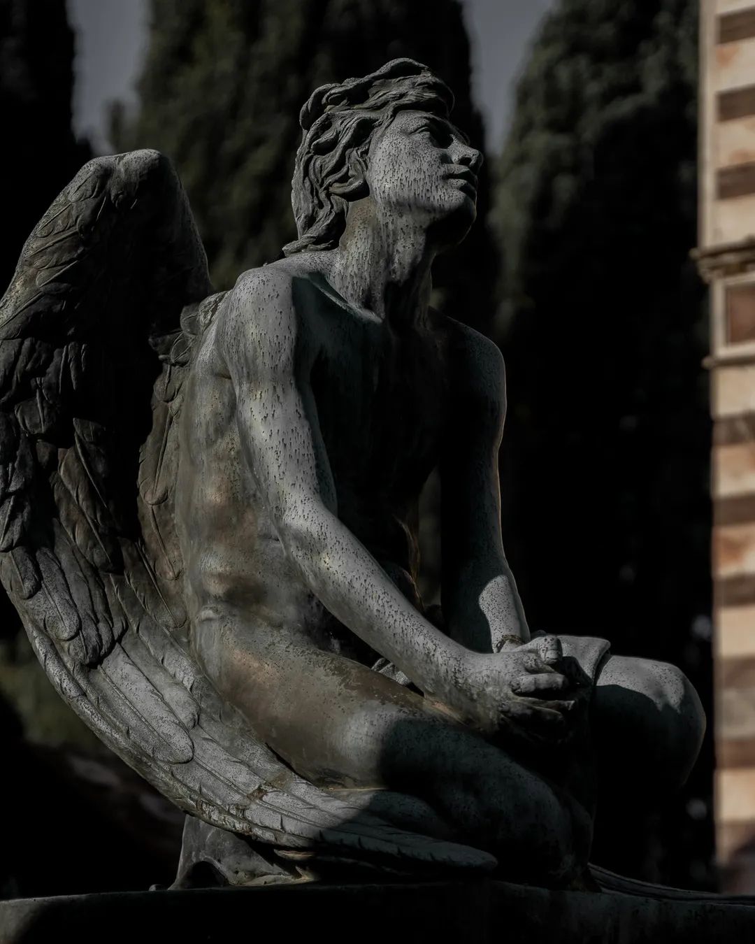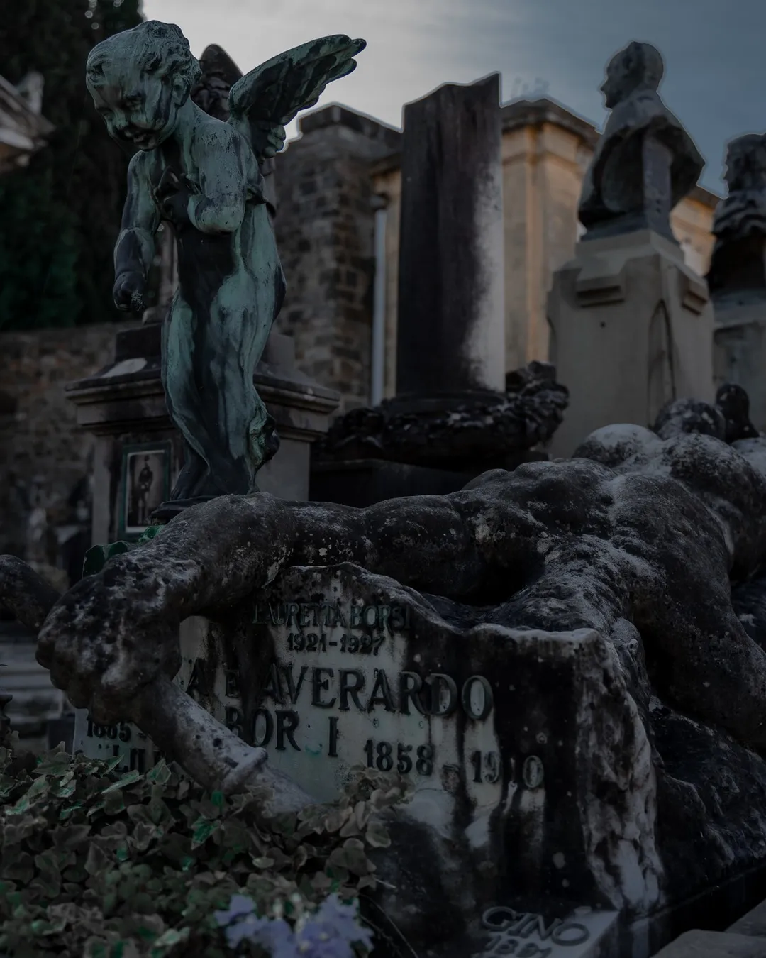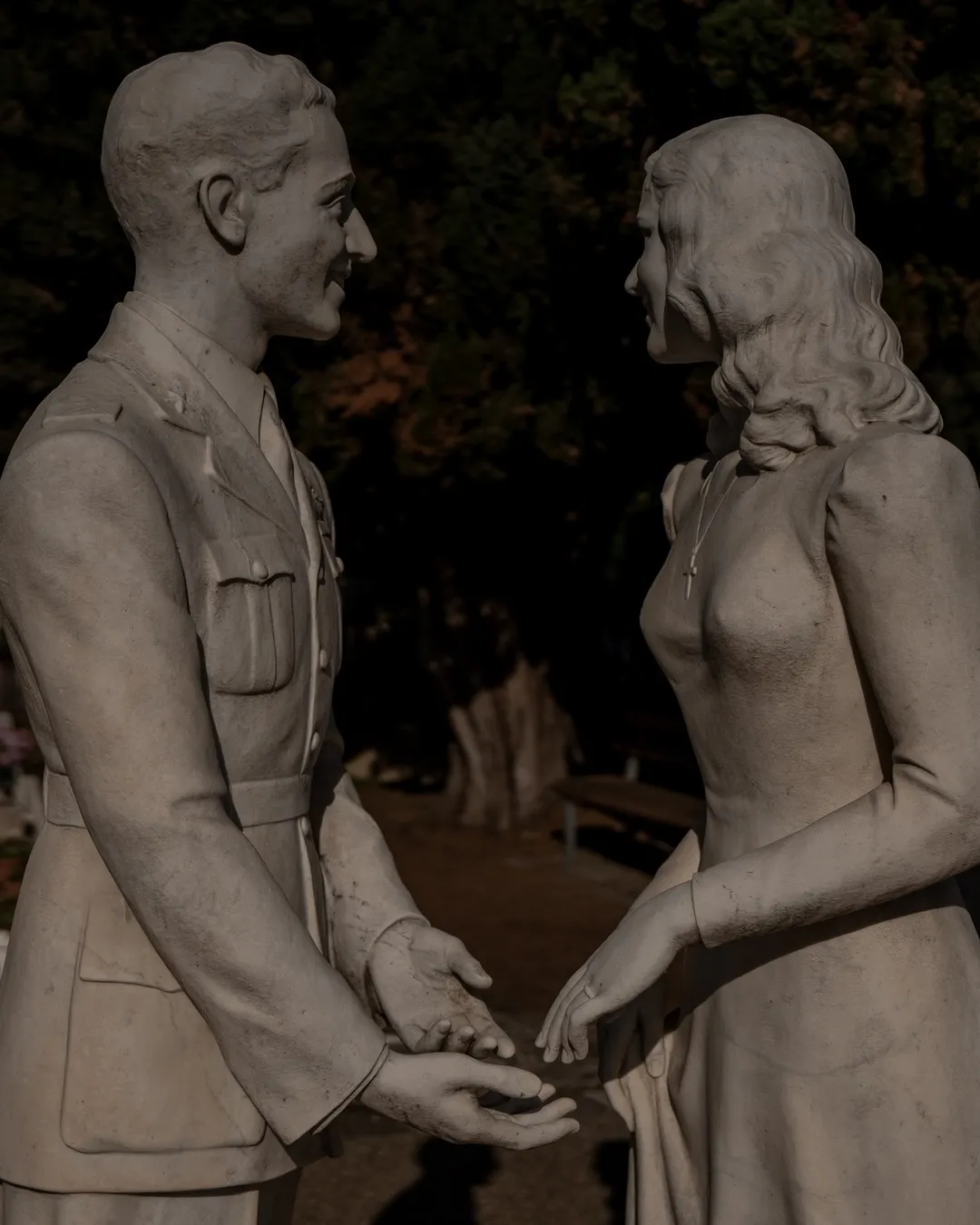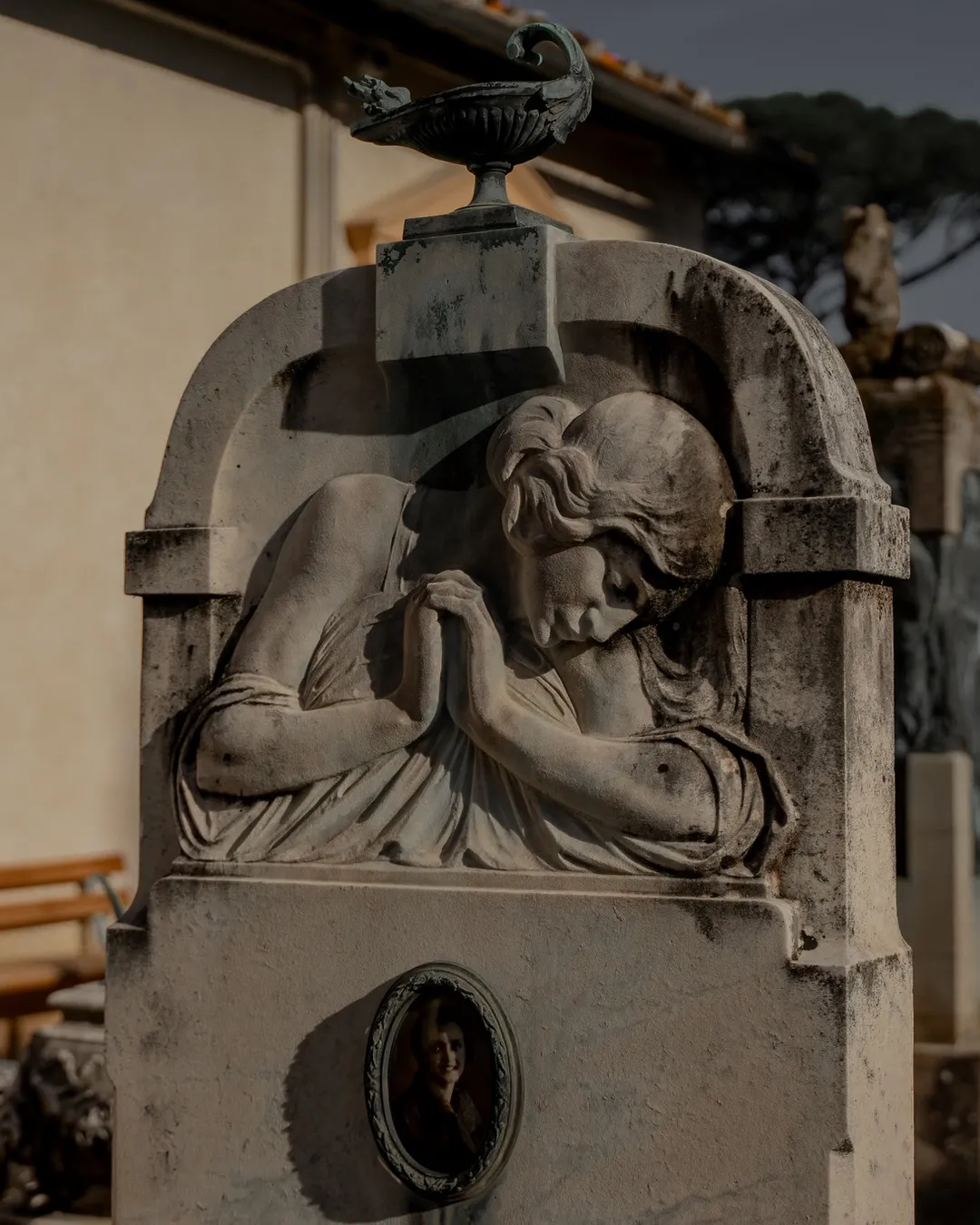 As you are exploring the serene paths you will find one of the cemeteries most noteworthy graves dedicated to the Mazzone siblings. The effigies depict the brother and sister dancing together after being reunited in the afterlife. Sadly, Mario died whilst serving as a pilot during WW1 and is shown wearing his pilot’s uniform and Maria died just before she was due to be married so is shown dressed in her wedding gown. From this location you can easily access the elevated area of the cemetery where you can acquire more stunning views of this artistic open-air museum and appreciate the beauty of the landscaping and the tranquillity it brings.