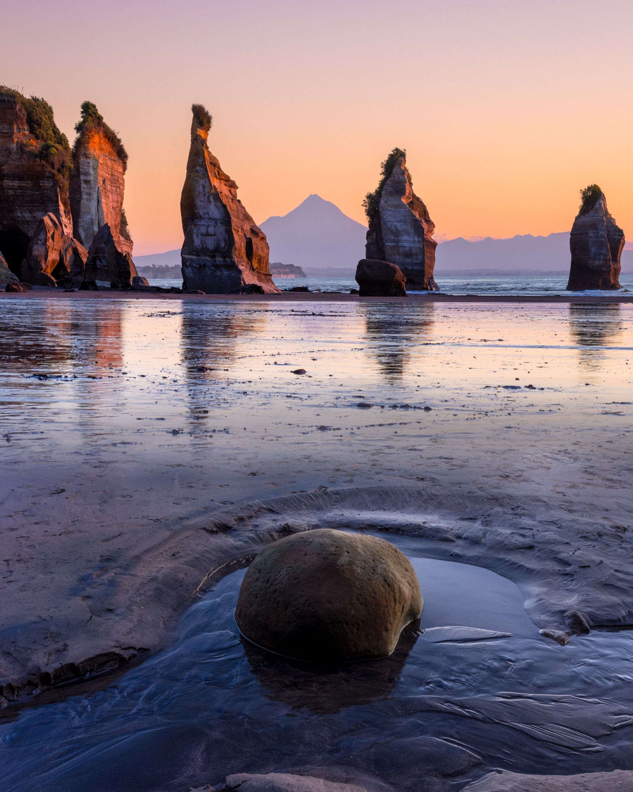 You can visit the Three Sisters and Elephant Rock on the mid to low tide only, so please do check the tide timetable before you leave. The walk along the inlet out to the rock formations from the Tongaporutu Domain only takes around 10 minutes and is so worth the wet/slightly muddy feet to get there. Mount Taranaki can be seen on a clear day behind these magnificent rock formations and at sunset the golden hues are beautiful and light up the beach and the structures.