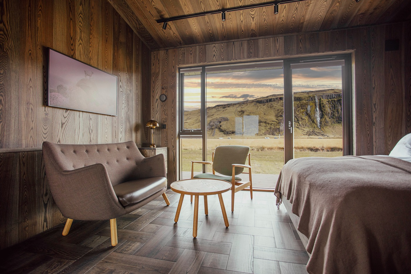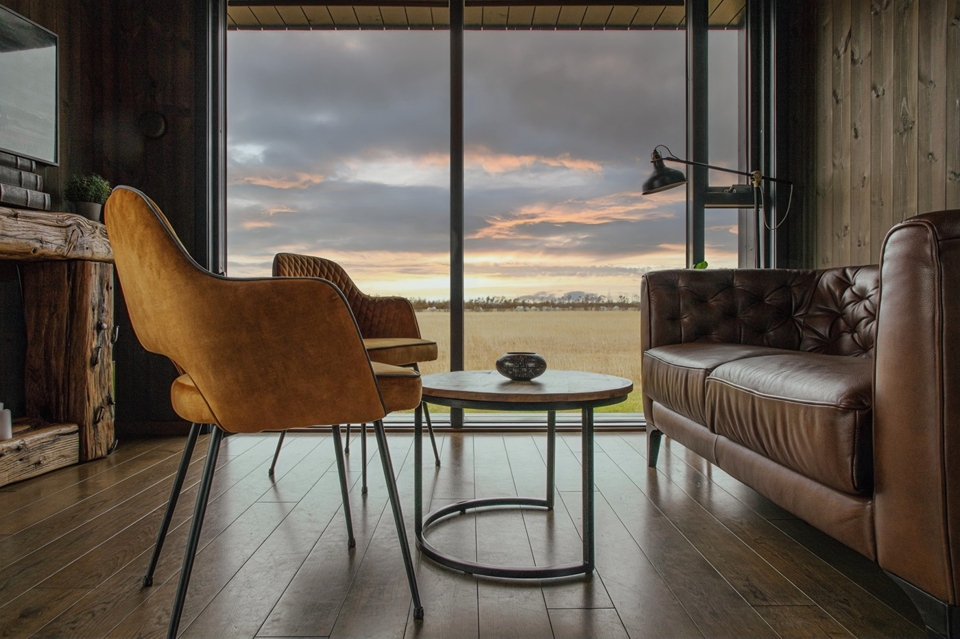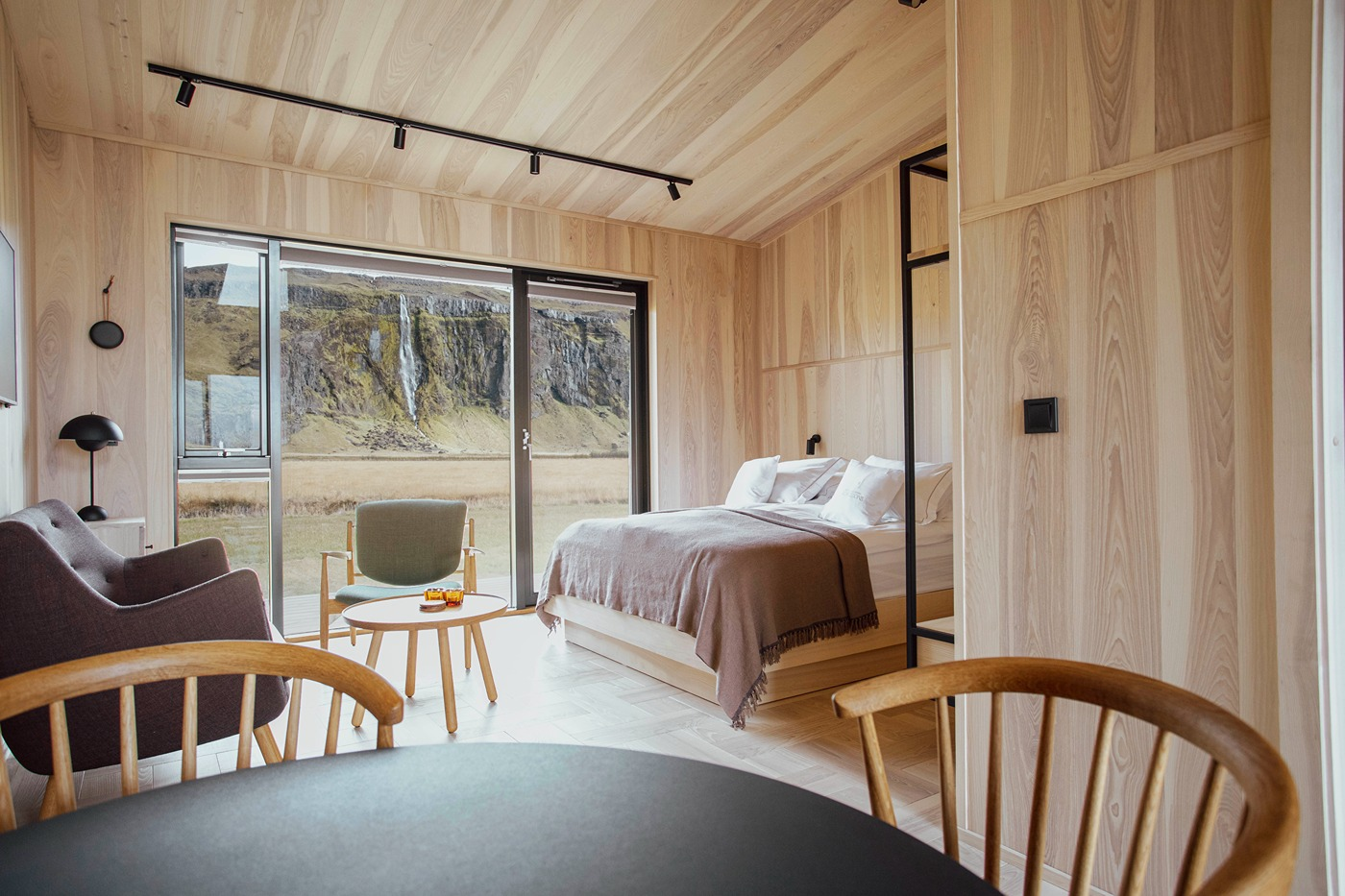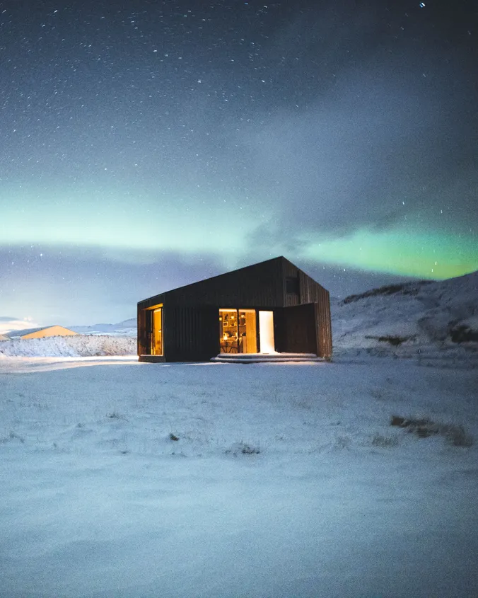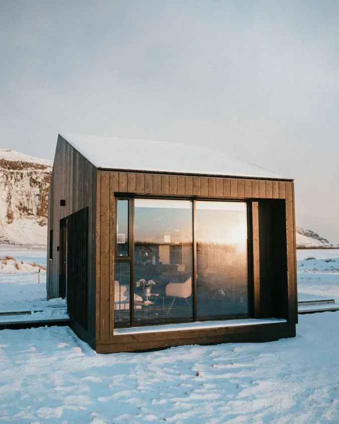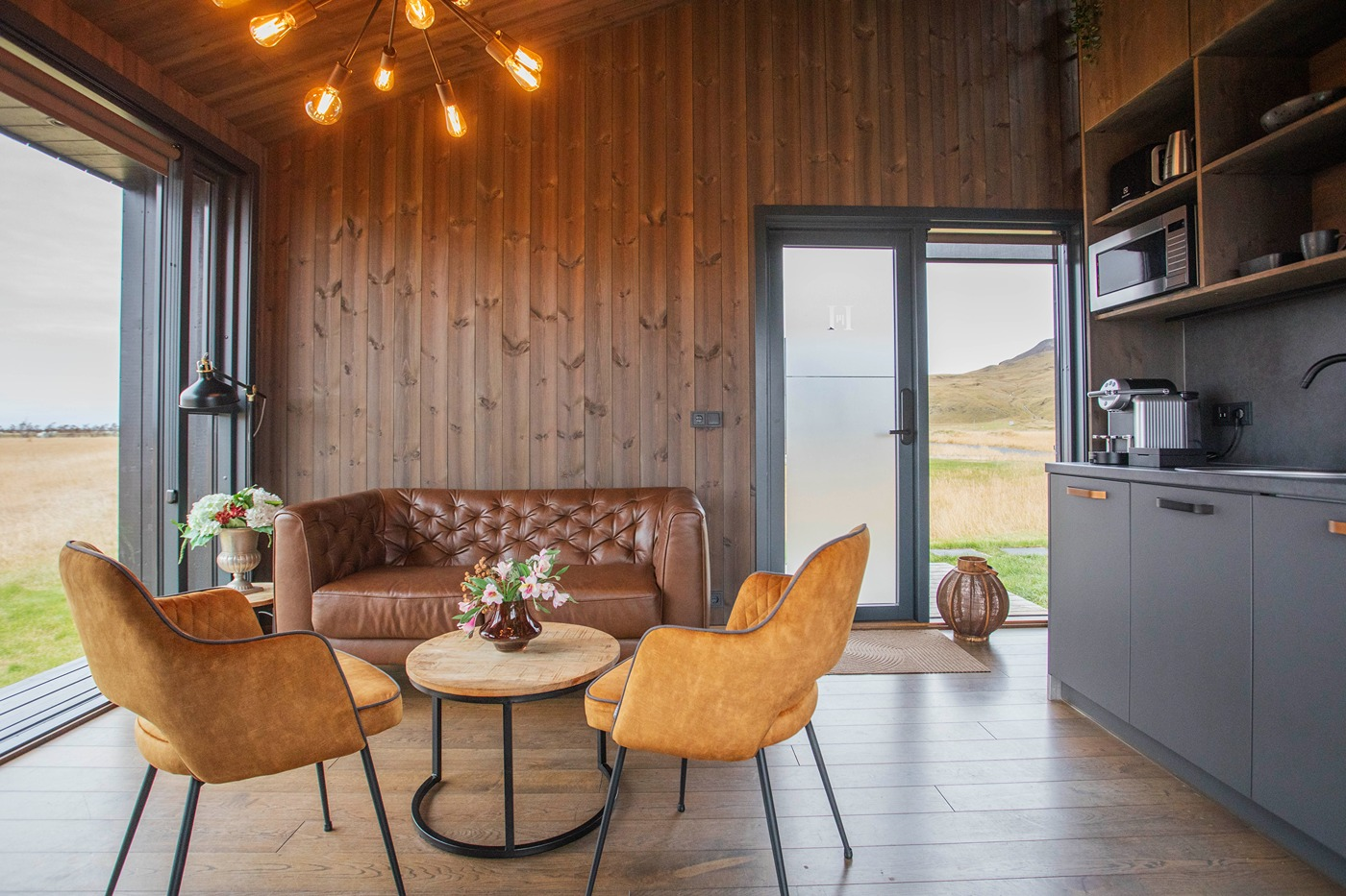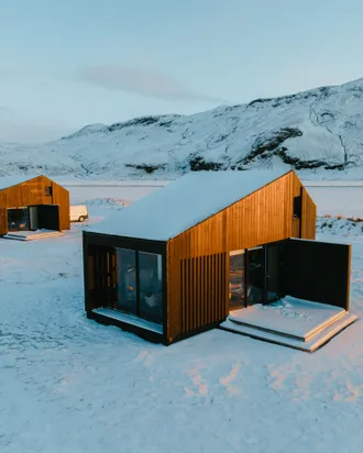 The eight luxury lodges were built in 2019. The lodge has two bedrooms (one of them upstairs), and a bathroom with a shower cabin. The kitchen and living room are in an open area with large panorama windows, cozy wooden design, and Nordic-style furniture. A small outside terrace completes the house. Built in 2019, each lodge is 43 m2 and comes with all necessary equipment. Recently, 4 new studio apartments were added. Located just 1 km from the famous Seljalandsfoss waterfall, each of our studio apartments is perfectly suited for 4 people.