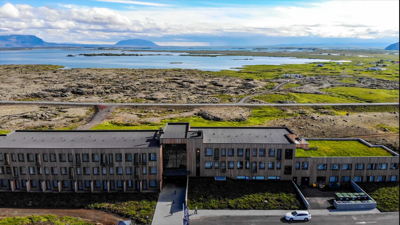 Fosshotel Mývatn offers 92 rooms in wonderful surroundings north of Lake Mývatn, within 100 km from the Akureyri Airport. The hotel is designed by award-winning architectures and features almost exclusively low-environmental impact materials. The building is a low-rise, clad with larch wood and grass roof which makes it in perfect harmony with the surrounding nature.