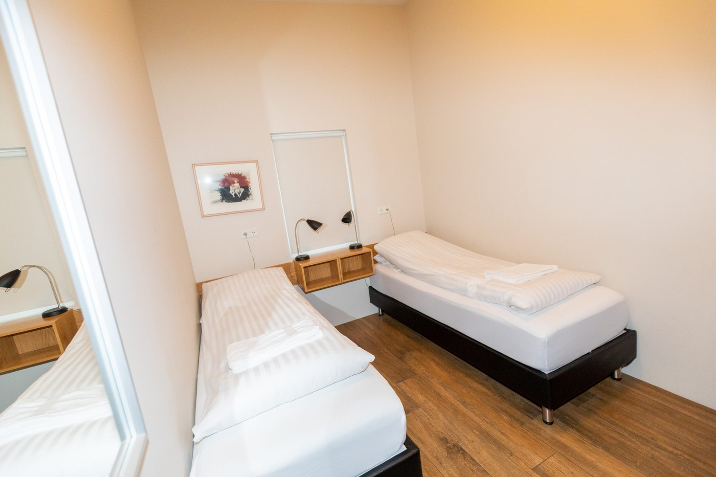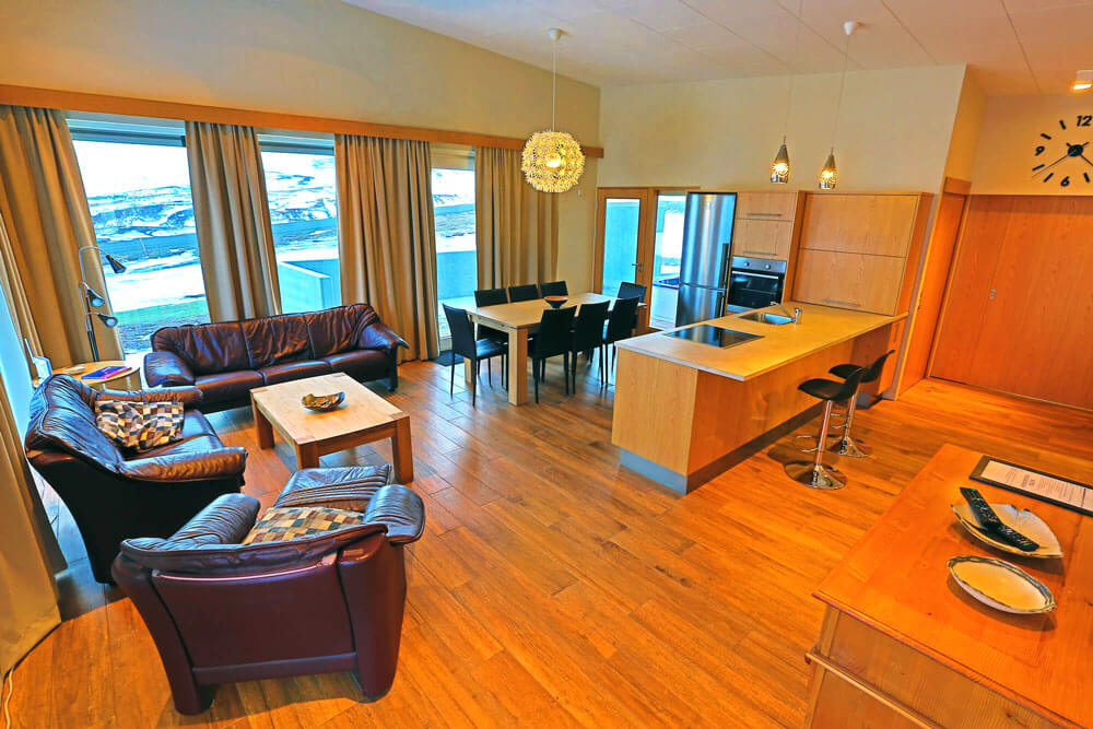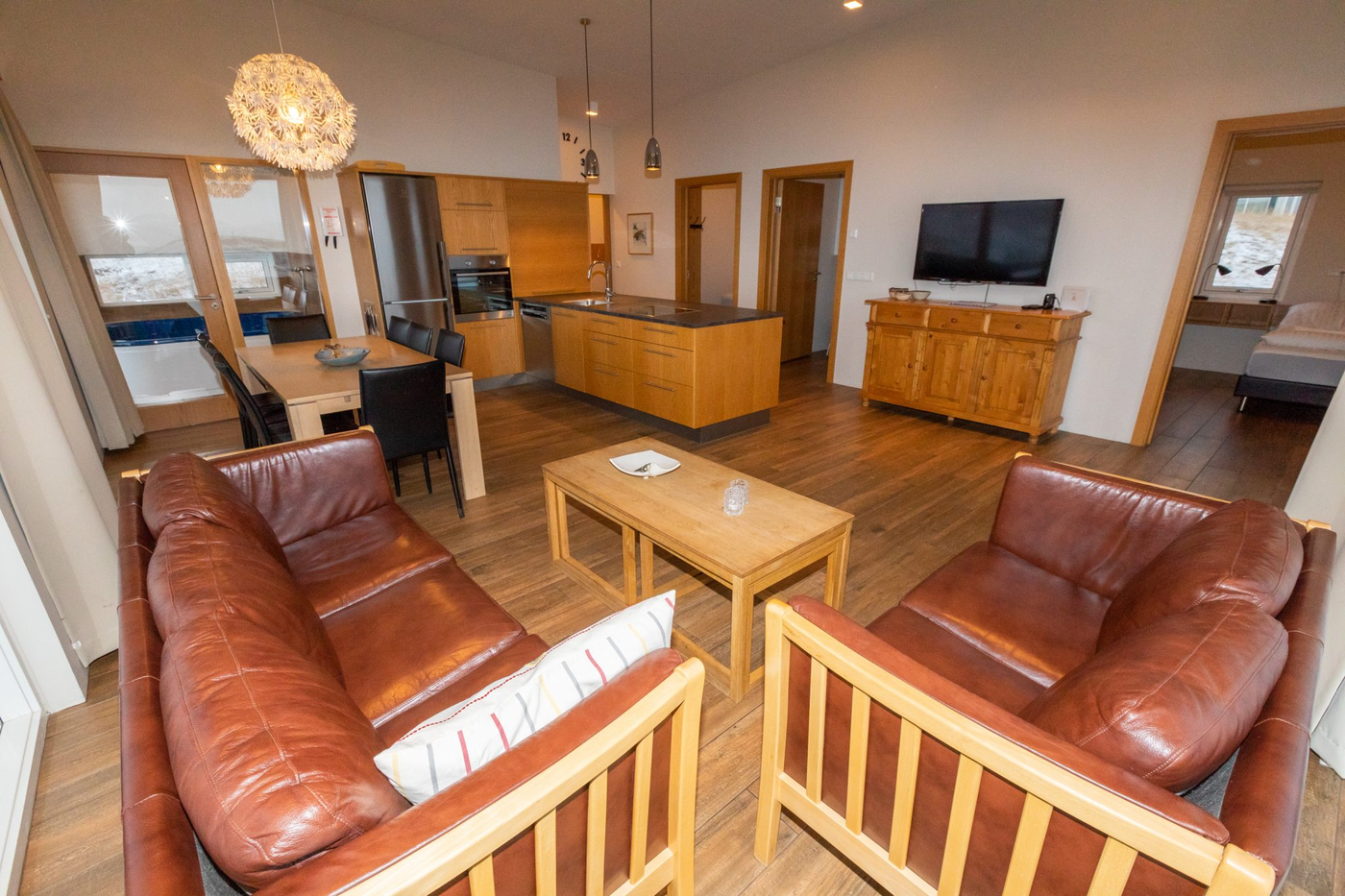 Two nights is the minimum booking The location of our Cottages is well-suited for your family vacation being near to the ski resort at Hlidarfjall. The cottages are situated only 5 km from the centre of Akureyri and therefore within easy reach of many other activities on offer in the area. They are all equipped to a high standard for modern living and offer a stunning view over the town and fjord. Each cottage has 3 bedrooms comprising a master bedroom with double bed, one room with 2 single beds and 2 bunk beds. And finally one room with 2 single beds. In total each cottage can therefore accommodate 8 guests. In addition all the cottages have 2 bathrooms, a lounge, kitchen, indoor Jacuzzi area and laundry room. All the cottages are kept comfortably warm with underfloor heating.