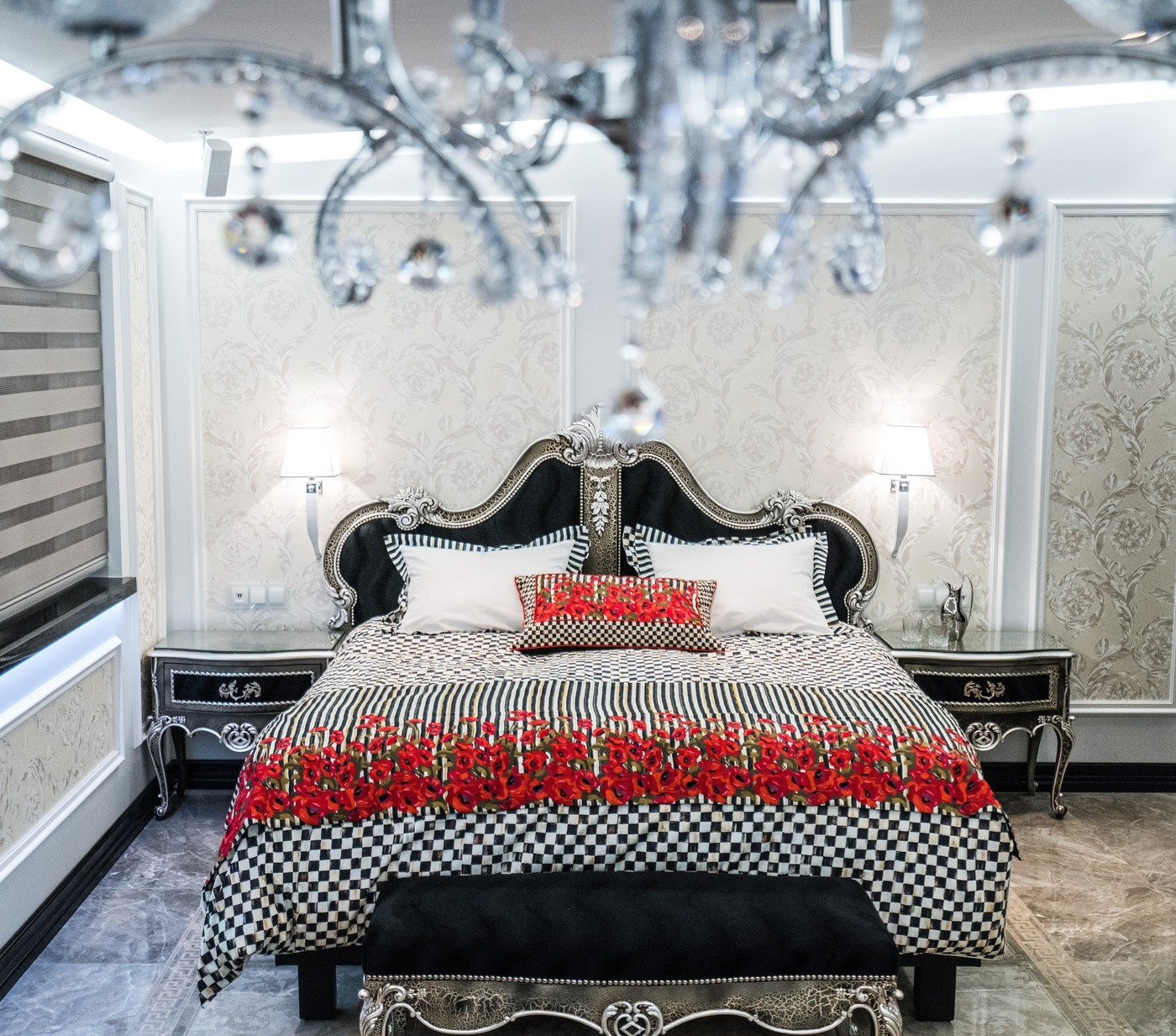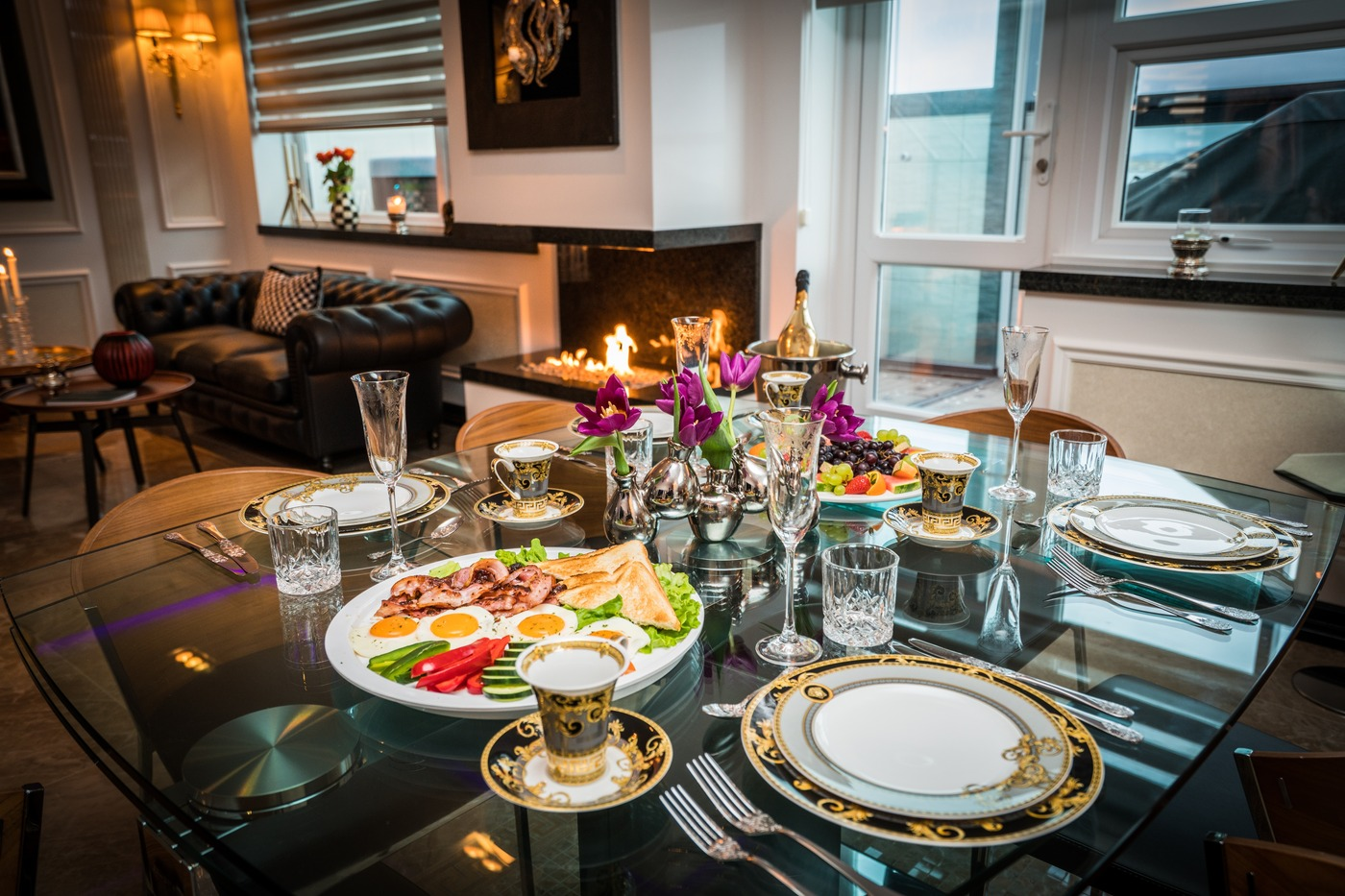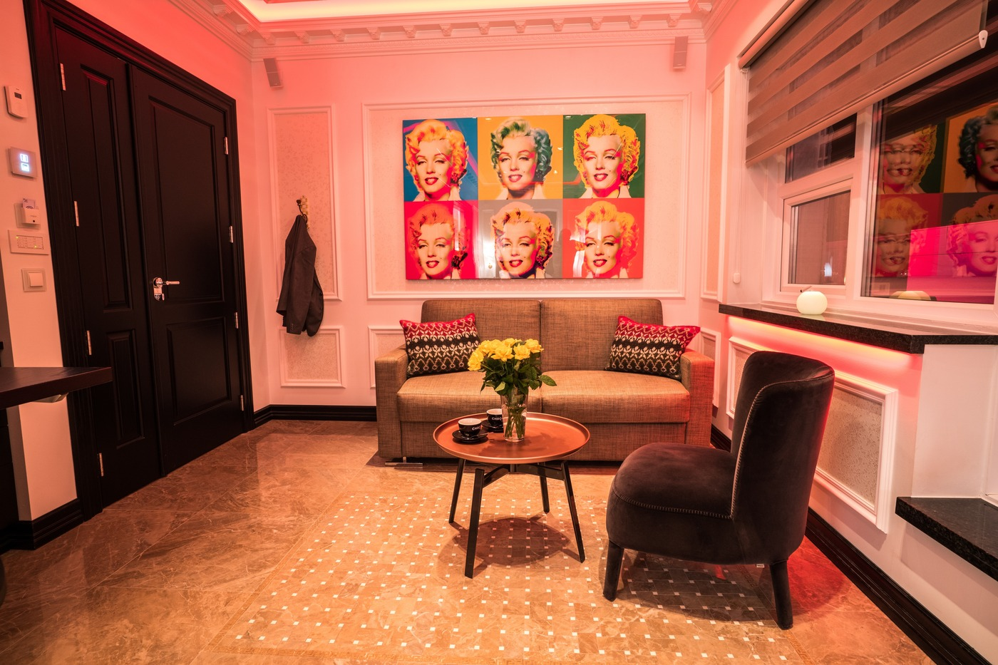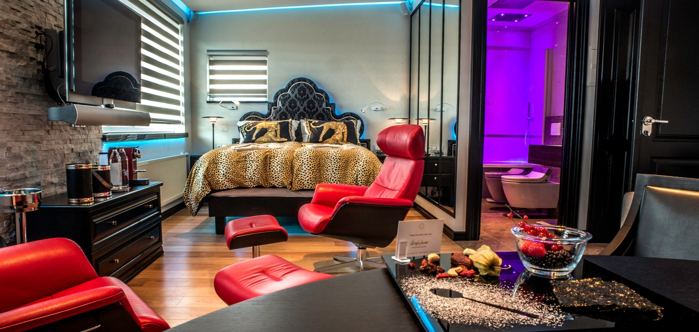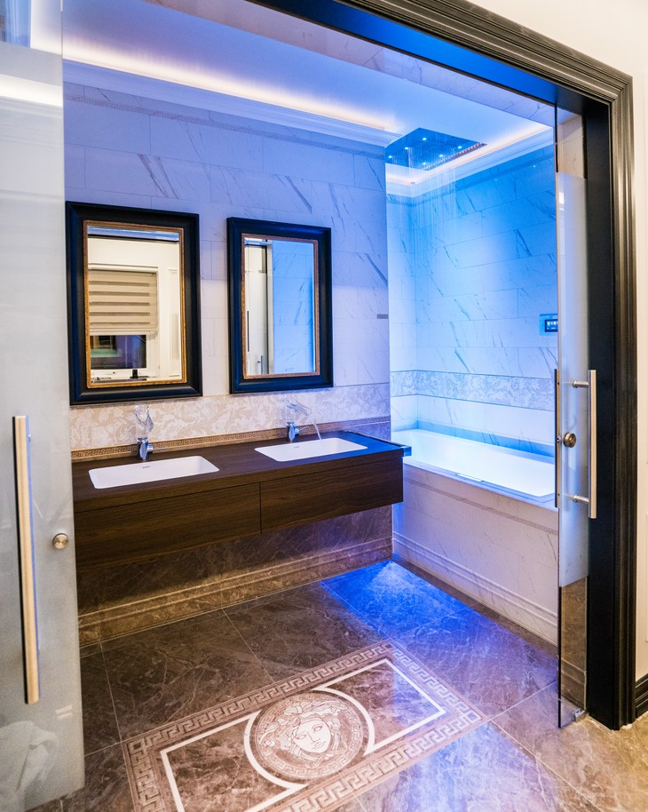 The entire Diamond Suites boutique hotel offers the unique possibility of being rented as a single penthouse suite measuring 3000 square feet. It features a spacious living room, dining area, kitchenette, private balcony with two Jacuzzi’s and up to five en suite bedrooms each one with its own character and theme such as VERSACE marble tiles, whirlpool bathtubs, double sinks, and faucets designed by Philippe Starck.
