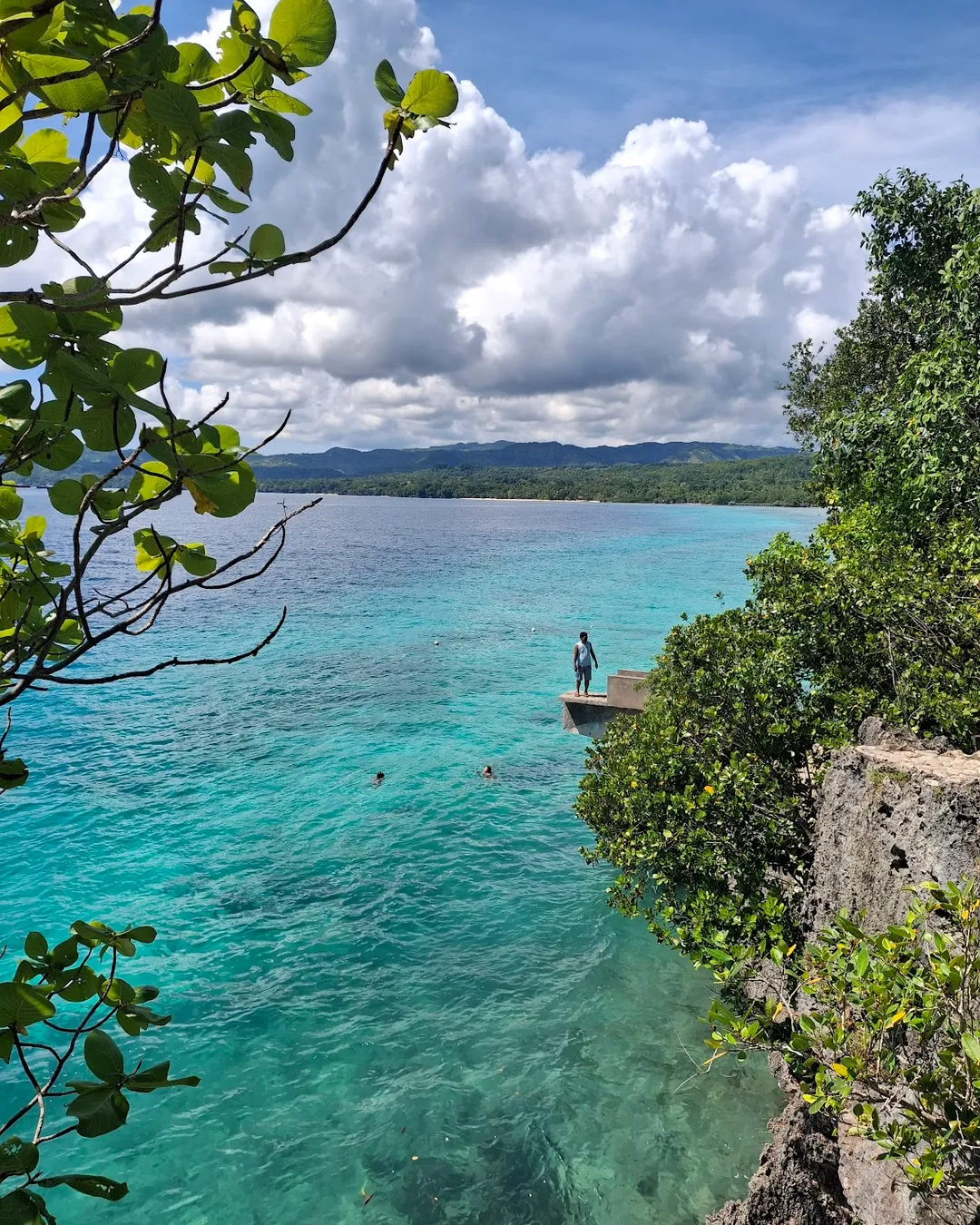 Cliff jumps and swims at a resort beach