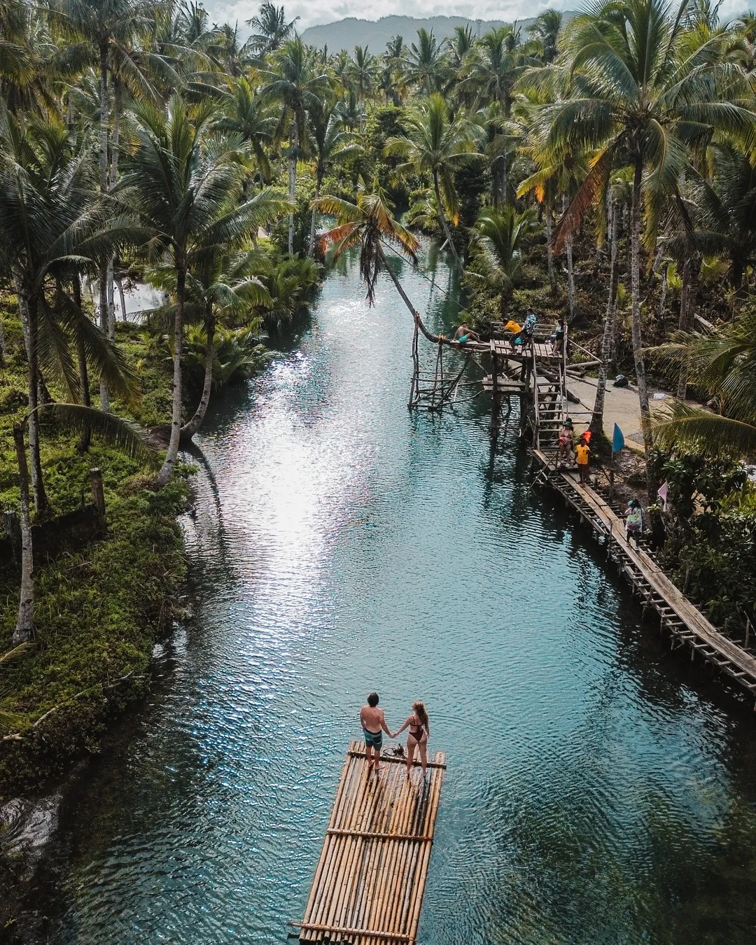 Palm-fringed river with rope swing
