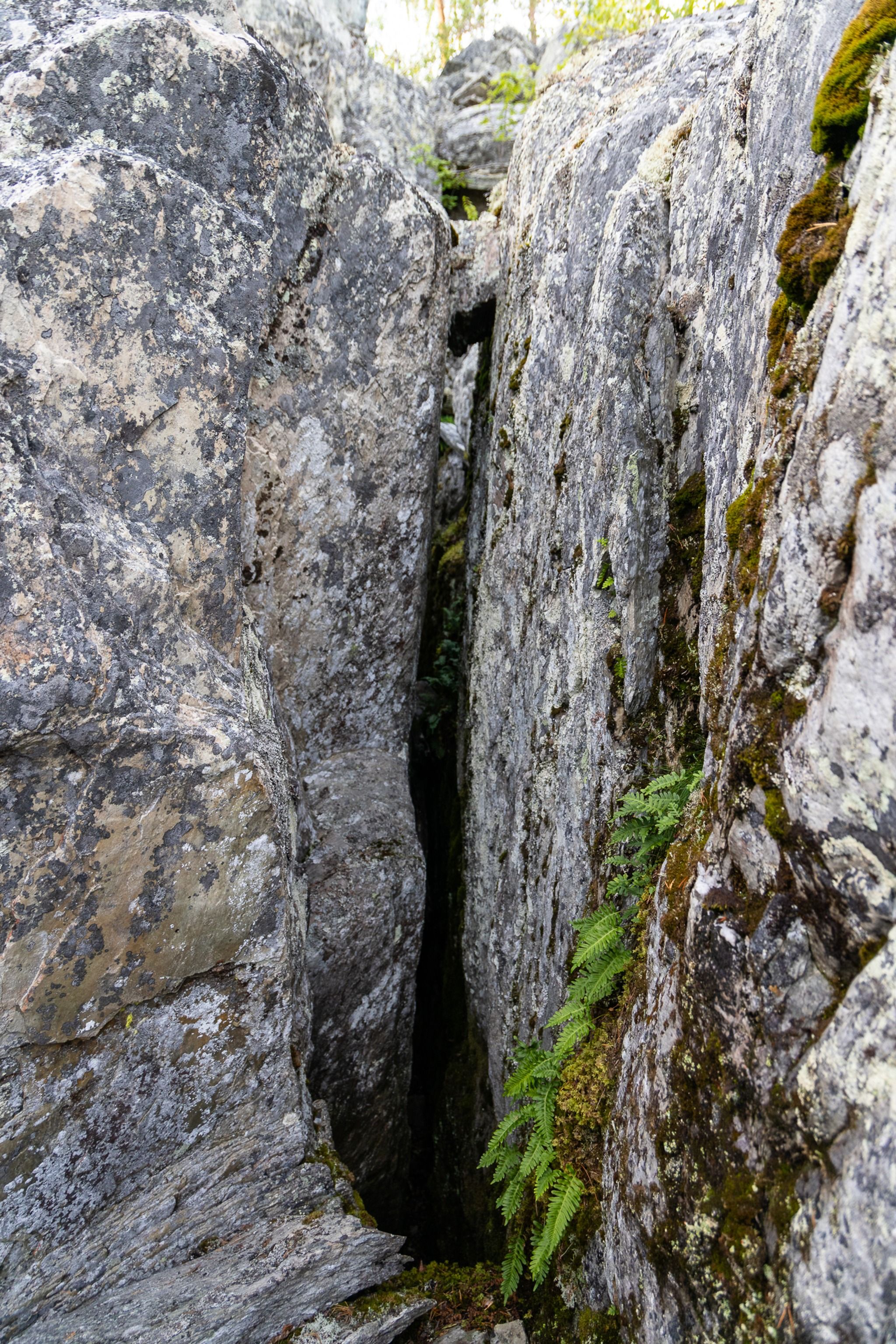 The Cave and Gorge trail is a 1km long separate circular trail, which branches off from the main nature trail a few kilometers after the pond at the steepest part of the hill. It then rejoins the main trail later. The Cave and Gorge trail showcases more than ten caves and gorges in the area. The largest cave is one of the finest I have ever visited in Finland, and it can be found quite quickly from the start of the Cave and Gorge trail behind the magnificent hut fireplace. The Cave and Gorge trail includes a lot of stairs.