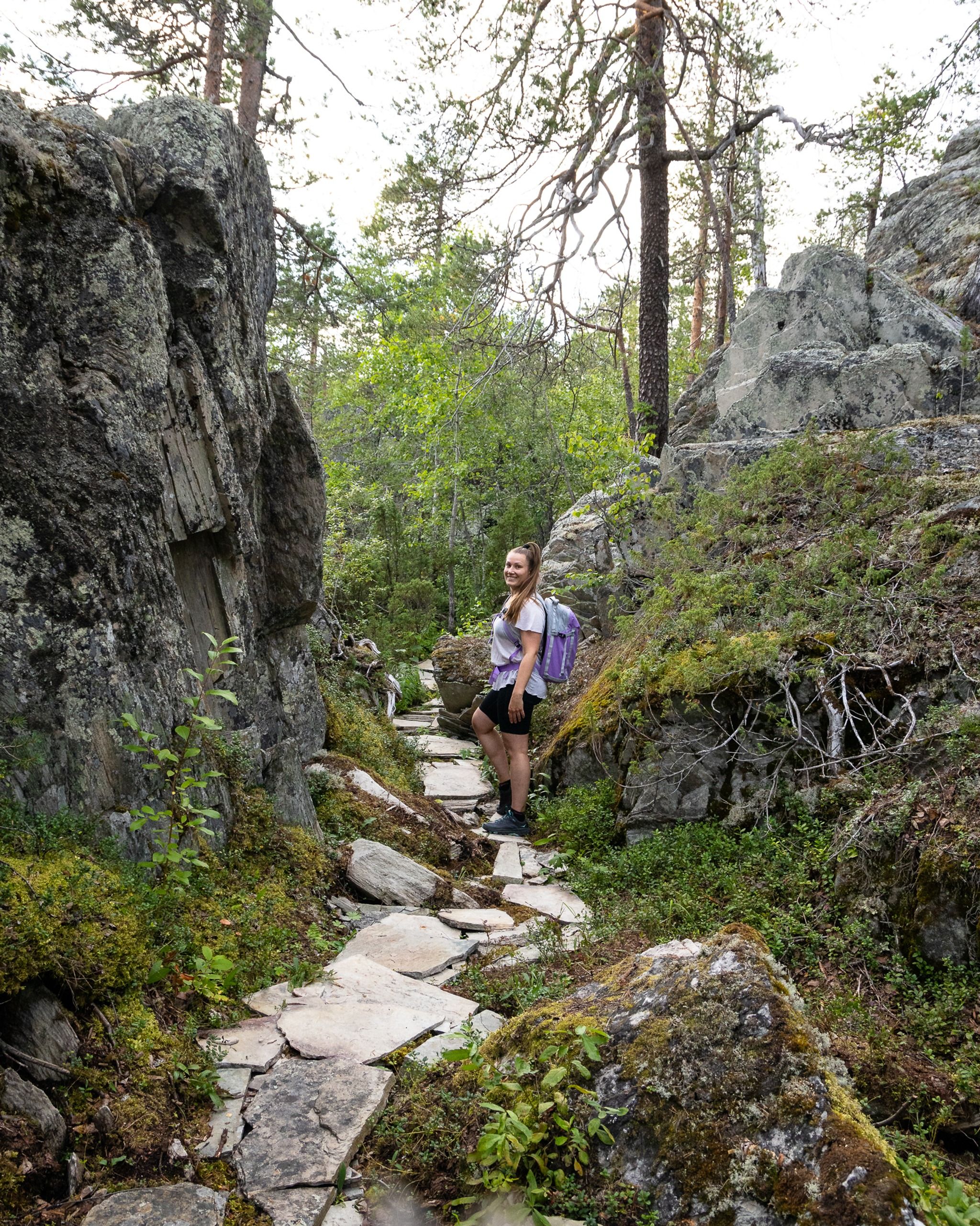 Kätkävaaran luontopolku (7 km) + Luola- ja rotkopolku (1 km) on loistava päiväretkikohde. Koko reitti on keskivaikea, mutta kannattaa varata 3–4 tuntia kävelyyn ja kaiken näkemiseen! Polun varrella on myös paljon infotauluja ja interaktiivisia äänitarinoita, joihin suosittelen tutustumaan – ne olivat upeita!