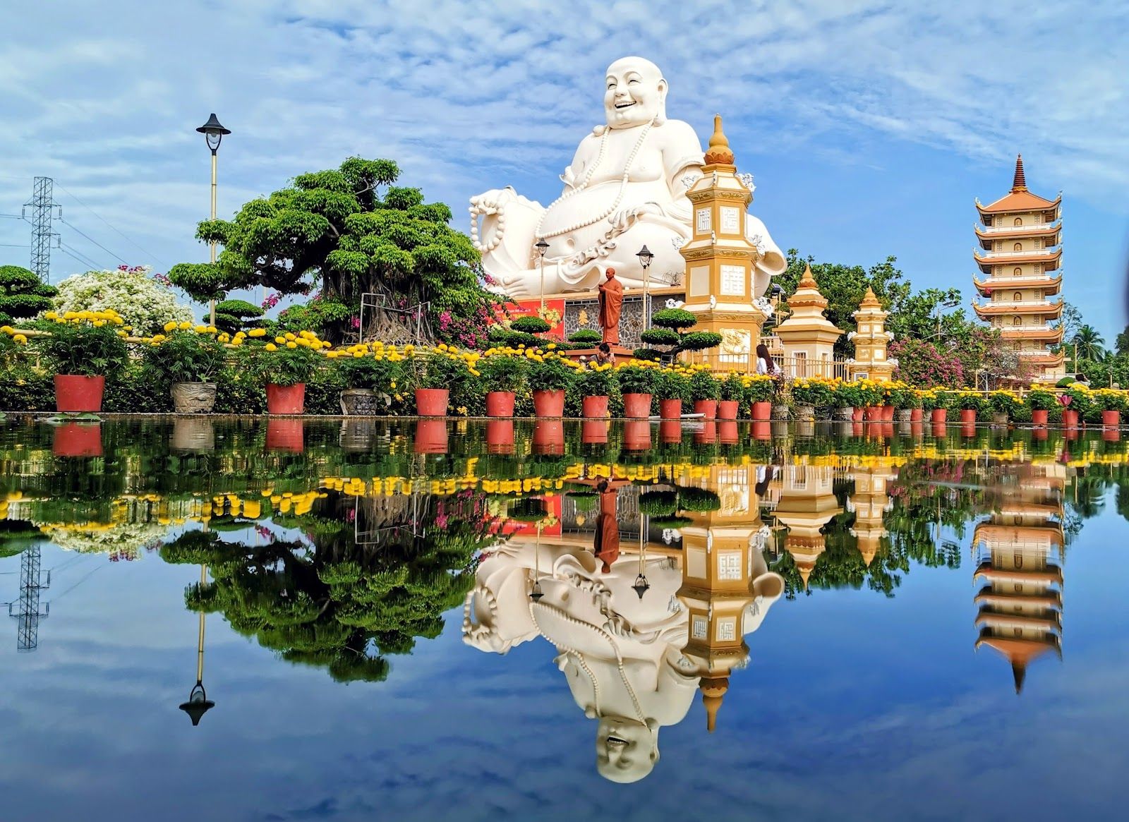 The pagoda complex is expansive, covering about two hectares, with several large statues, gardens, and multiple halls. Notably, it is home to three large Buddha statues: a standing Buddha, a reclining Buddha, and a laughing Buddha, each representing different aspects of Buddhism. The pagoda is also adorned with beautiful bonsai trees and lotus ponds, creating a serene environment for meditation and reflection.
