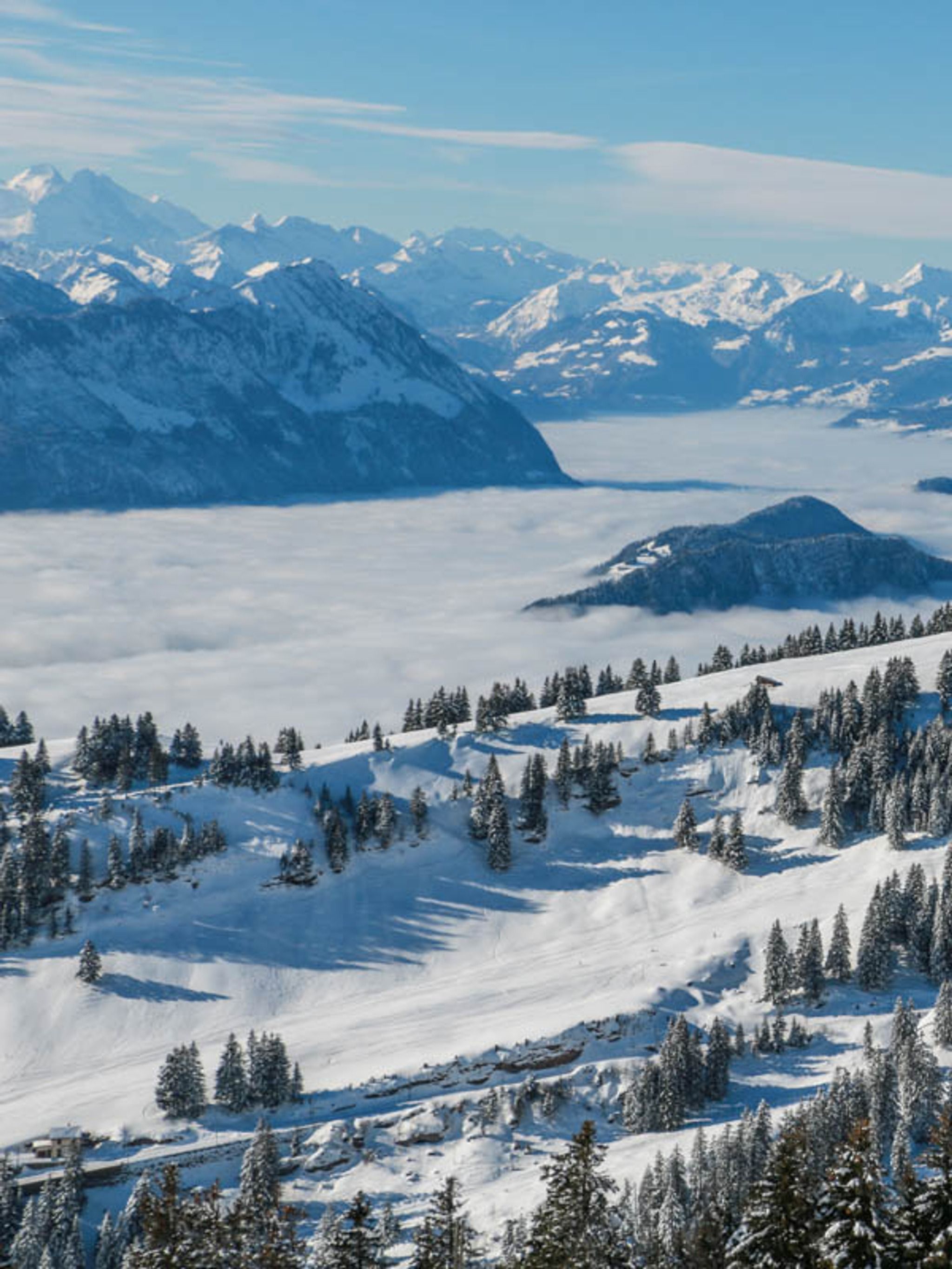 This groomed winter trail at Mount Rigi has spectacular views of many mountains and lakes in the Lucerne region.