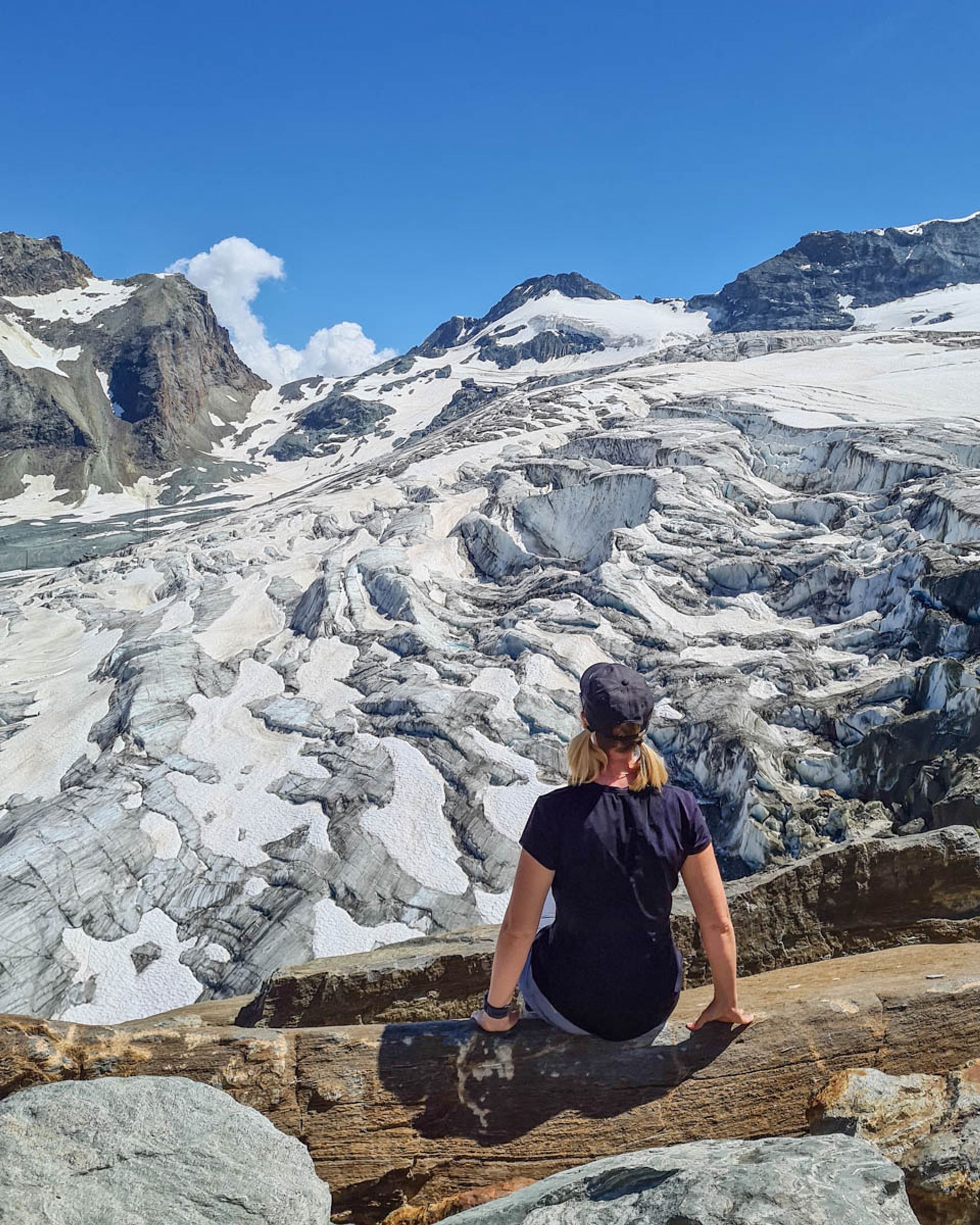 Ride a cable car to a spectacular viewpoint over two glaciers that sit above Saas Fee Switzerland and do a short walk to three glacier lakes. It's a super easy outing for all ages with arguably the best views in all of the Saastal region.