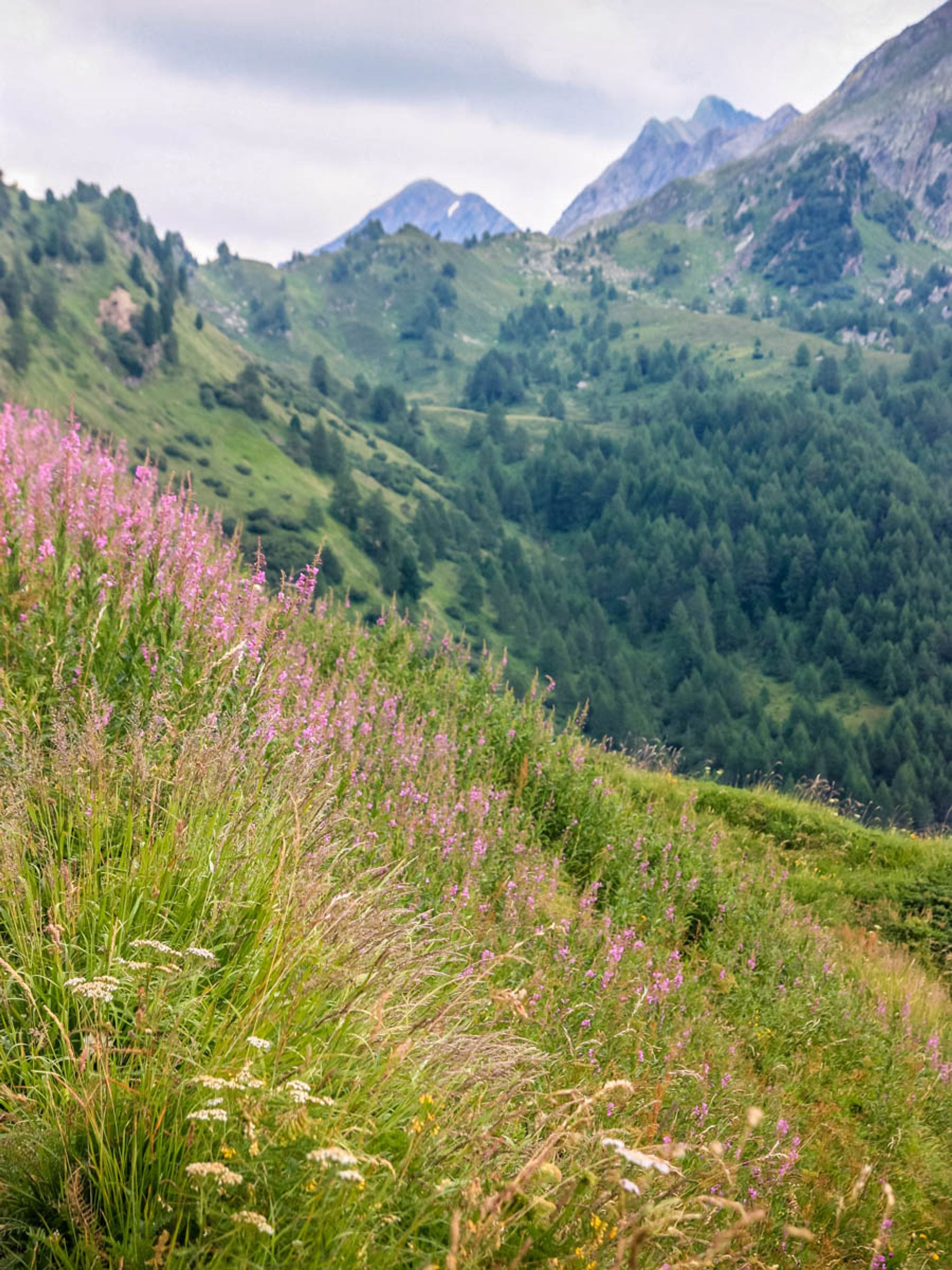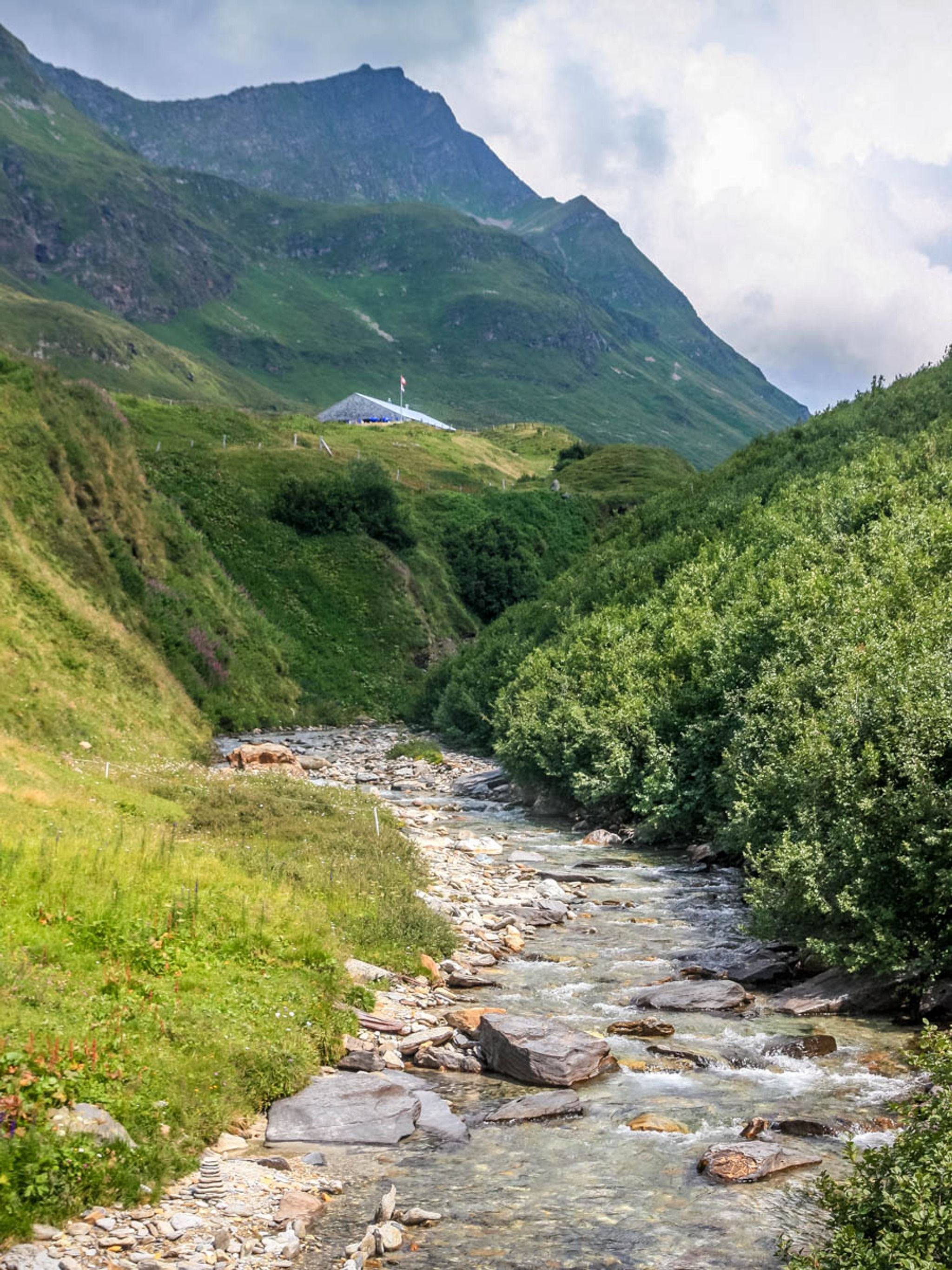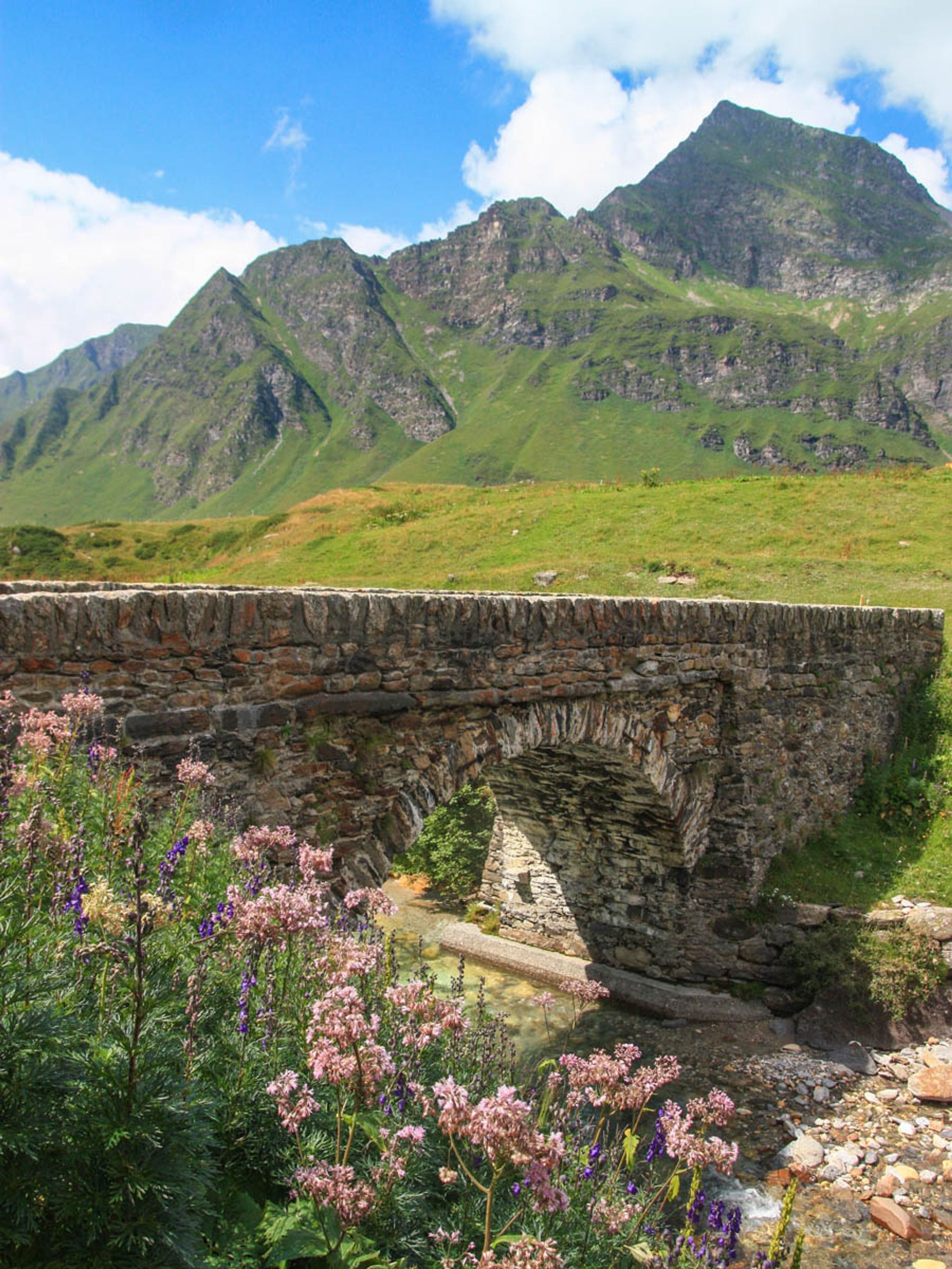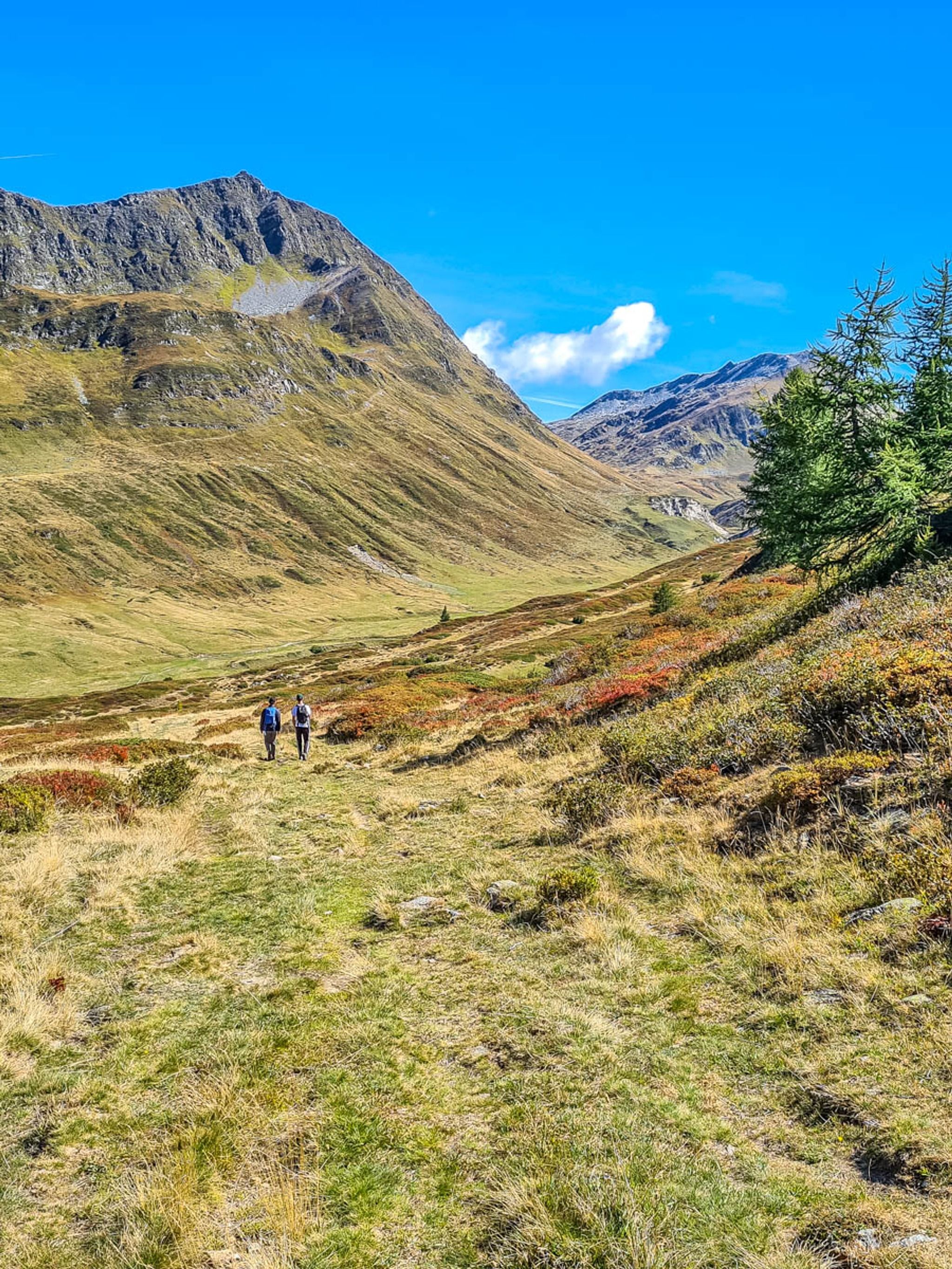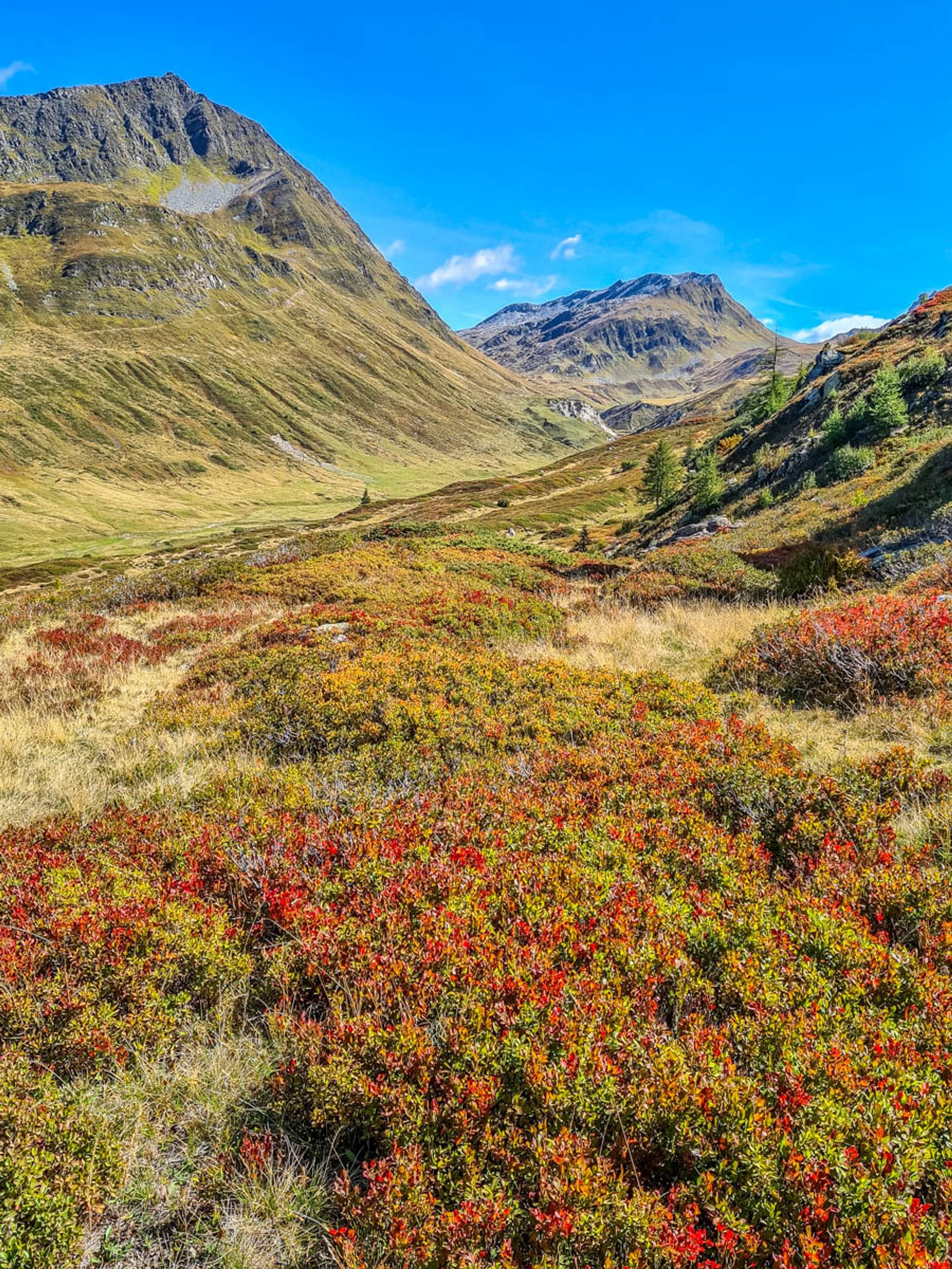 The full loop passes through forests and meadows and by more little alpine lakes and a river. It's lovely green all summer with lots of wildflowers. In September, the fields turn golden brown, spotted with red blueberry bushes.