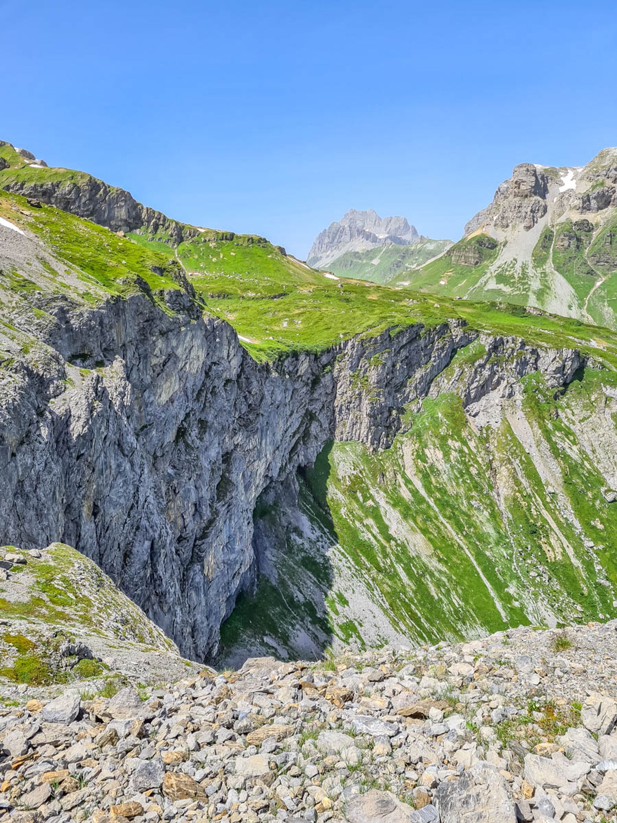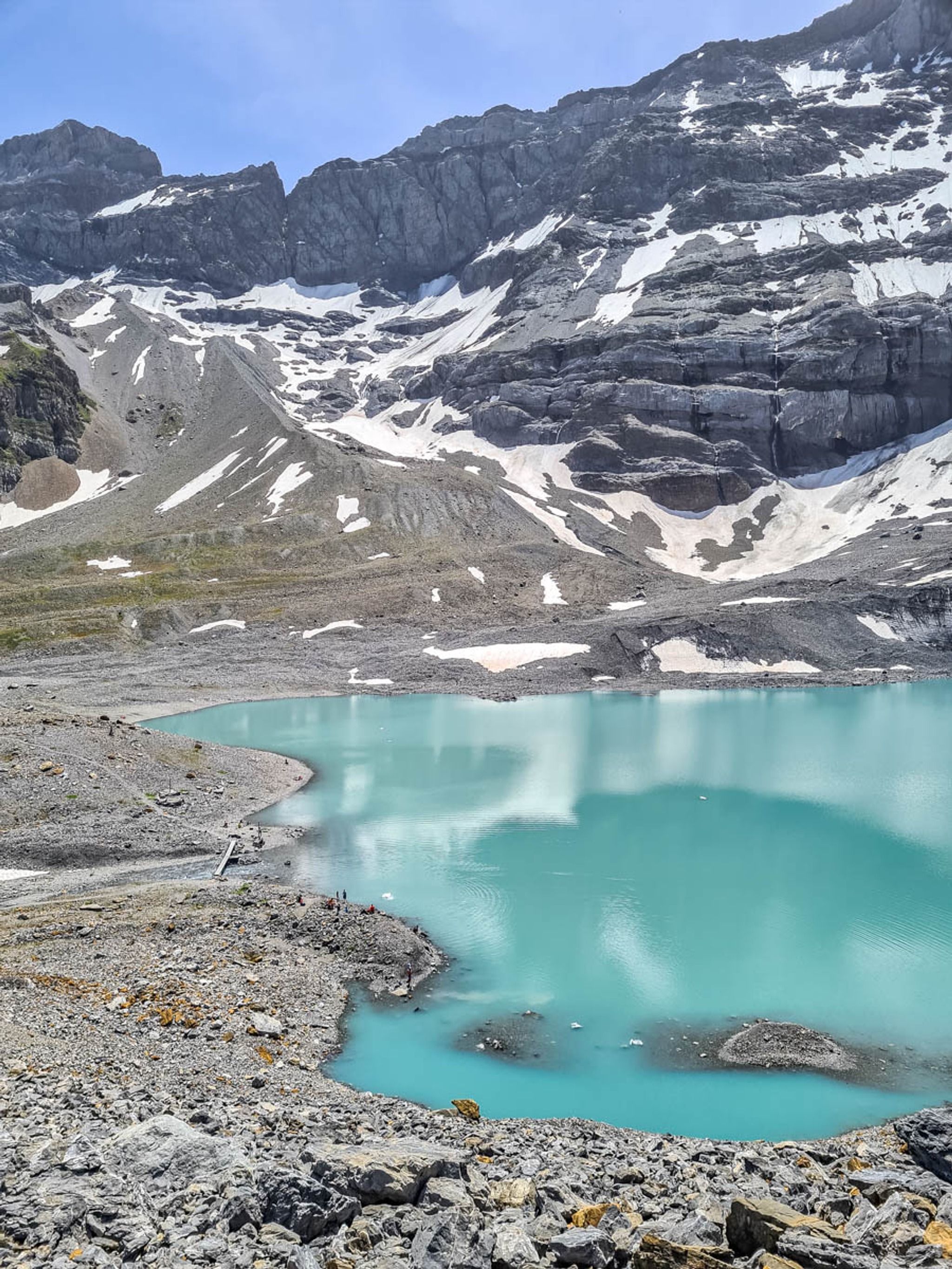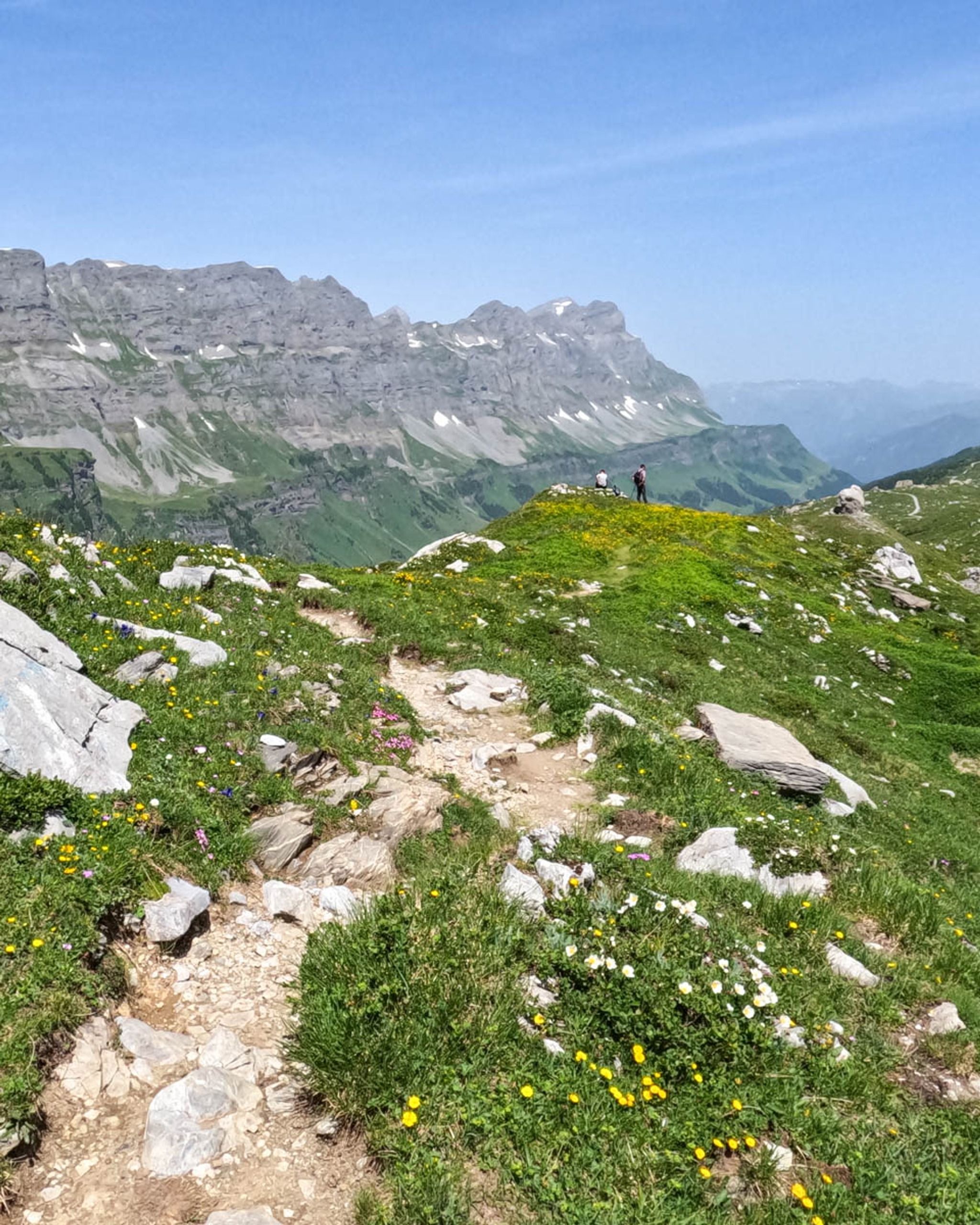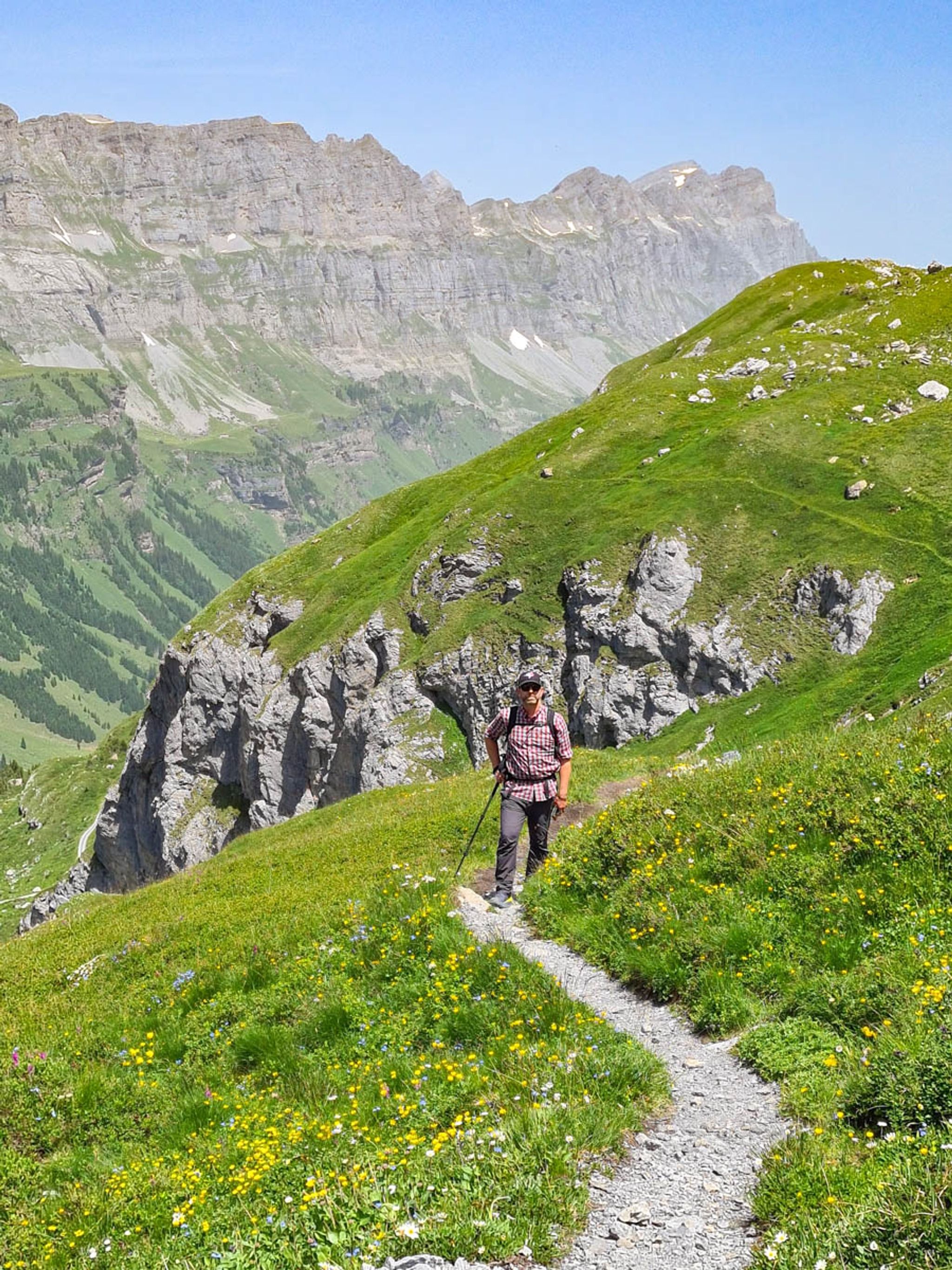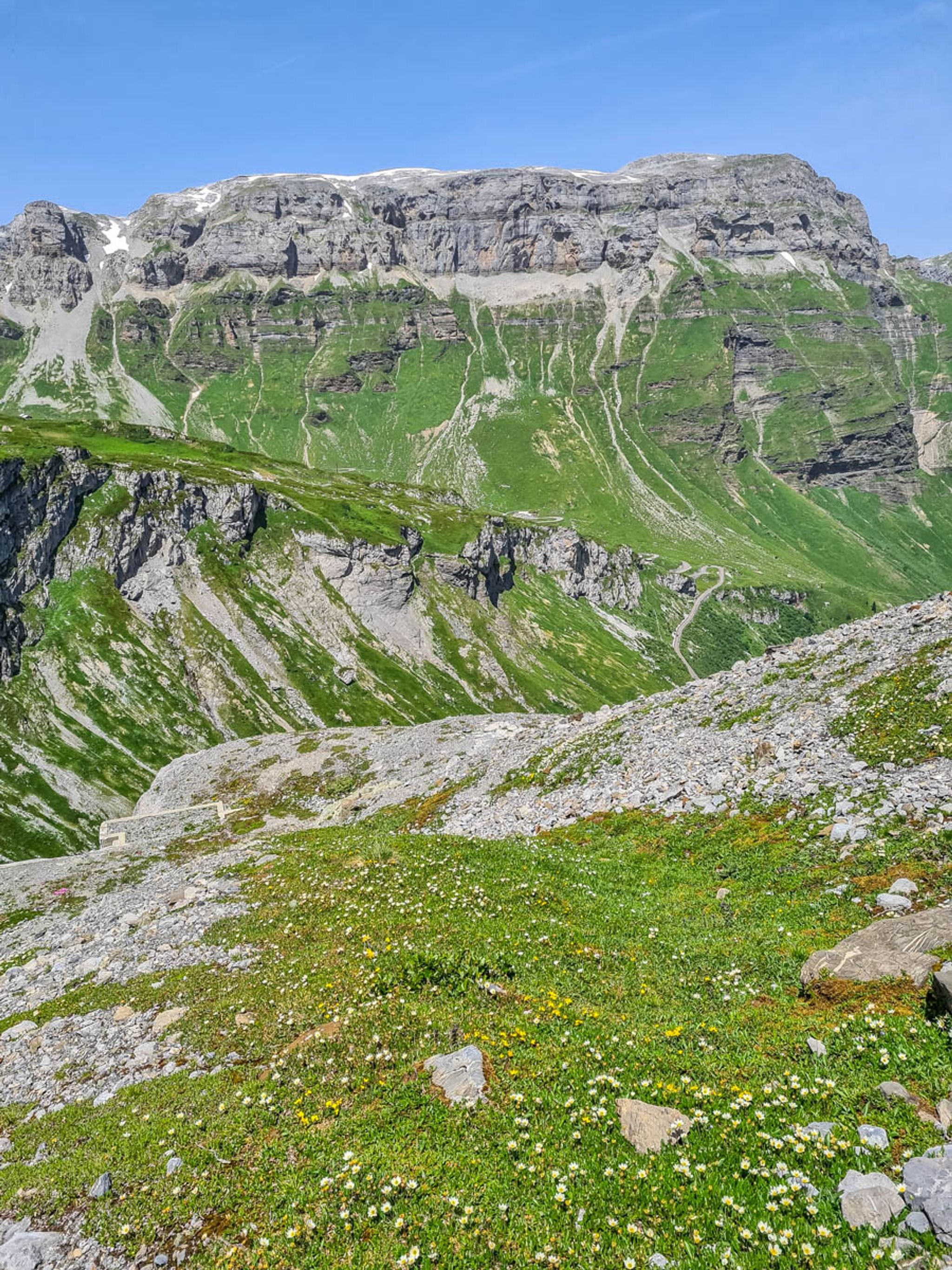 This mountain trail starts at the Klausen Pass and hikes up to a beautiful glacier lake, with bright blue water reflecting the peaks above. Then you traverse the mountain, hiking along cliffs and through alpine meadows with big views all around.