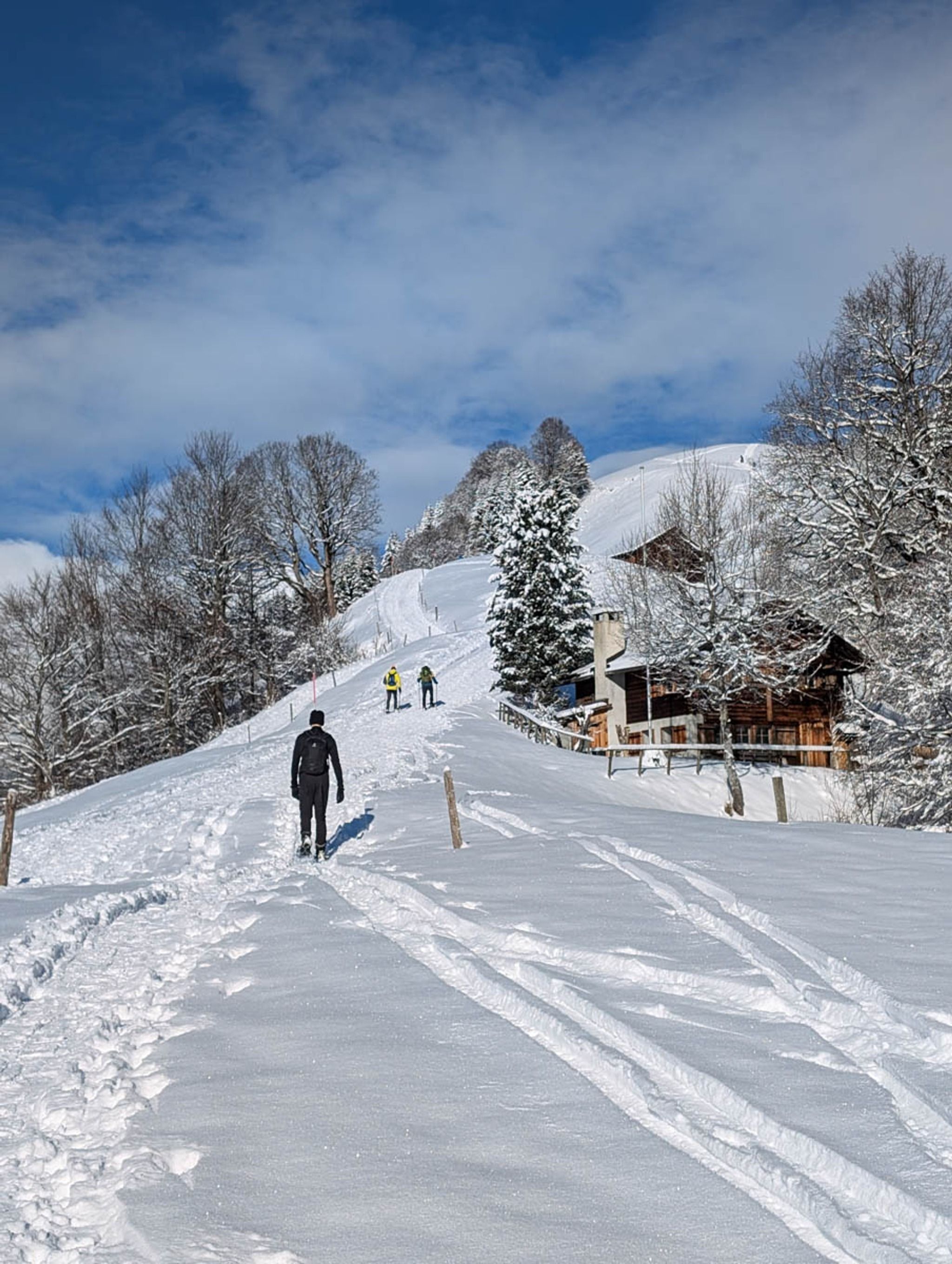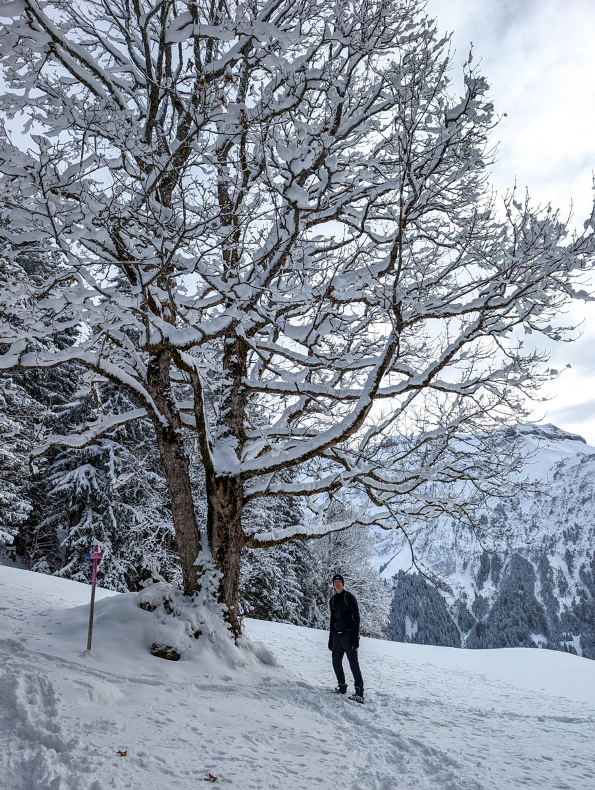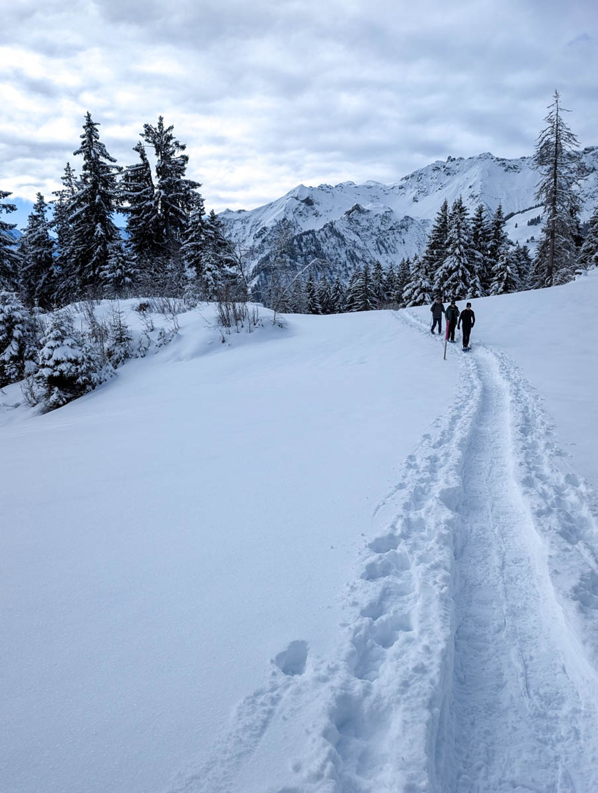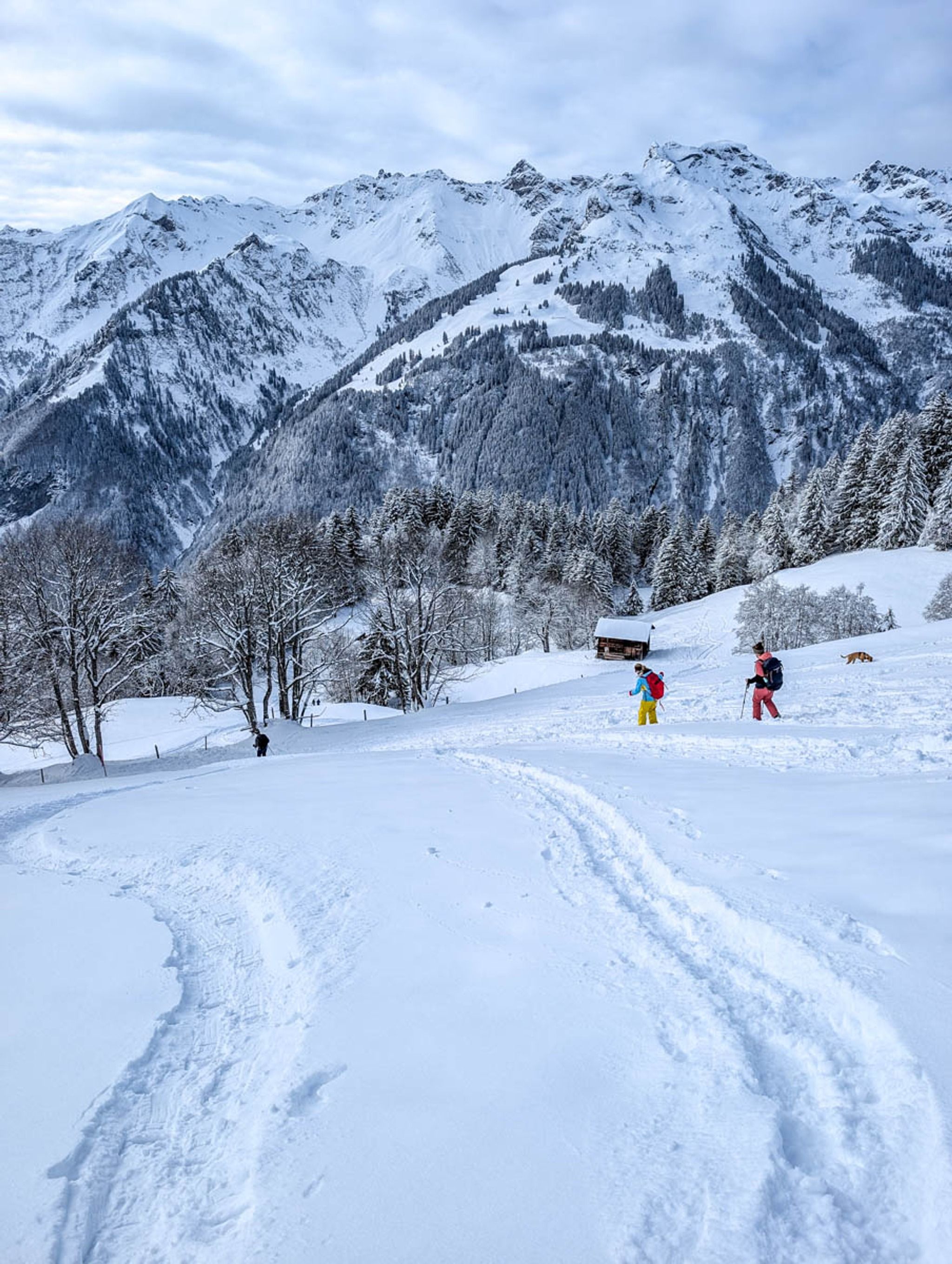 This short snowshoe trail is very charming, wandering above and around a tiny alpine village. Lots of big mountain views and pretty section through a forest, crossing frozen streams. After the hike, you can optionally sled 3k down the mountain, ending at the valley station.