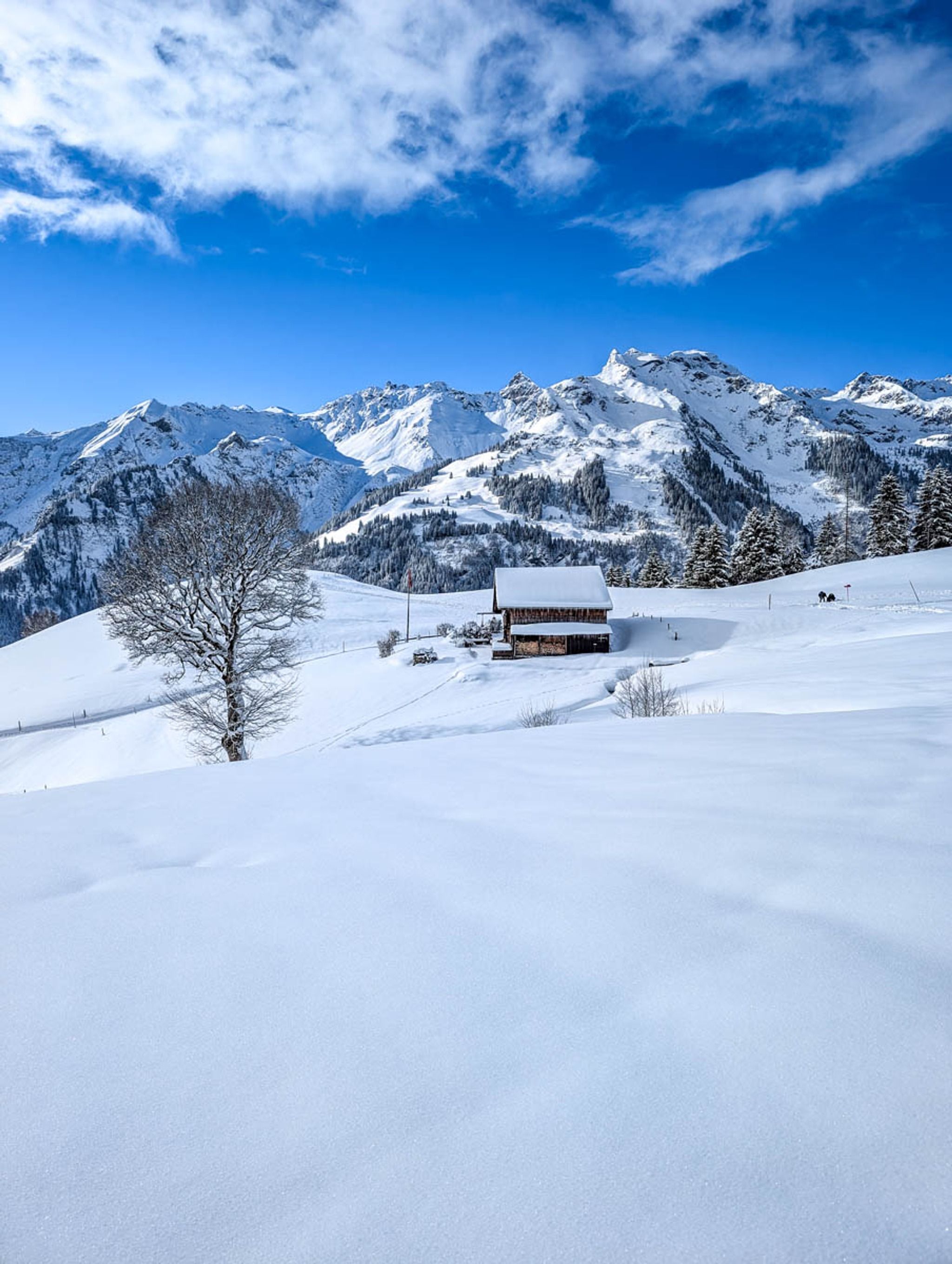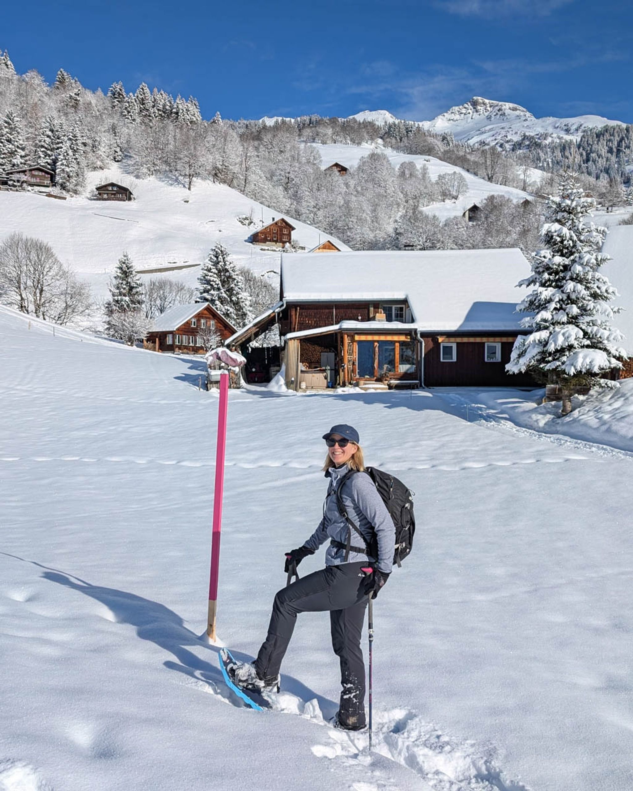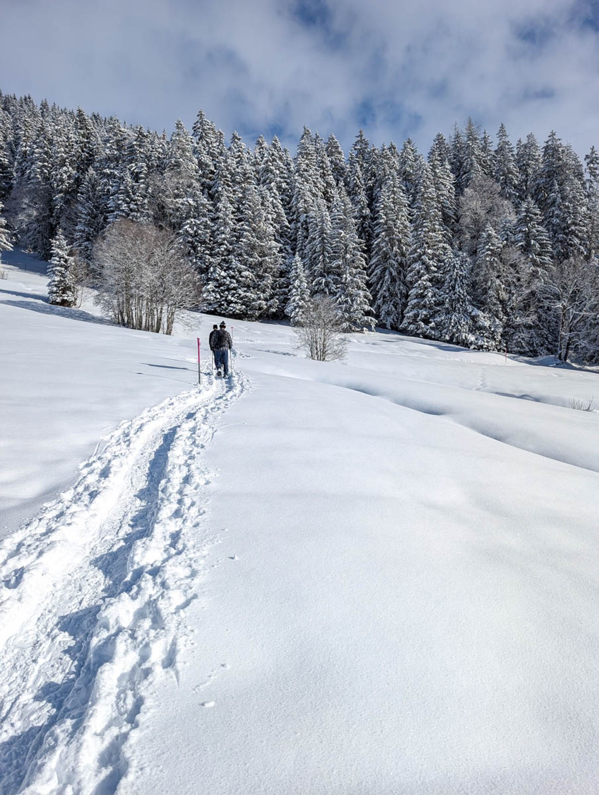 This short snowshoe trail is very charming, wandering above and around a tiny alpine village. Lots of big mountain views and pretty section through a forest, crossing frozen streams. After the hike, you can optionally sled 3k down the mountain, ending at the valley station.