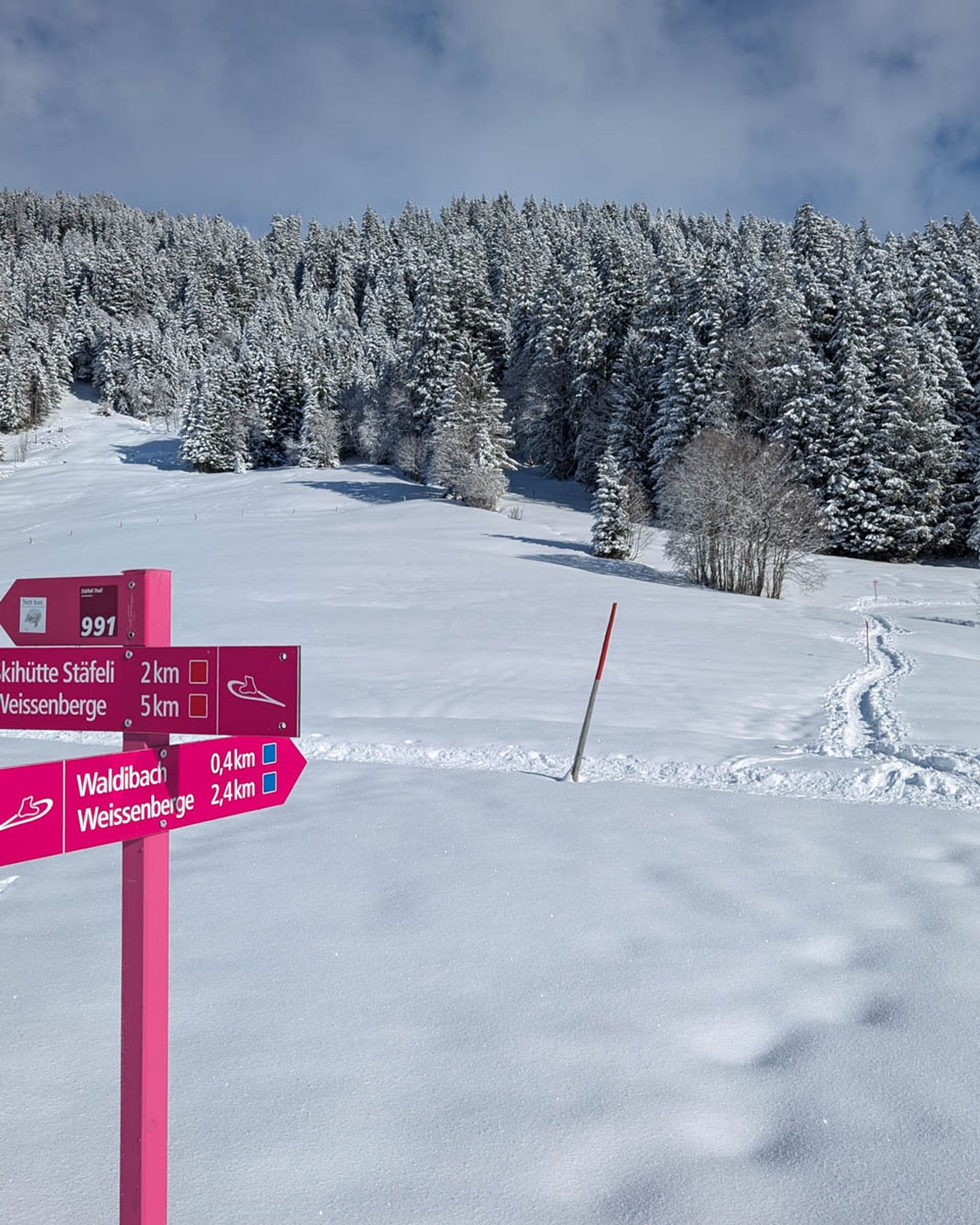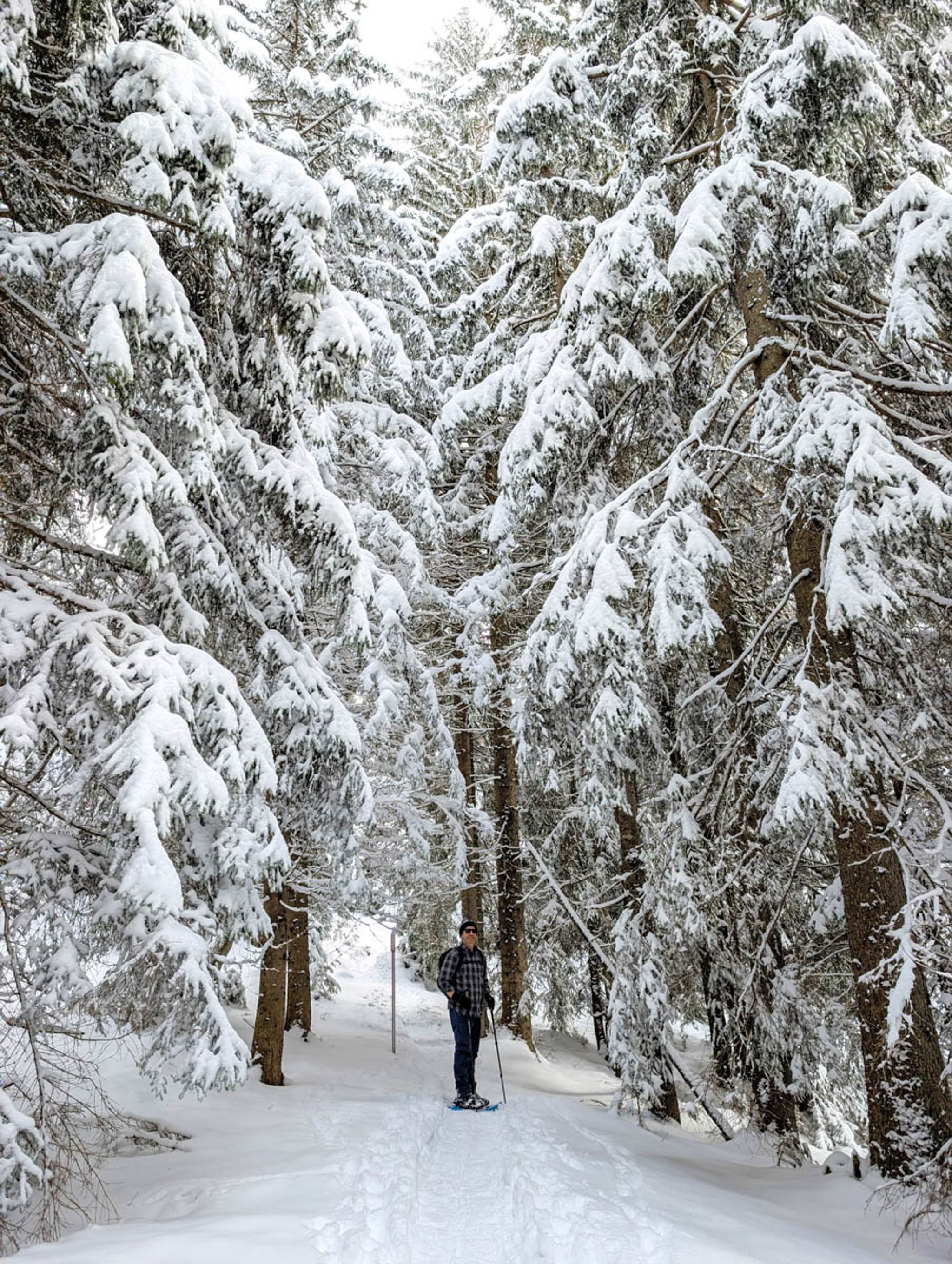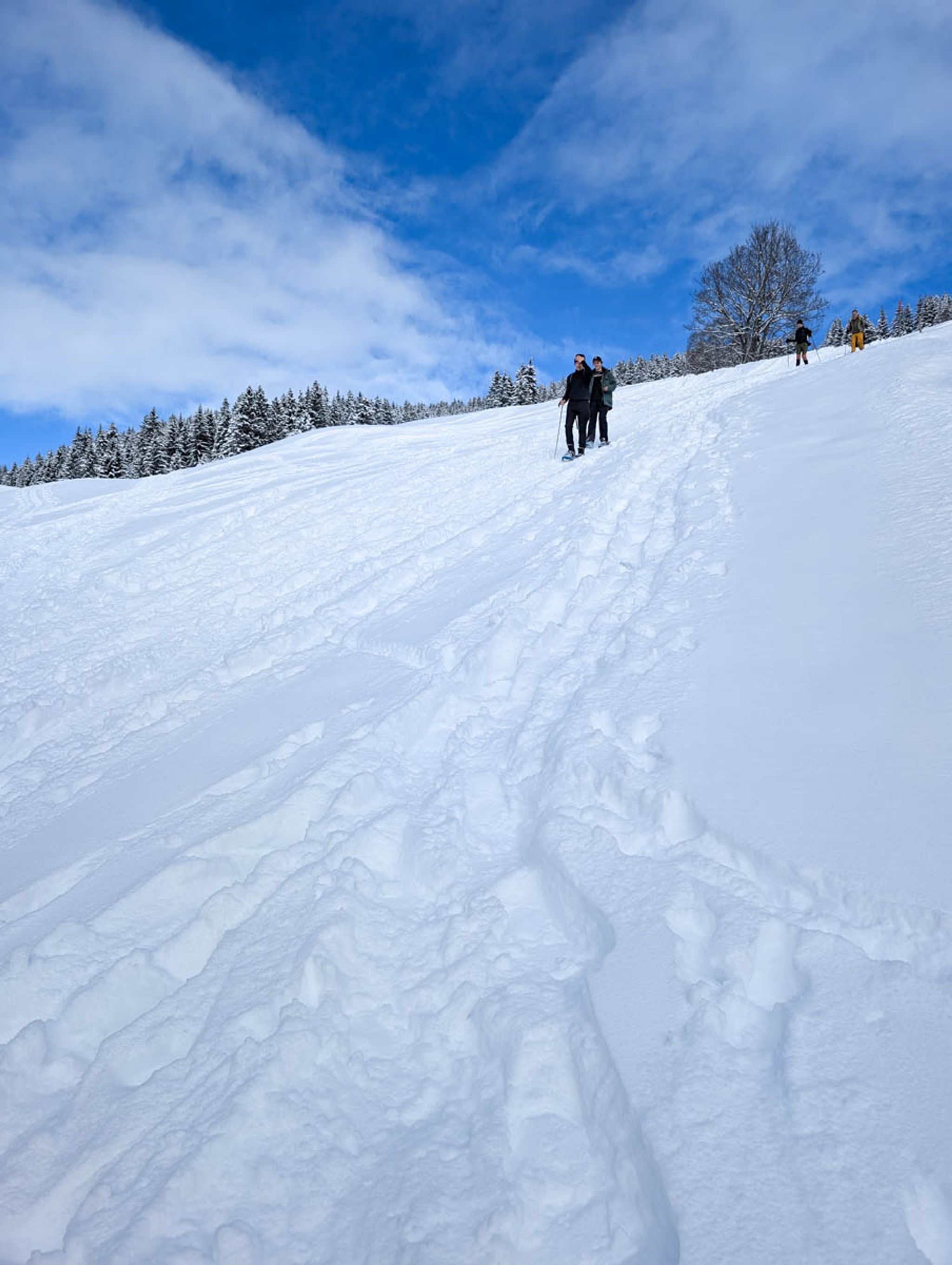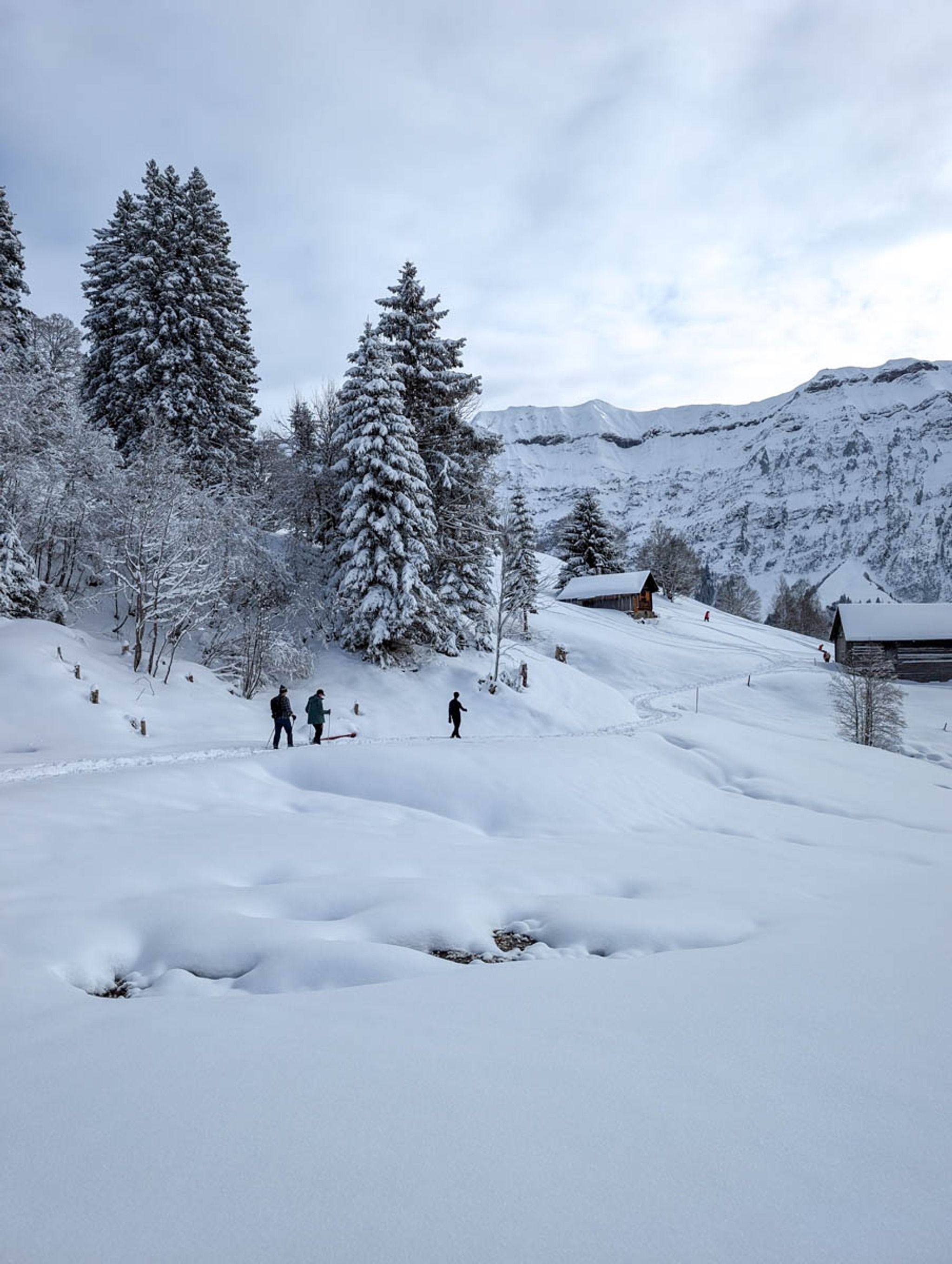This short snowshoe trail is very charming, wandering above and around a tiny alpine village. Lots of big mountain views and pretty section through a forest, crossing frozen streams. After the hike, you can optionally sled 3k down the mountain, ending at the valley station.