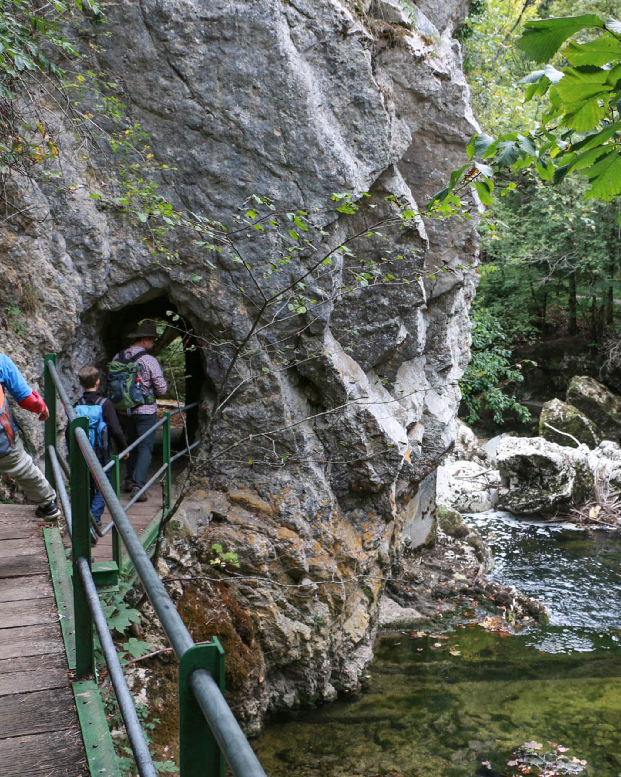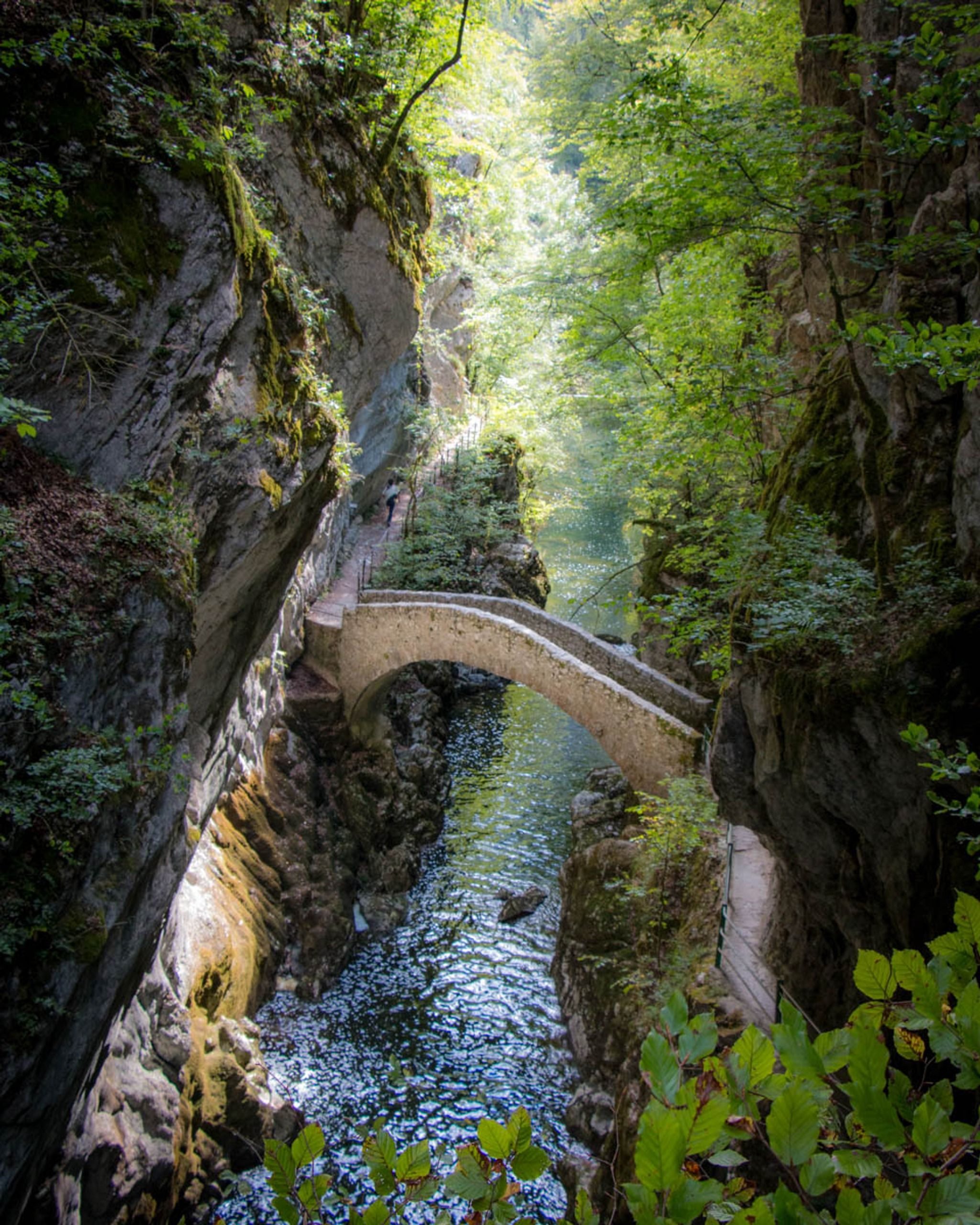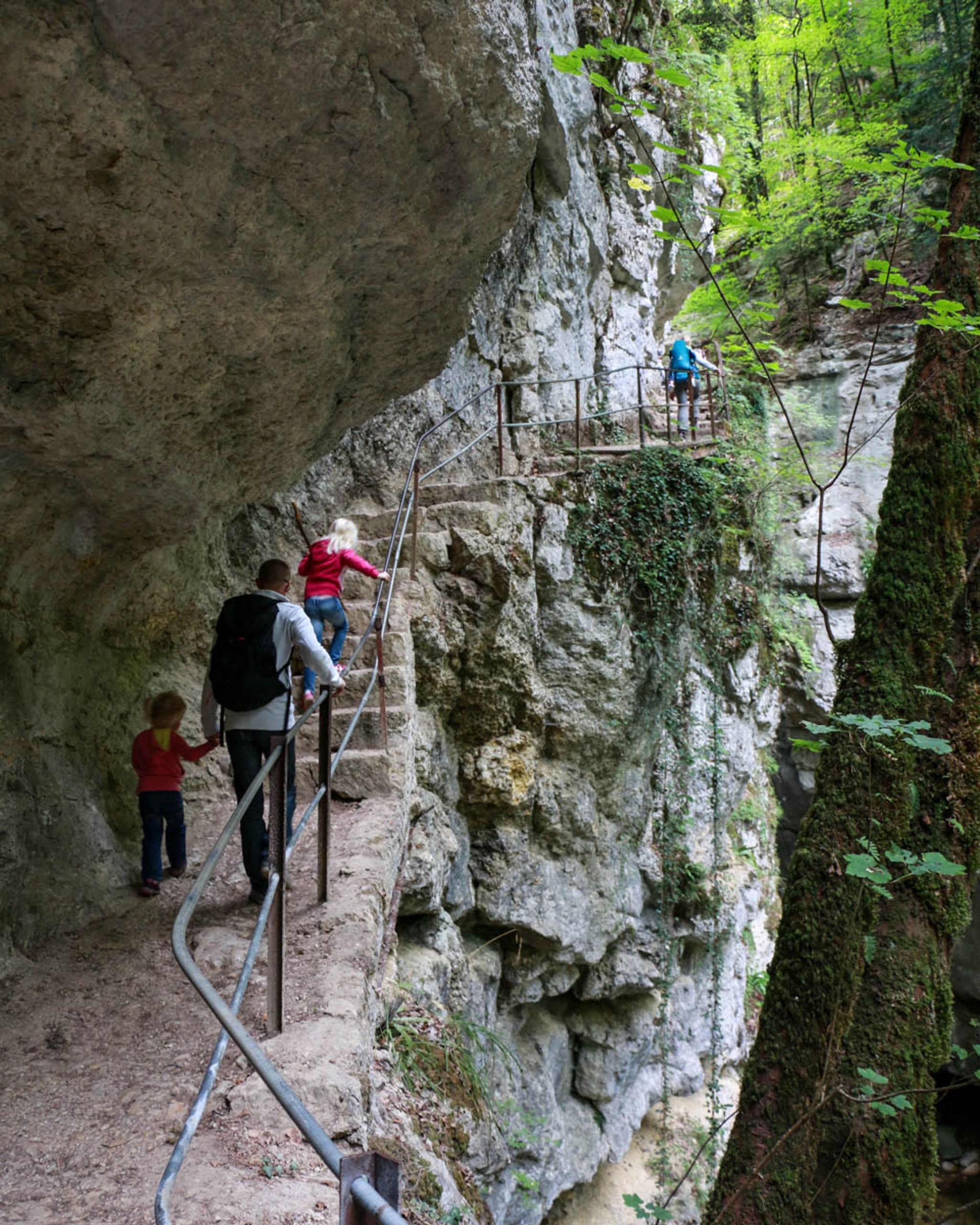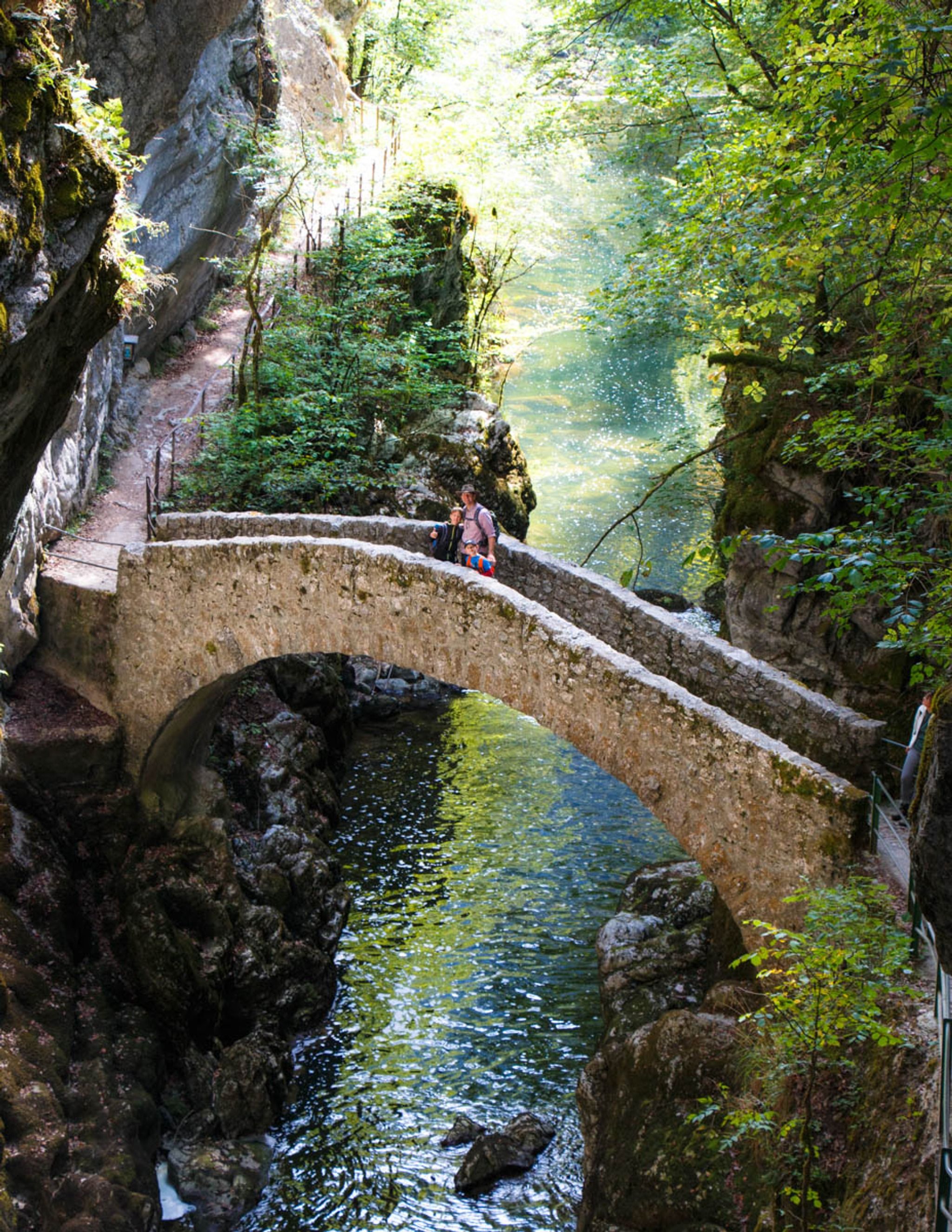 It's a one way trail, from the Noiraigue to Boudry, with train stations on both ends. The Champs du Moulin train station is in the middle, if you want to do just half of the trail. The popular arched bridge is near the end of the first half