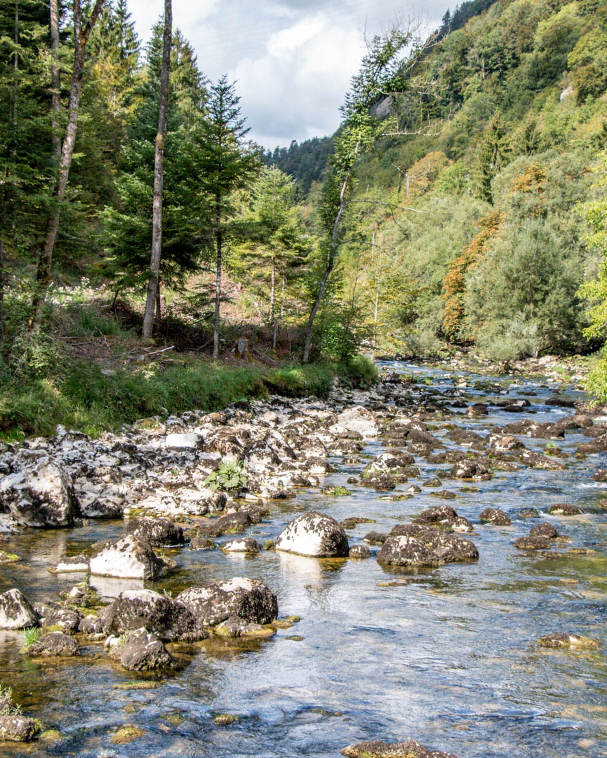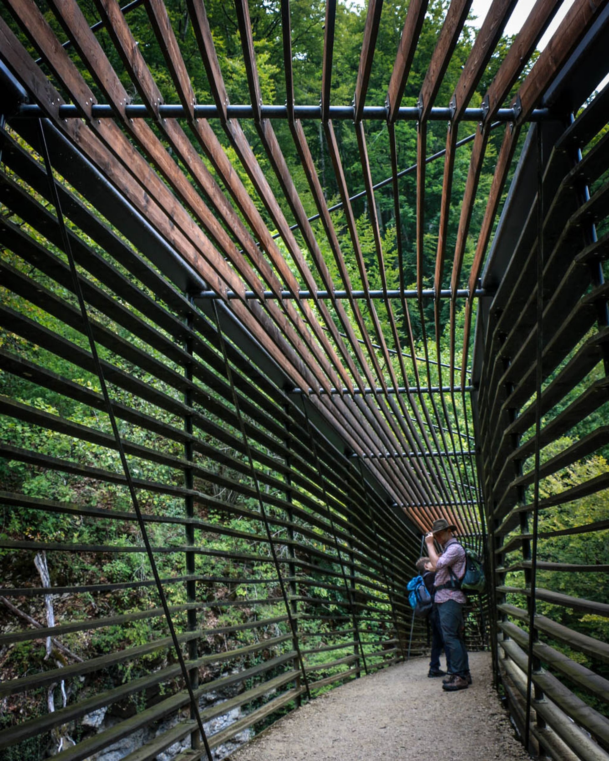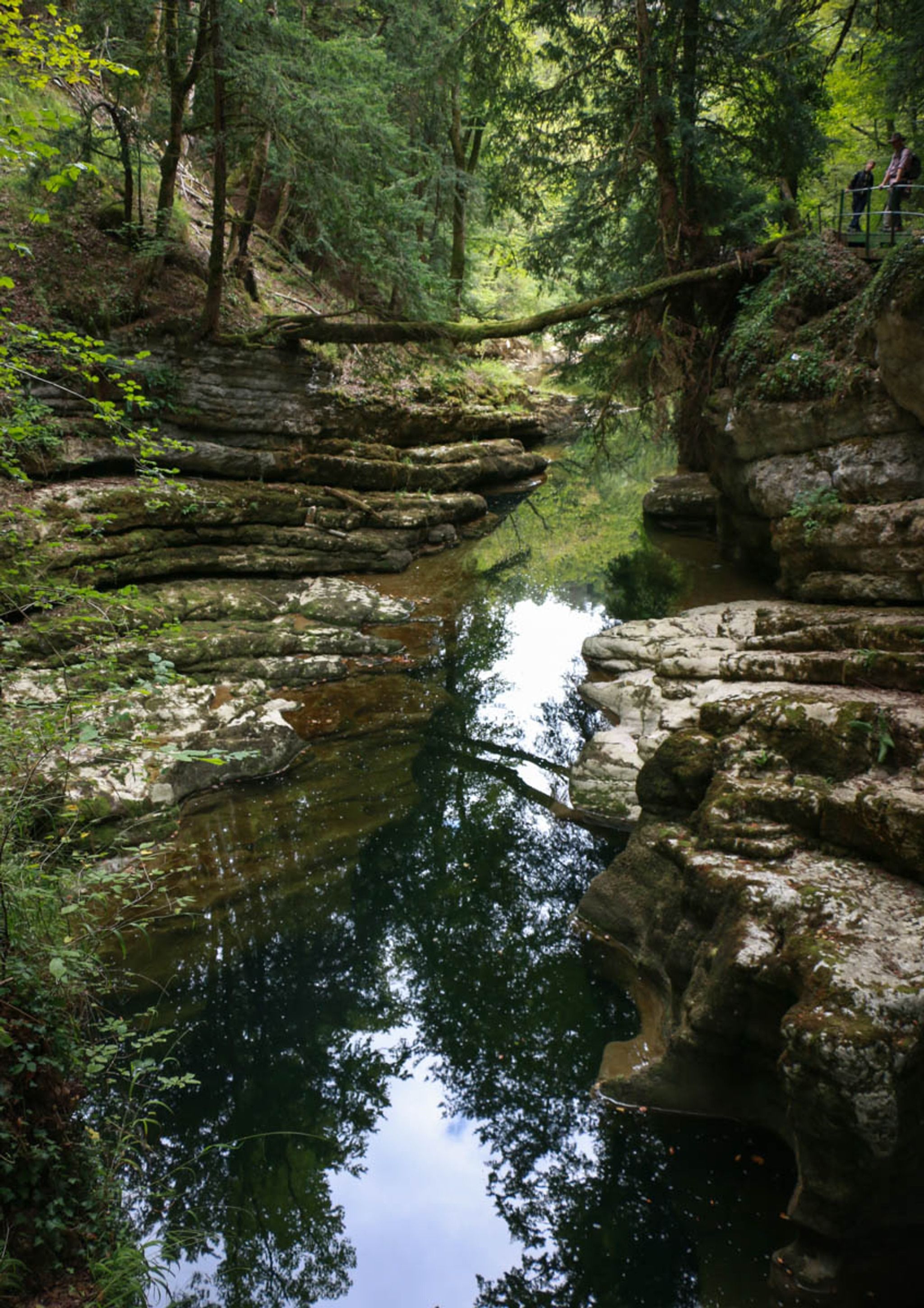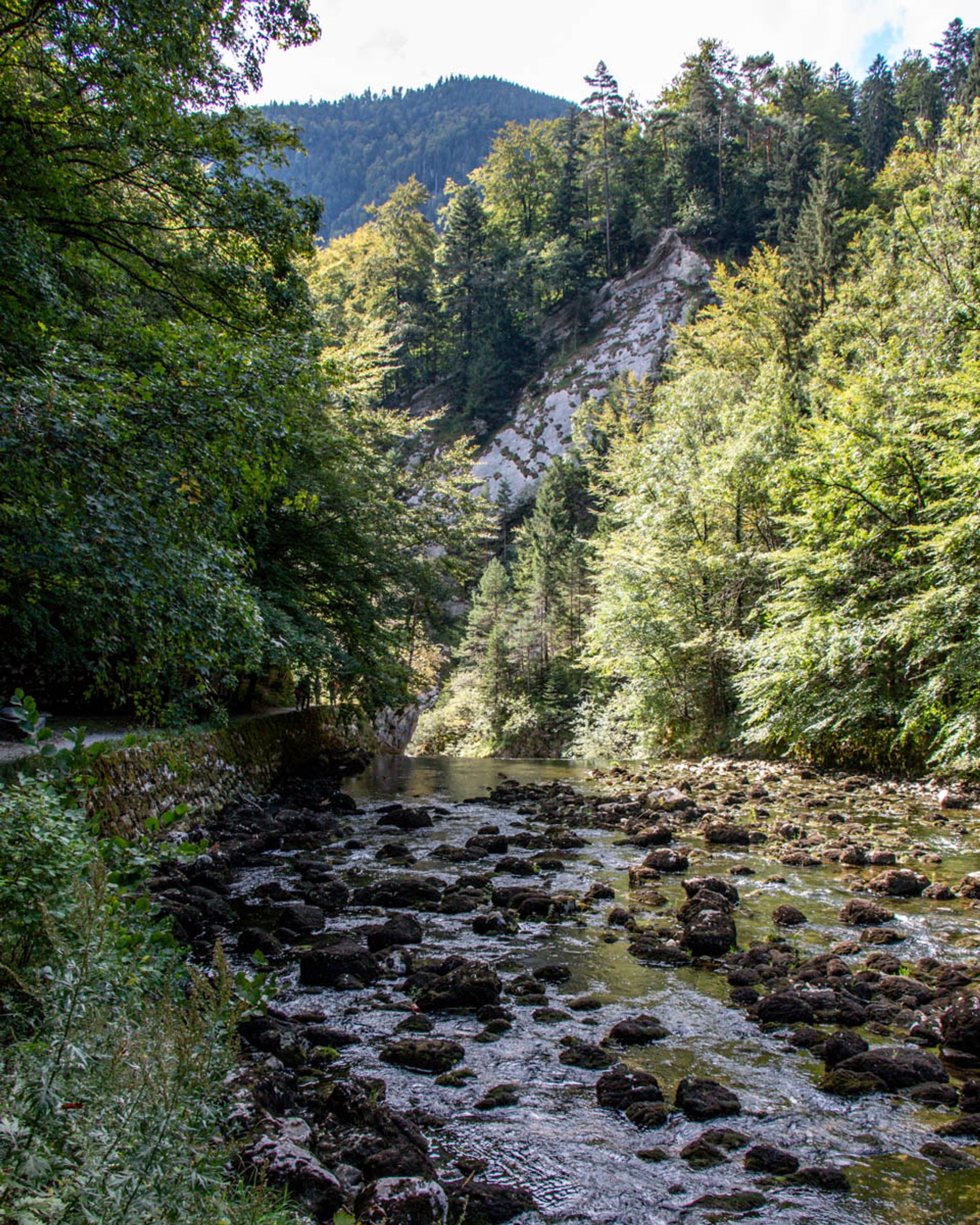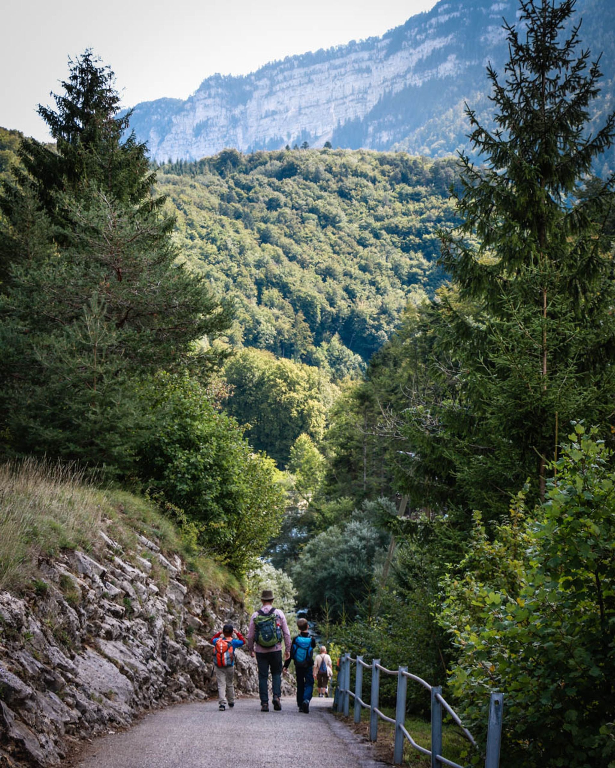 It's a one way trail, from the Noiraigue to Boudry, with train stations on both ends. The Champs du Moulin train station is in the middle, if you want to do just half of the trail. The popular arched bridge is near the end of the first half