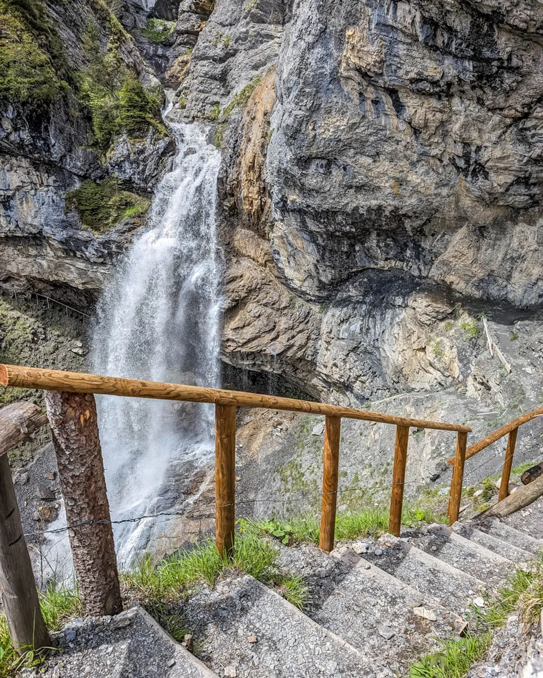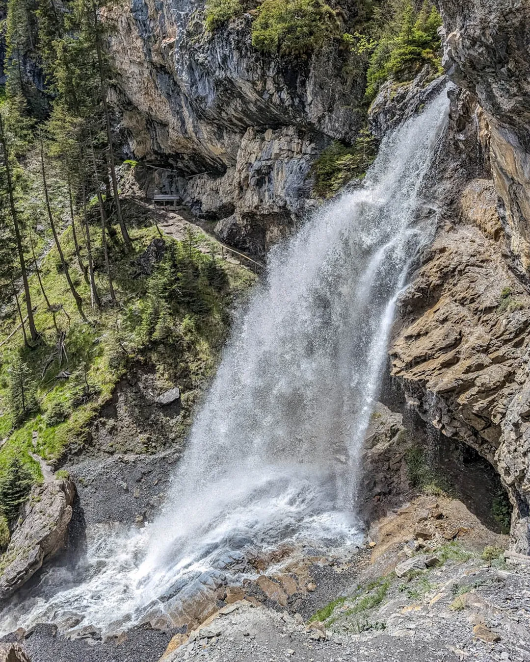 Detour to waterfall: After about an hour of hiking, there is an optional detour to the Sprutz waterfall. It adds about 20 mins to the hike and a bit of difficulty on some steep switchbacks in the forest. But totally worth it to walk under the raging falls. See trail map with waterfall detour.