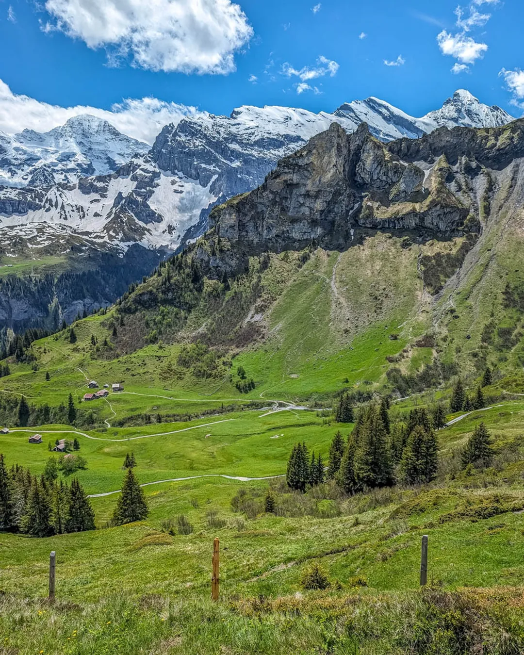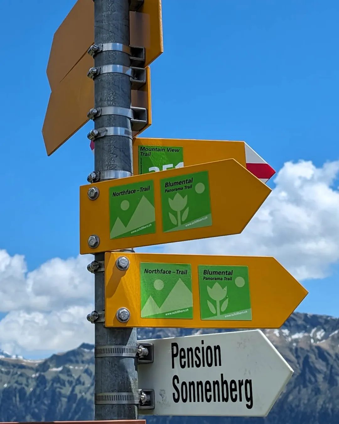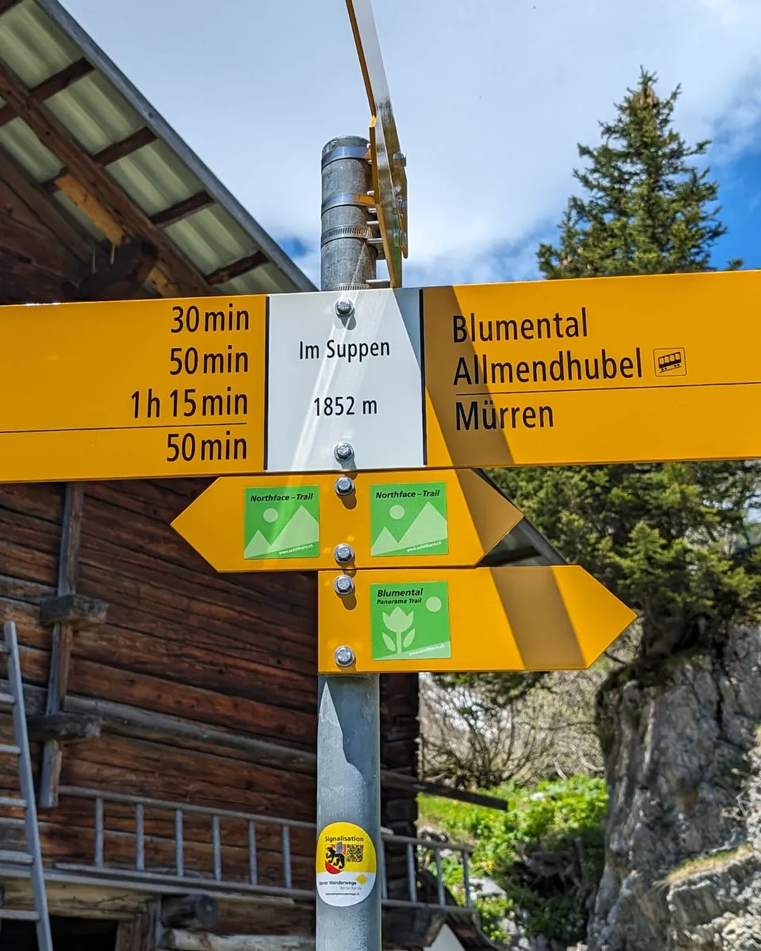 Follow trail signs with the green Northface trail label. The trail ends in the Mürren village.
