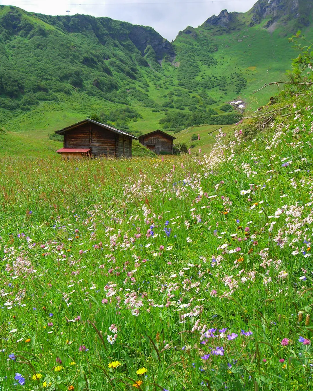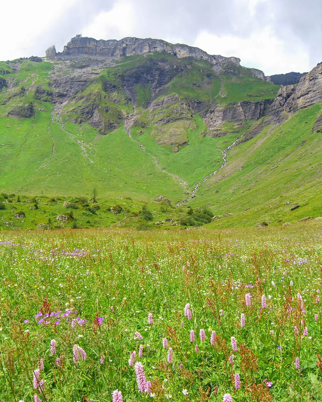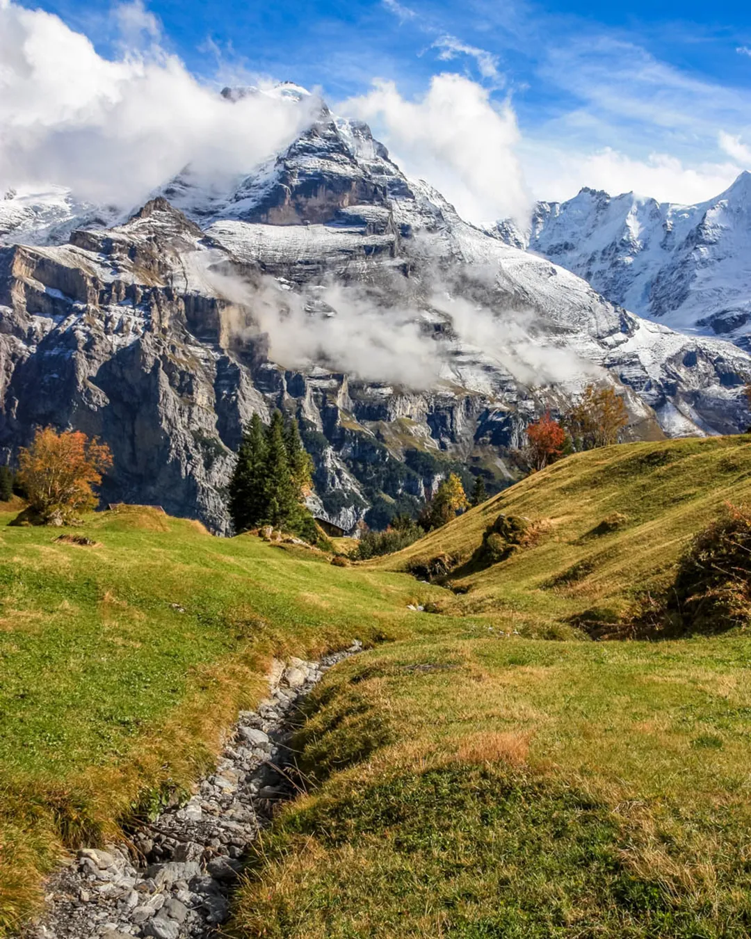 The Northface Trail in Mürren, Switzerland is a picturesque hiking trail that offers stunning mountain views and meadows bursting with wildflowers in summer.