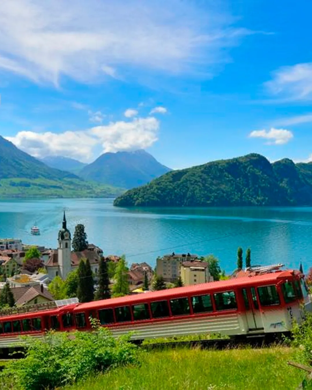 This cogwheel train travels from the lakeshore village Vitznau to the Rigi Kulm mountain viewpoint.