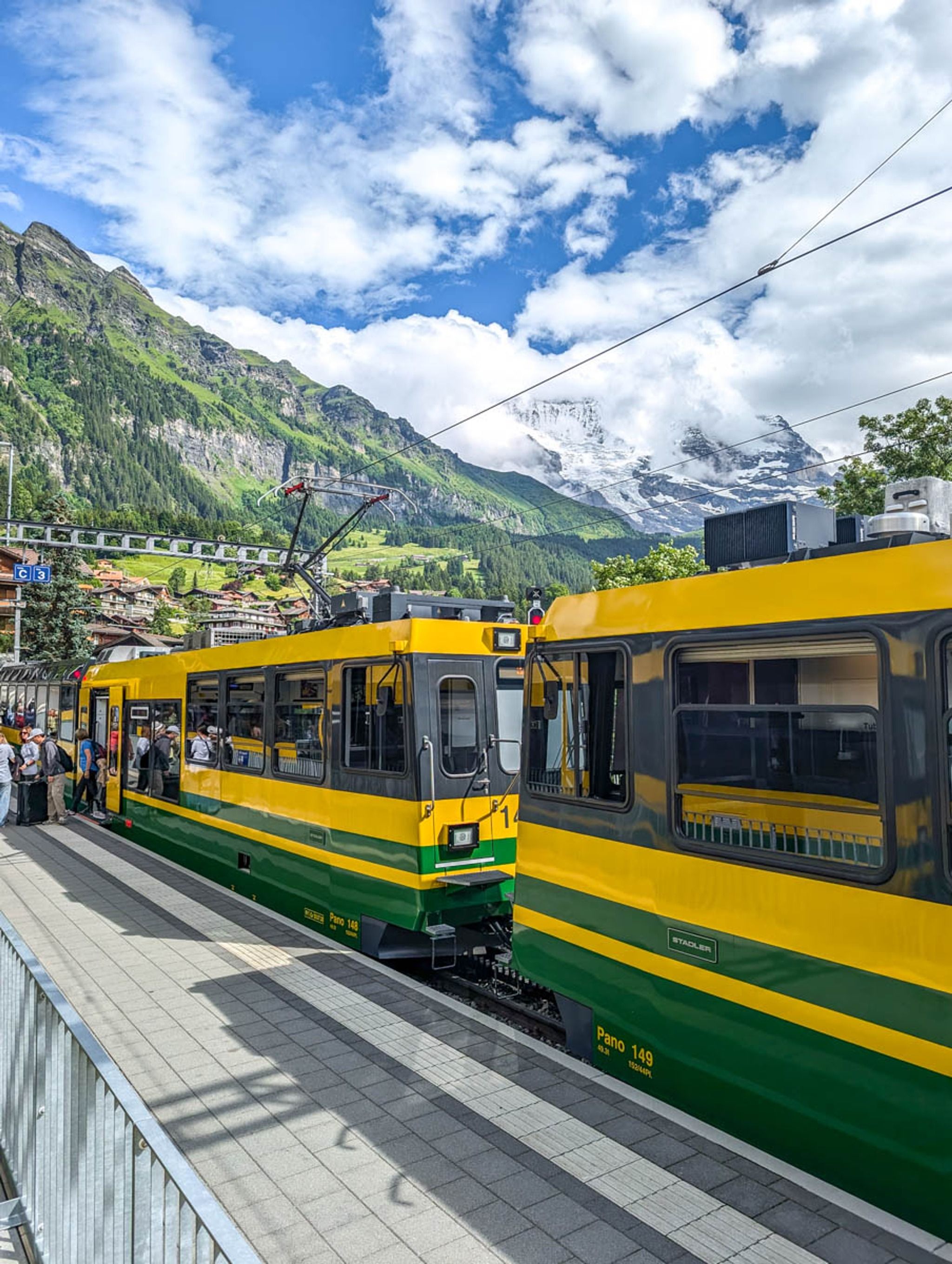 From Interlaken or Grindelwald, ride a train to Lauterbrunnen. Then transfer to the yellow Wengeralpbahn train at the same station. From Interlaken or Mürren 22 mins, Grindelwald 39 mins