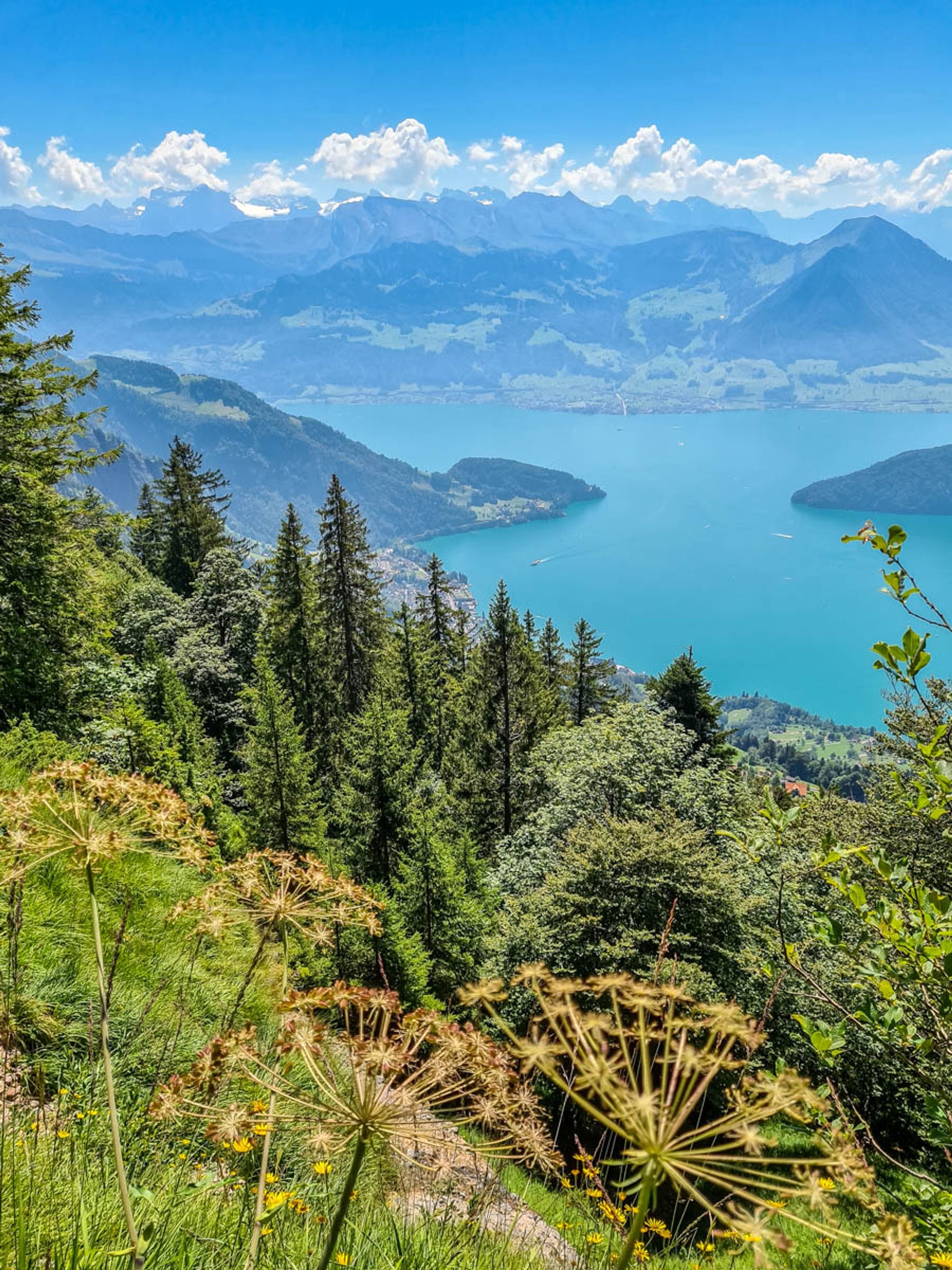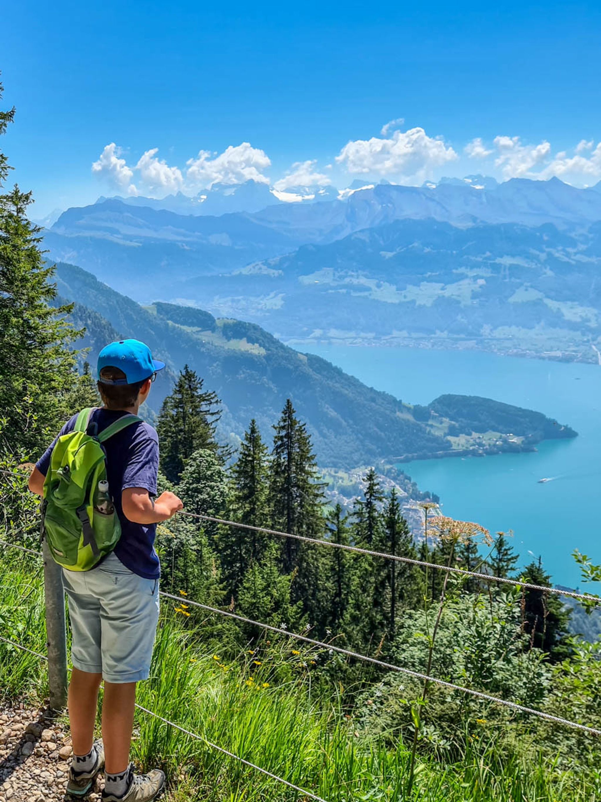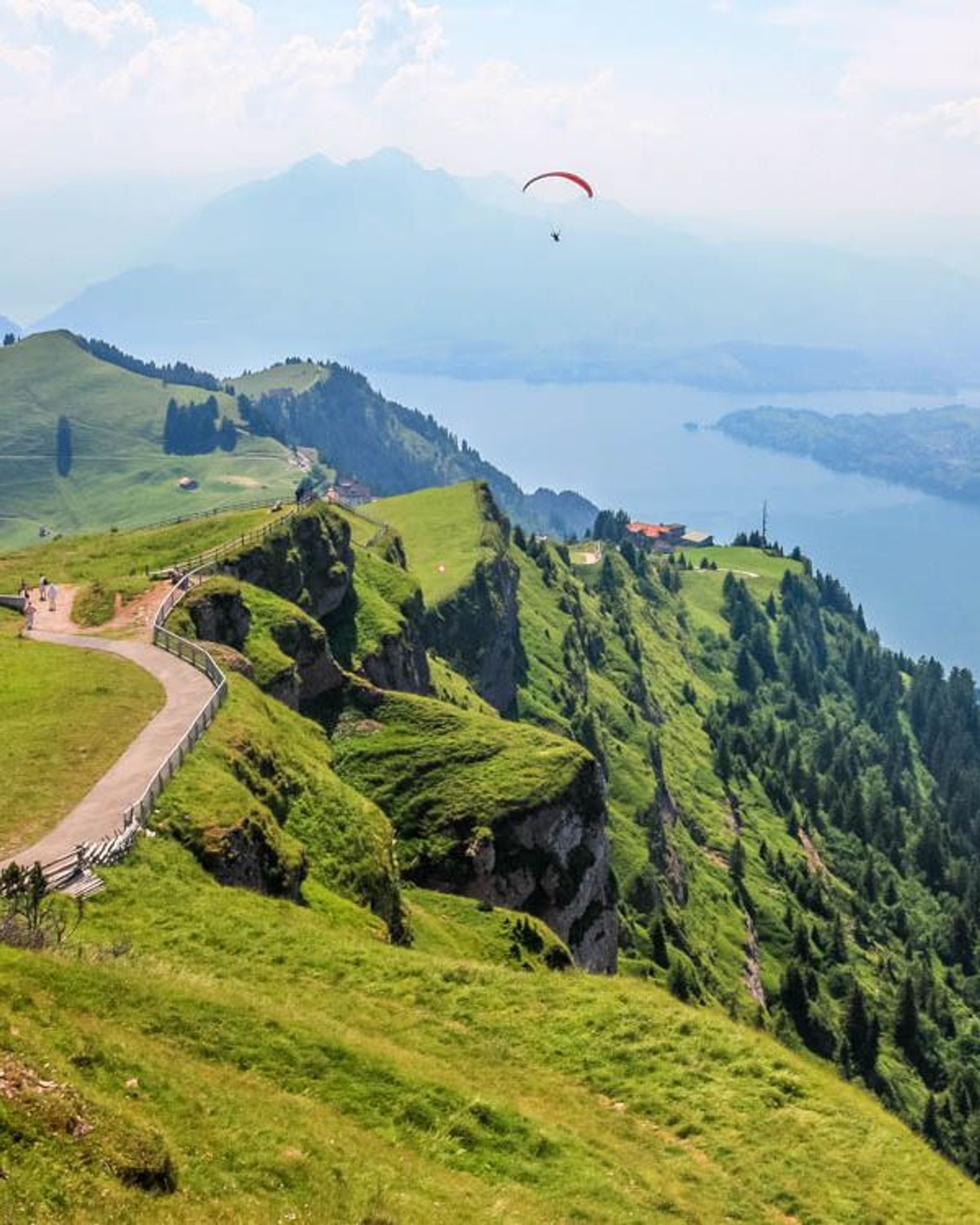 Along the way, you'll enjoying beautiful views of Lake Lucerne and surrounding mountains, as well as alpine meadows and forests. The hike includes the Rigi First Cliff Walk, a short section of the trail carved into the side of a cliff wall.