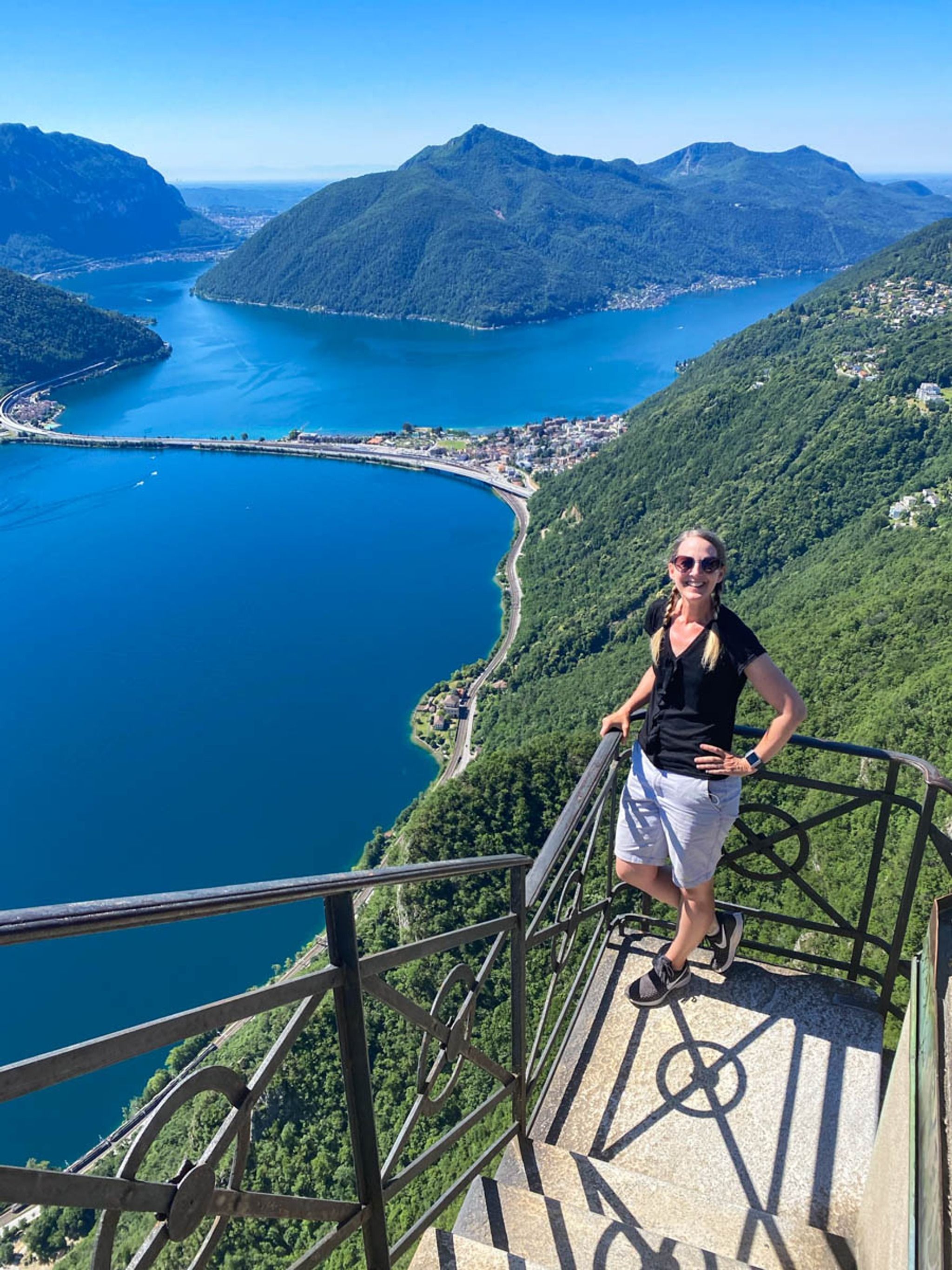 Then a short walk up to the panorama viewing area over Lake Lugano, safely enclosed by a fence. There's a tiny church on the top of this mountain. With a little extra effort, you can climb some narrow steps to the church roof for the best viewpoint.