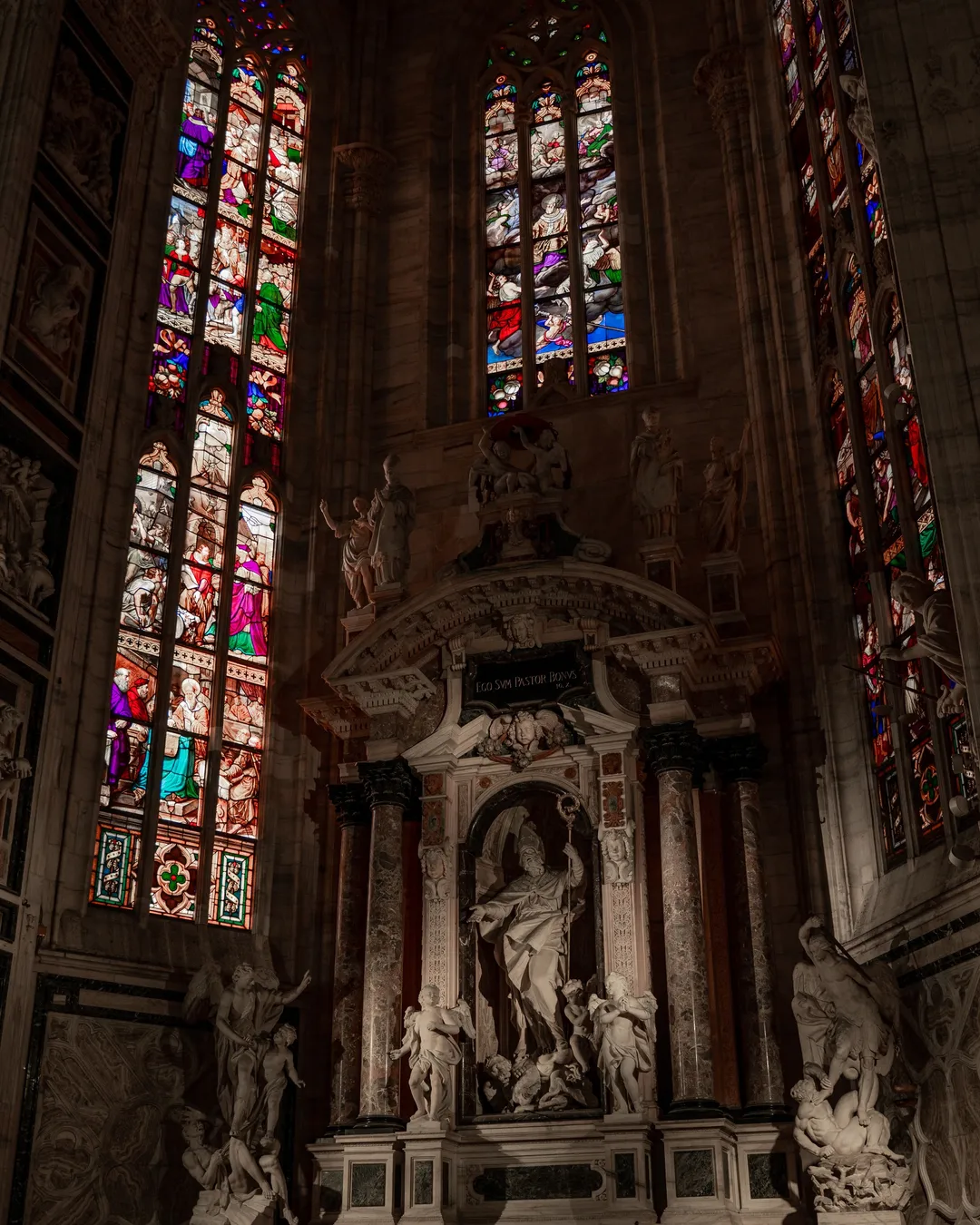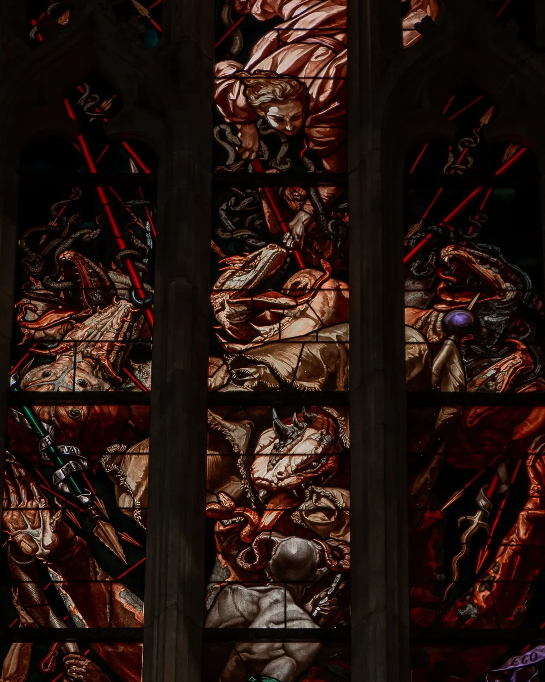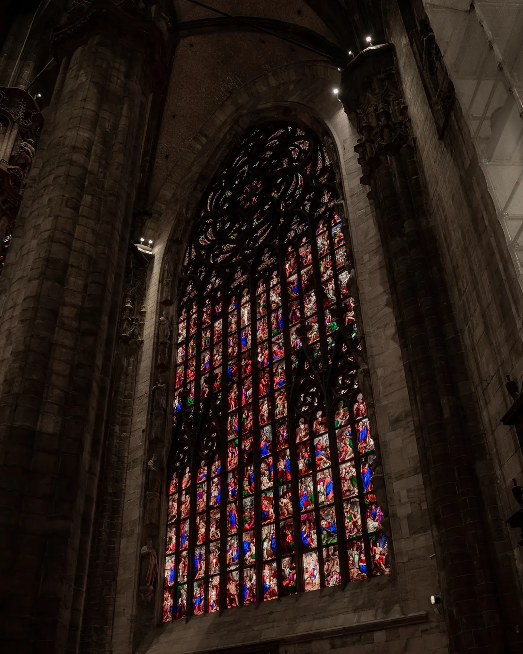Once you have admired the cathedral’s external beauty head inside to see its mesmerising Gothic details and history. I was instantly in awe of the scale and elegance of the stained-glass windows including 100’s of meticulously created scenes which were designed to complement the architecture of the cathedral. The windows use rich colour palettes, intricate figural representations and a contrasting focus on light and dark for dramatic effect. The Duomo contains 55 magnificent stained-glass pieces, but I would highly recommend taking some extra time to view the window entitled “The Fight between St. Michael and the Demons” which is located along the northern wall. The thematic elements include depictions of good and evil in a duel, showing Archangel Michael fighting against the demons. If you look closely, you will see the snakes, devils and dark creatures, which feature in this phenomenal piece of art.