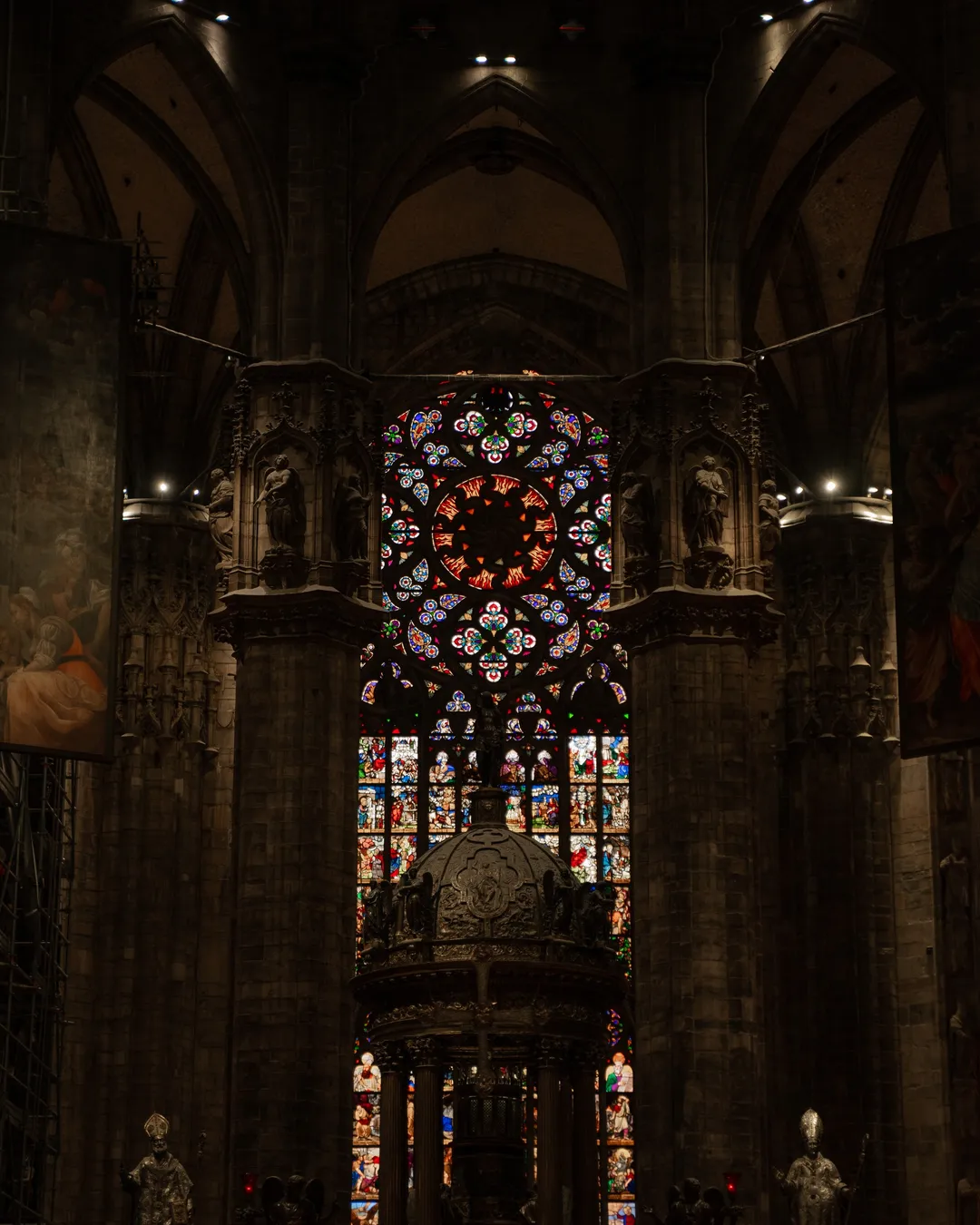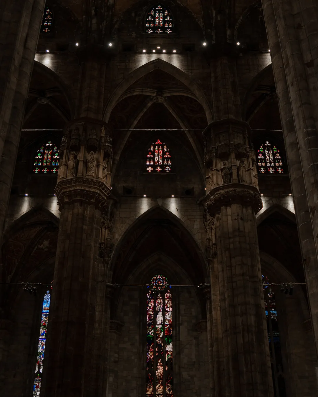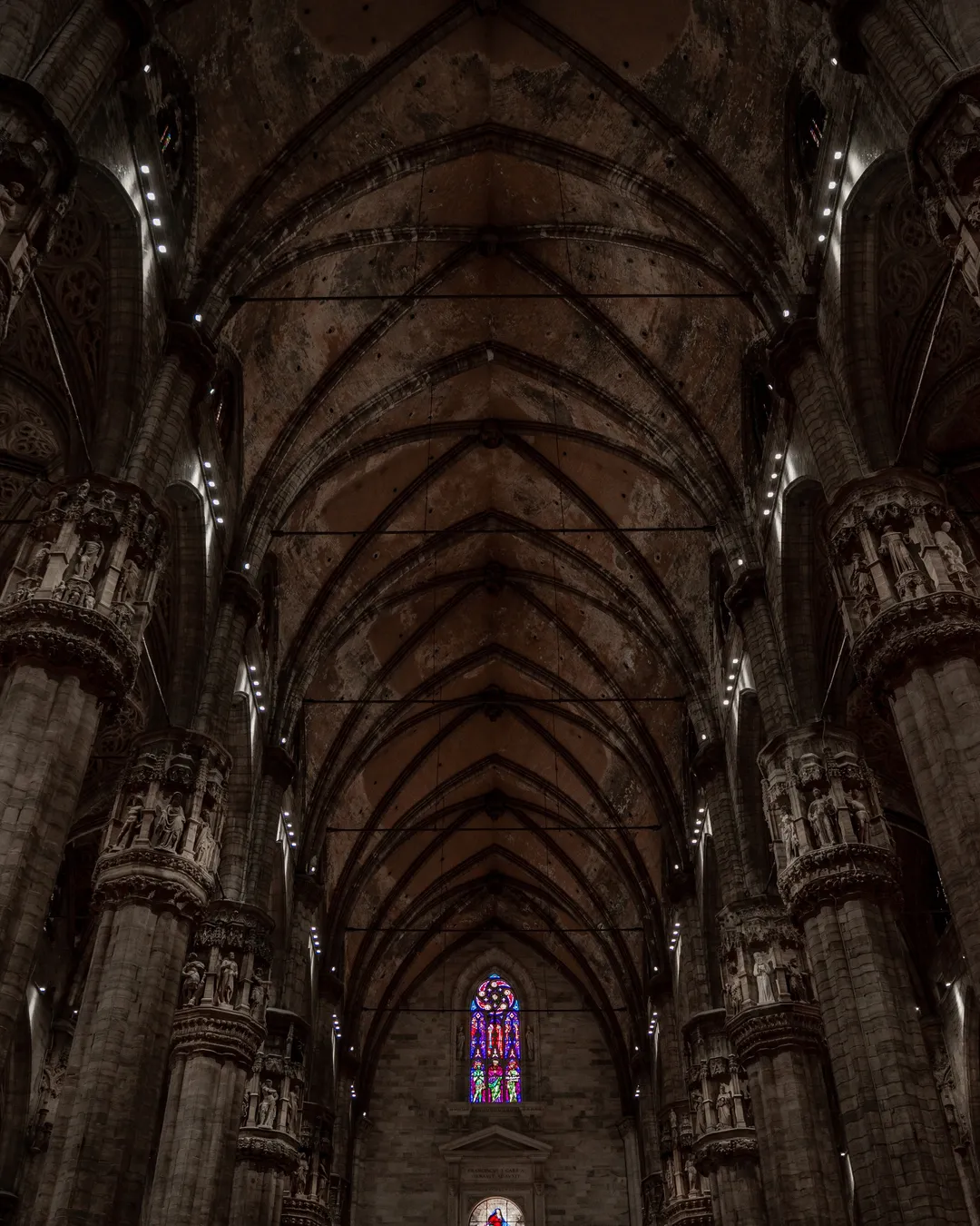 Once you have admired the cathedral’s external beauty head inside to see its mesmerising Gothic details and history. I was instantly in awe of the scale and elegance of the stained-glass windows including 100’s of meticulously created scenes which were designed to complement the architecture of the cathedral. The windows use rich colour palettes, intricate figural representations and a contrasting focus on light and dark for dramatic effect. The Duomo contains 55 magnificent stained-glass pieces, but I would highly recommend taking some extra time to view the window entitled “The Fight between St. Michael and the Demons” which is located along the northern wall. The thematic elements include depictions of good and evil in a duel, showing Archangel Michael fighting against the demons. If you look closely, you will see the snakes, devils and dark creatures, which feature in this phenomenal piece of art.