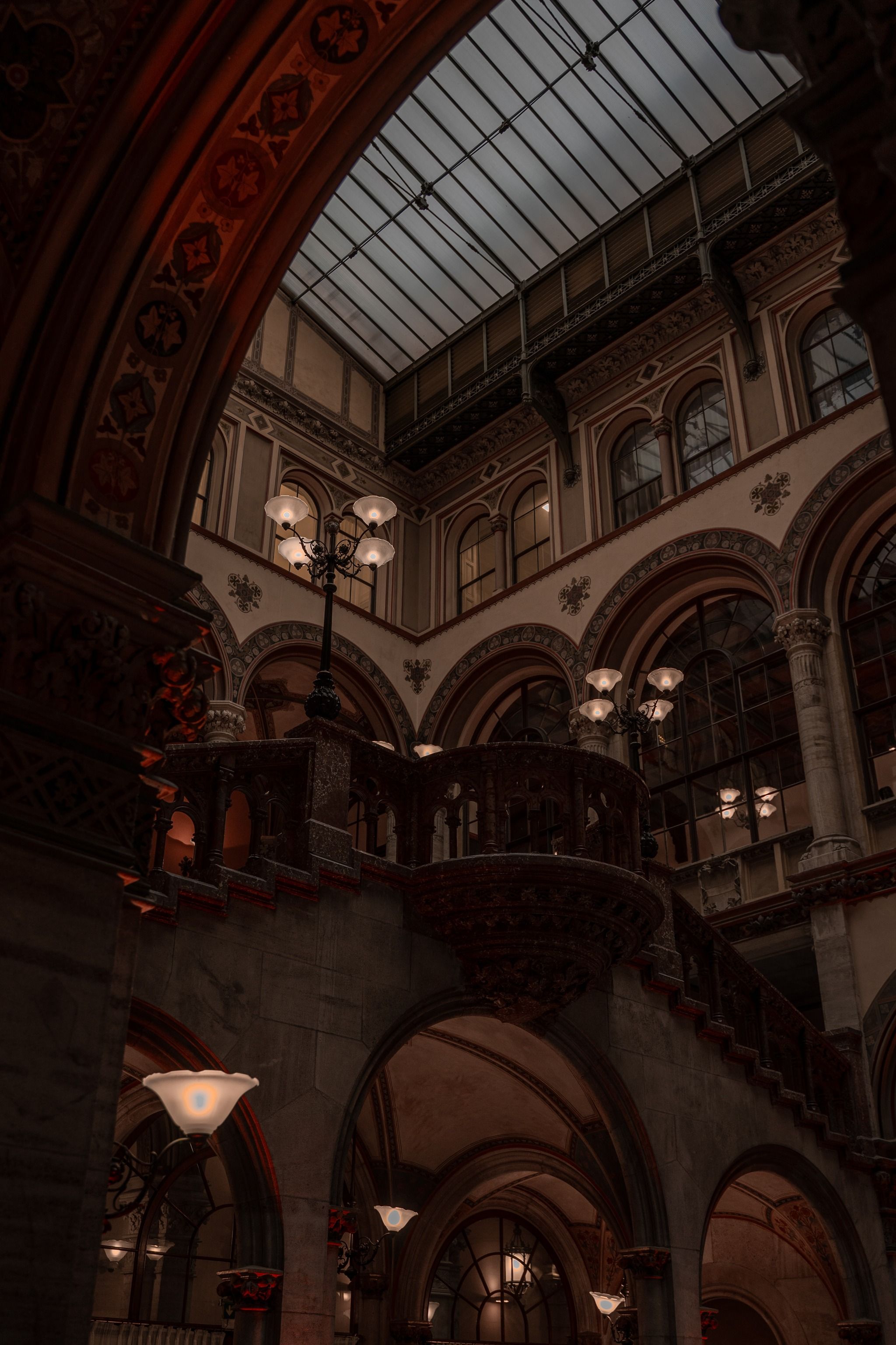 The interior is a masterpiece of late 19th century grandeur with high, vaulted ceilings supported by slender columns crowned with ornate capitals. Light pools beneath the arches in warm, amber tones, illuminating marble floors and polished wood with a soft golden glow.