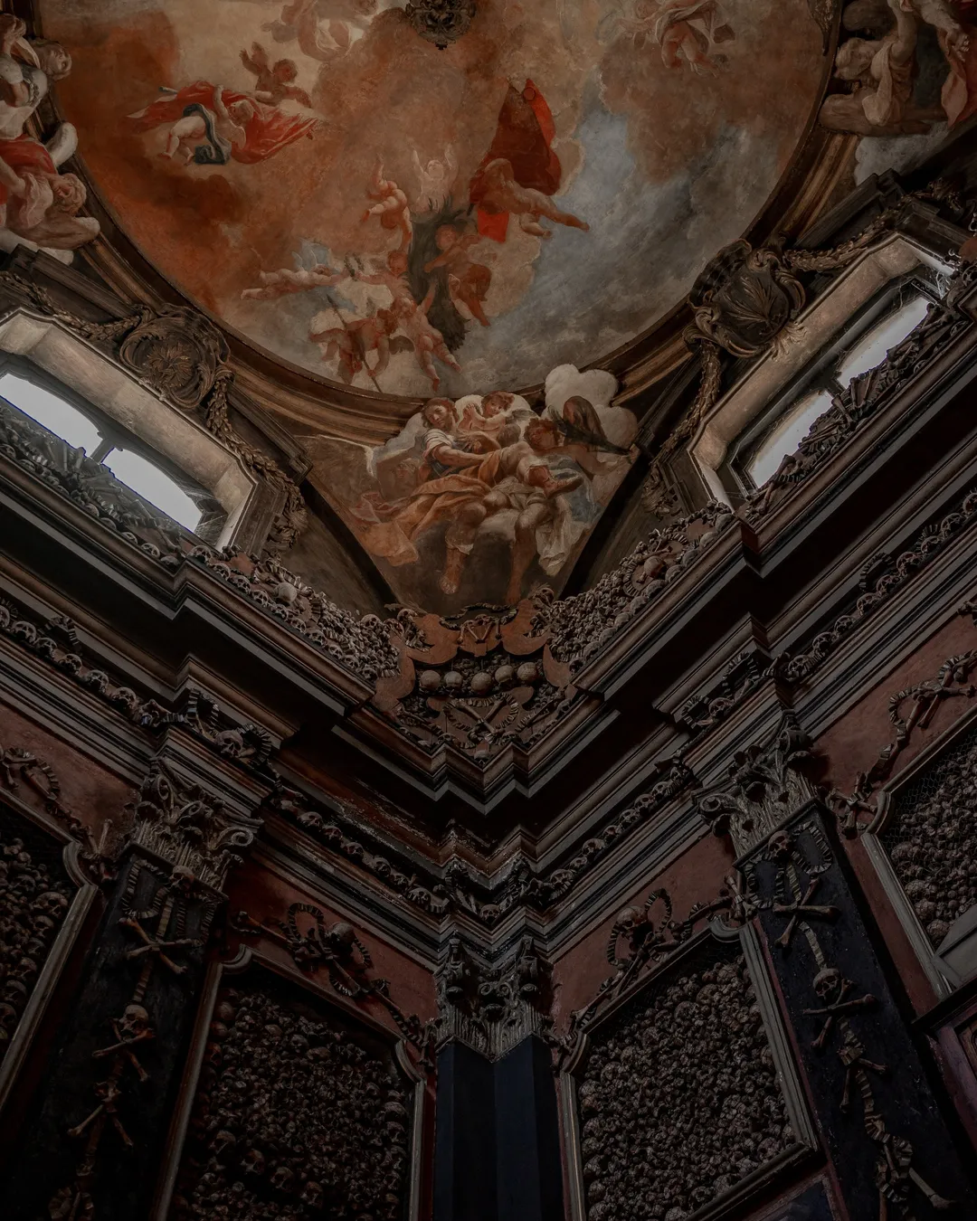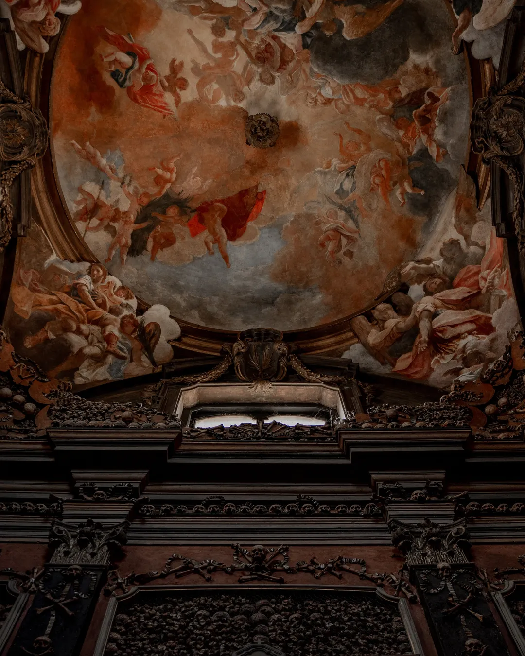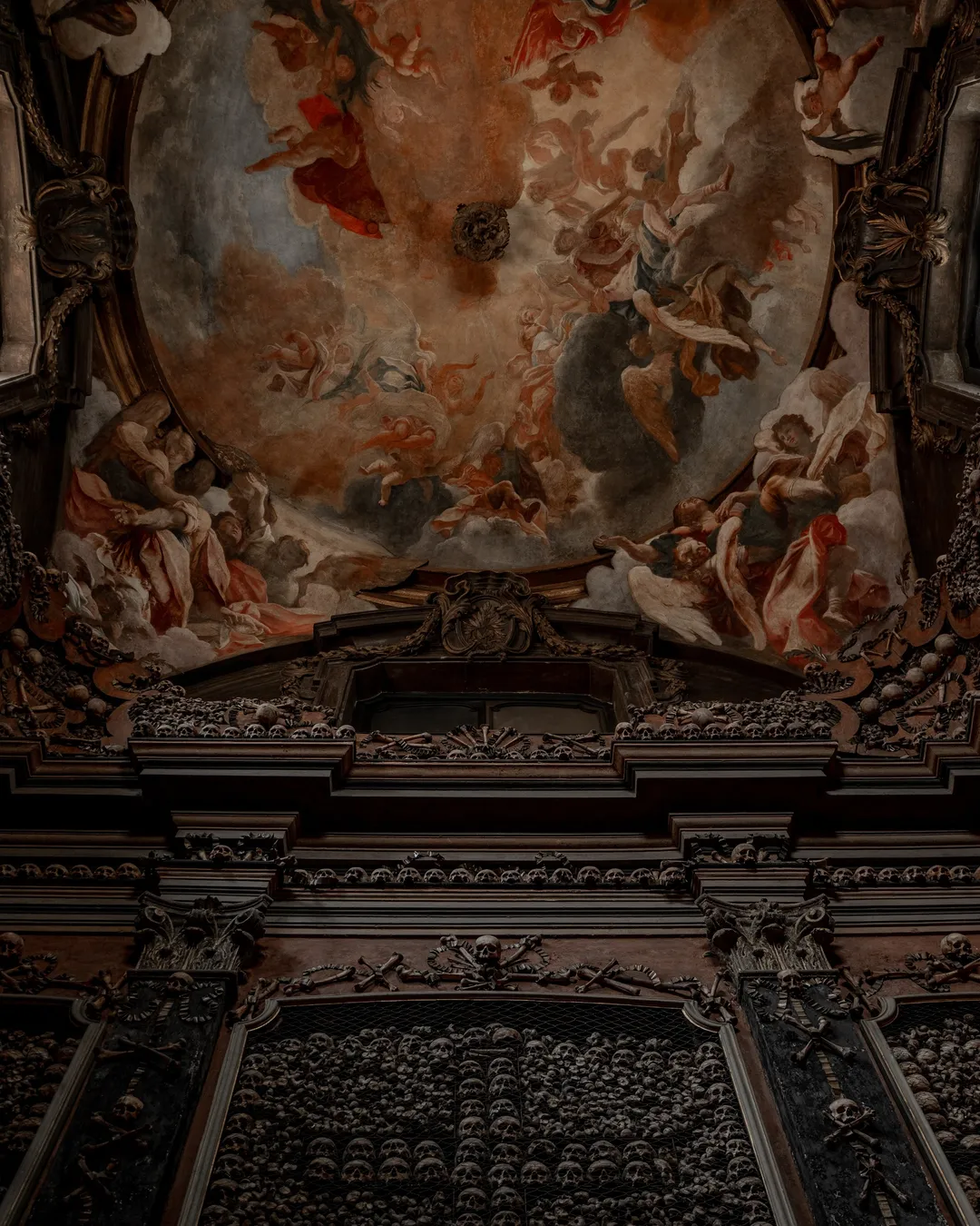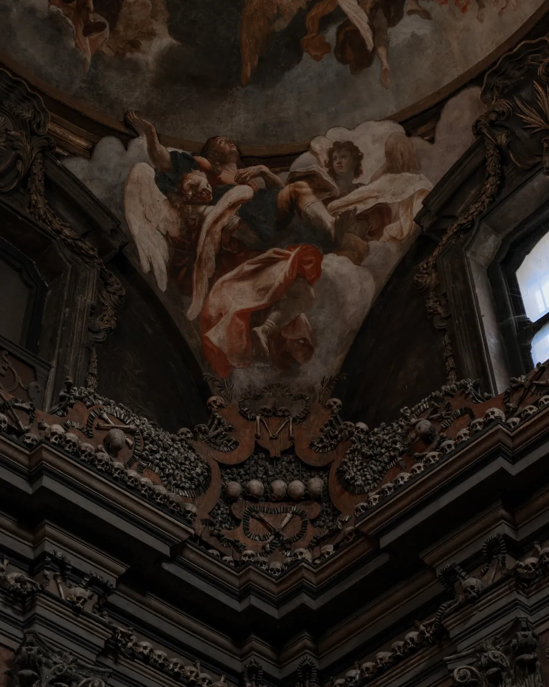 The ceiling is decorated with magnificent frescoes by the Venetian painter Sebastiano Ricci. Titled “The Triumph of Souls in a Flight of Angels” the artwork acts as a symbolic piece depicting the journey into the afterlife. The contrast between the macabre lower half of the room and the enlightening frescoes creates a rare juxtaposition and a captivating visual example of memento mori.